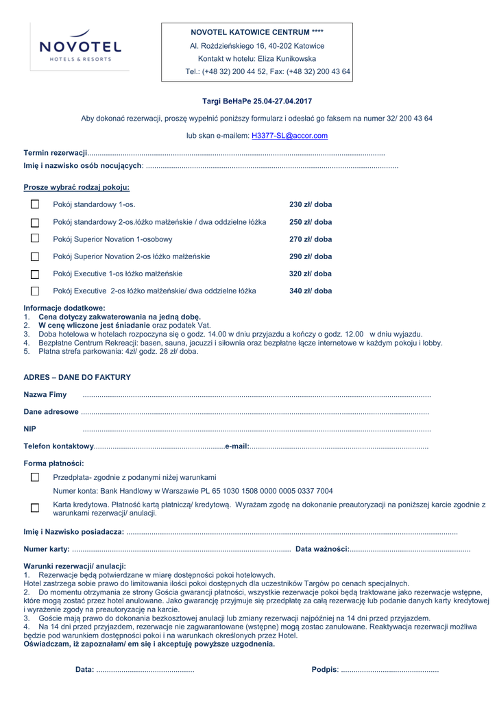 NOVOTEL KATOWICE CENTRUM **** Al. Rożdzieńskiego 16, 40-202 Katowice Kontakt w hotelu: Eliza Kunikowska Tel.: (+48 32) 200 44 52, Fax: (+48 32) 200 43 64 Targi BeHaPe 25.04-27.04.2017 Aby dokonać rezerwacji, proszę wypełnić poniższy formularz i odesłać go faksem na numer 32/ 200 43 64 lub skan e-mailem: [email protected] Termin rezerwacji............................................................................................................................................... Imię i nazwisko osób nocujących: ......................................................................................................................... Prosze wybrać rodzaj pokoju: Pokój standardowy 1-os. 230 zł/ doba Pokój standardowy 2-os.łóżko małżeńskie / dwa oddzielne łóżka 250 zł/ doba Pokój Superior Novation 1-osobowy 270 zł/ doba Pokój Superior Novation 2-os łóżko małżeńskie 290 zł/ doba Pokój Executive 1-os łóżko małżeńskie 320 zł/ doba Pokój Executive 2-os łóżko małżeńskie/ dwa oddzielne łóżka 340 zł/ doba Informacje dodatkowe: 1. Cena dotyczy zakwaterowania na jedną dobę. 2. W cenę wliczone jest śniadanie oraz podatek Vat. 3. Doba hotelowa w hotelach rozpoczyna się o godz. 14.00 w dniu przyjazdu a kończy o godz. 12.00 w dniu wyjazdu. 4. Bezpłatne Centrum Rekreacji: basen, sauna, jacuzzi i siłownia oraz bezpłatne łącze internetowe w każdym pokoju i lobby. 5. Płatna strefa parkowania: 4zł/ godz. 28 zł/ doba. ADRES – DANE DO FAKTURY Nazwa Fimy ....................................................................................................................................................................... Dane adresowe ....................................................................................................................................................................... NIP ....................................................................................................................................................................... Telefon kontaktowy...............................................................e-mail:...................................................................................... Forma płatności: Przedpłata- zgodnie z podanymi niżej warunkami Numer konta: Bank Handlowy w Warszawie PL 65 1030 1508 0000 0005 0337 7004 Karta kredytowa. Płatność kartą płatniczą/ kredytową. Wyrażam zgodę na dokonanie preautoryzacji na poniższej karcie zgodnie z warunkami rezerwacji/ anulacji. Imię i Nazwisko posiadacza: ............................................................................................................................................................... Numer karty: ......................................................................................................... Data ważności:.......................................................... Warunki rezerwacji/ anulacji: 1. Rezerwacje będą potwierdzane w miarę dostępności pokoi hotelowych. Hotel zastrzega sobie prawo do limitowania ilości pokoi dostępnych dla uczestników Targów po cenach specjalnych. 2. Do momentu otrzymania ze strony Gościa gwarancji płatności, wszystkie rezerwacje pokoi będą traktowane jako rezerwacje wstępne, które mogą zostać przez hotel anulowane. Jako gwarancję przyjmuje się przedpłatę za całą rezerwację lub podanie danych karty kredytowej i wyrażenie zgody na preautoryzację na karcie. 3. Goście mają prawo do dokonania bezkosztowej anulacji lub zmiany rezerwacji najpóźniej na 14 dni przed przyjazdem. 4. Na 14 dni przed przyjazdem, rezerwacje nie zagwarantowane (wstępne) mogą zostac zanulowane. Reaktywacja rezerwacji możliwa będzie pod warunkiem dostępności pokoi i na warunkach określonych przez Hotel. Oświadczam, iż zapoznałam/ em się i akceptuję powyższe uzgodnenia. Data: ............................................... Podpis: ...............................................