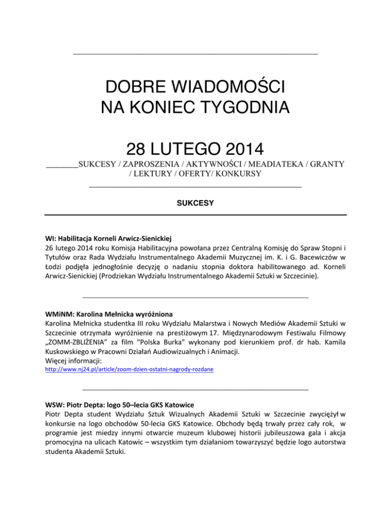 _____________________________________________________ DOBRE WIADOMOŚCI NA KONIEC TYGODNIA 28 LUTEGO 2014 _______SUKCESY / ZAPROSZENIA / AKTYWNOŚCI / MEADIATEKA / GRANTY / LEKTURY / OFERTY/ KONKURSY ______________________________________________ SUKCESY WI: Habilitacja Korneli Arwicz-‐Sienickiej 26 lutego 2014 roku Komisja Habilitacyjna powołana przez Centralną Komisję do Spraw Stopni i Tytułów oraz Rada Wydziału Instrumentalnego Akademii Muzycznej im. K. i G. Bacewiczów w Łodzi podjęła jednogłośnie decyzję o nadaniu stopnia doktora habilitowanego ad. Korneli Arwicz-‐Sienickiej (Prodziekan Wydziału Instrumentalnego Akademii Sztuki w Szczecinie). _____________________________________________________ WMiNM: Karolina Mełnicka wyróżniona Karolina Mełnicka studentka III roku Wydziału Malarstwa i Nowych Mediów Akademii Sztuki w Szczecinie otrzymała wyróżnienie na prestiżowym 17. Międzynarodowym Festiwalu Filmowy „ZOMM-‐ZBLIŻENIA” za film "Polska Burka" wykonany pod kierunkiem prof. dr hab. Kamila Kuskowskiego w Pracowni Działań Audiowizualnych i Animacji. Więcej informacji: http://www.nj24.pl/article/zoom-‐dzien-‐ostatni-‐nagrody-‐rozdane _____________________________________________________ WSW: Piotr Depta: logo 50–lecia GKS Katowice Piotr Depta student Wydziału Sztuk Wizualnych Akademii Sztuki w Szczecinie zwyciężył w konkursie na logo obchodów 50-‐lecia GKS Katowice. Obchody będą trwały przez cały rok, w programie jest miedzy innymi otwarcie muzeum klubowej historii jubileuszowa gala i akcja promocyjna na ulicach Katowic – wszystkim tym działaniom towarzyszyć będzie logo autorstwa studenta Akademii Sztuki. Więcej na ten temat: http://ekstraklasa.net/1liga/gks-katowice-swietuje-50-lecie-istnienia-co-klub-zaplanowal-narocznice,artykul.html?material_id=530b3e1180557d232b504a63#zamknij _____________________________________________________ WEM: Sylwia Fabiańczyk-‐Makuch – najlepszy dyrygent festiwalu Chór Akademii Morskiej zdobył Złoty Dyplom na VI. Międzynarodowym Festiwalu Chóralnej Muzyki Współczesnej "Canti veris" w czeskiej Pradze, a dr Sylwia Fabiańczyk-‐Makuch (wykładowczyni Akademii Sztuki w Szczecinie) otrzymała nagrodę dla najlepszego dyrygenta festiwalu. Konkurs odbywał się w dniach 20-‐23 lutego 2014 roku w kościele św. Salvatora na praskiej starówce. Chór Akademii Morskiej w Szczecinie, który w zeszłym roku obchodził jubileusz X-‐ lecia, został zakwalifikowany przez jury do finałowego koncertu. Pięćdziesięcioosobowy zespół podczas prezentacji konkursowej wykonał pięć zróżnicowanych, wymagających pod względem techniki wokalnej utworów muzyki współczesnej, w tym obowiązkowo dzieło patrona festiwalu – Zdeňka Lukáša. Międzynarodowe jury pod przewodnictwem prof. J. Kolara przyznało chórowi Złoty Dyplom oraz pierwsze miejsce w kategorii dużych chórów mieszanych. To już kolejne zagraniczne trofeum tego utytułowanego zespołu. Warto nadmienić, że Grand Prix festiwalu zdobył Chór Kameralny Konserwatorium Muzycznego w Moskwie. ZAPROSZENIA / SZCZECIN WI: Jorge Luis Valcarcel Gregorio „Rytmy Karnawału” piątek | 28 lutego 2014 | Filharmonia im. Mieczysława Karłowicza Filharmonia im. Mieczysława Karłowicza zaprasza na koncert pt.: “Rytmy Karnawału” w piątek 28 lutego 2014 roku. W czasie koncertu będzie można posłuchać śpiewu Prorektora ds. studenckich i artystycznych dra hab. Jorge Luis Valcarcel Gregorio. Wykonawcy: Orkiestra Symfoniczna Jorge Luis Valcarcel Gregorio śpiew i gitara Maciej Kazuba gitara solo Rafał Krzanowski perkusja Dyrygent: Ewa Strusińska W programie: George Gershwin – Uwertura kubańska Arturo Marquez – Danzon No. 2 Jose Pablo Moncayo – Huapango piosenki latynoamerykańskie – aranżacja Marcos Manuel Valcarcel Gregorio Więcej na ten temat: http://www.filharmonia.szczecin.pl/index.php?option=com_events&event=238&Itemid=30&lang=undefined _____________________________________________________ WSW: Platerøwka Utwór Lokatorski piątek | 28 lutego | godzina 18.00 | PLATERØWKA: ul. Emilii Plater 92 | Szczecin Natalia Szostak, absolwentka AS i autorka projektu Platerøwka, a także Ada Krawczak, studentka Akademii Sztuki zapraszają na najbliższe wydarzenie Platerøwki: Utwór Lokatorski w piątek 28 lutego 2014, o godzinie 18:00. PLATERØWKA: ul. Emilii Plater 92, Szczecin. Będzie to prezentacja podsumowująca zimowy projekt Platerøwki realizowany w ramach programu „1/1 Mistrz i Uczeń”. Organizatorzy o projekcie: Prezentacja obejmie pokaz filmu dokumentującego przebieg projektu oraz wystawę prac plastycznych stworzonych przez mieszkańców Platerøwki. Prace te zostały zainspirowane wspólnymi rozmowami na temat miejsca, w którym mieszkamy wspólnoty mieszkaniowej przy ul. Emilii Plater 92 na szczecińskim Grabowie. Więcej o projekcie: https://www.facebook.com/events/707614699289841/?fref=ts _____________________________________________________ WEM: Seminarium Wokalne piątek | 7 marca 2014 | godzina 16:00 | Sala kameralna | Zespół Szkół Muzycznych w Szczecinie Akademia Sztuki w Szczecinie zaprasza do Sali kameralnej Zespołu Szkół Muzycznych w Szczecinie na Seminarium Wokalne o tematyce "Powodzenie dzieci i młodzieży w nauce klasycznego śpiewu solowego. Aspekty kształcenia wokalnego Niemczech w kontekście polskich realiów”. Seminarium poprowadzi: dr Sylwia Burnicka – Kalischewska (Kreismusikschule UeckerRandow Ueckermünde, Akademia Sztuki w Szczecinie). W spotkaniu udział wezmą uczniowie Kreismusikschule Uecker-Randow: Sören Philipp Eberbach, Annika Viola Eberbach, Romuald Kalischewski (fortepian). W programie: wykład oraz lekcje otwarte. Seminarium skierowane jest do: nauczycieli pracujących nad śpiewem klasycznym, uczniów uczących się śpiewu solowego, osób zajmujących się śpiewem zawodowo i amatorsko, studentów wokalistyki, instruktorów zespołów wokalnych. Koordyna