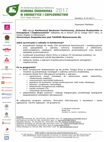 Racibórz, 8.10.2017 r. Szanowni Państwo XII edycja Konferencji Naukowo-Technicznej „Ochrona Środowiska w Energetyce i Ciepłownictwie” odbędzie się w dniach 20-21 lutego 2017 roku, w hotelu Angelo w Katowicach. Honorowym Gospodarzem jest TAURON Wytwarzanie SA. Jakie są korzyści z udziału w konferencji? • bezpośredni dostęp do około 150 dyrektorów technicznych i inwestycyjnych oraz specjalistów z zakresu ochrony środowiska z elektrowni, elektrociepłowni, ciepłowni, elektrociepłowni przemysłowych oraz dużych zakładów przemysłowych • możliwość prezentacji oferty firmy w trakcie 15 minutowej prelekcji, na stoisku wystawowym wśród decydentów z branży • zdobycie wiedzy o planach inwestycyjnych/zakupowych energetyki i ciepłownictwa. Co w programie? • bloki tematyczne dostosowane są do profilu Twojej firmy w trakcie których możliwe są prezentacje rozwiązań z zakresu ochrony środowiska, • wystawa stoisk firm oferujących produkty z zakresu: ograniczania emisji (instalacje do odsiarczania spalin, elektrofiltry, modernizacje instalacji), nowoczesnych technologii kotłowych, aparatury do pomiarów: emisja zanieczyszczeń, ilość wody chłodzącej, biomasy: urządzenia i technologie, efektywności energetycznej instalacji, handlu emisjami CO2. automatyki przemysłowej. • odpowiednio długie przerwy i kolacja integracyjna umożliwiają nawiązanie bezpośrednich kontaktów biznesowych. W załączeniu program ramowy, formularz informacyjny z cennikiem i karta zgłoszenia. Termin zgłoszeń: 16 grudnia br. Z wyrazami szacunku Beata Fas dyrektor ds. handlu i marketingu Kontakt: Małgorzata Pozimska, tel. 792 679 044, 32/4152921 wew. 36, [email protected] Ewa Zygmunt, tel. 606 337 384, 32/4153317 wew. 17, [email protected] Magdalena Kozicka, tel. 602 694 574, 32/4153317 wew.38, [email protected] Magdalena Widrińska, tel. 602 601 089, 32/4153317 wew. 29, [email protected] Beata Fas, tel. 694 848 853, 32/4153317 wew.33, [email protected] Jolanta Mikołajec tel. 602 601 089, 32/4153317 wew. 22, [email protected] FORMULARZ INFORMACYJNY I. Partner główny – oferta obejmuje: 1. Przyznanie tytułu partnera głównego konferencji „Ochrona Środowiska w Energetyce i Ciepłownictwie”. 2. Prezentację firmy do 15 min. 3. Pokrycie kosztów udziału dla 3 osób z firmy (wyżywienie, materiały konferencyjne, zakwaterowanie 1 doba). 4. Wyeksponowanie na zaproszeniach, plakatach, transparentach i pismach oraz w obiektach, w których będzie przebiegać impreza, nazwy firmy i logo jako partnera głównego konferencji. 5. Eksponowanie firmy podczas całej imprezy: wybór miejsca w hali wystawienniczej, prezentacja w atrakcyjnym miejscu programu. 6. Możliwość wystawienia rollupu na sali konferencyjnej. 7. Udostępnienie powierzchni wystawienniczej do 10 m2 (zabudowa własna firmy). 8. Reklama A4 w miesięczniku „Energetyka Cieplna i Zawodowa” nr 1/2017. 9. Zamieszczenie informacji o firmie w materiałach konferencyjnych (1 strona, wersja czarno-biała). 10. Skierowanie imiennych zaproszeń z logo firmy do przedstawicieli zakładów z branży. 11. Baner główny na stronie www.kierunekenergetyka.pl przez 1 miesiąc. Koszt promocji: 20 000 zł II. Partner – oferta obejmuje: 1. Przyznanie tytułu partnera konferencji „Ochrona Środowiska w Energetyce i Ciepłownictwie”. 2. Prezentację firmy do 15 min. 3. Pokrycie kosztów udziału dla 2 osób z firmy (wyżywienie, materiały, zakwaterowanie 1 doba). 4. Wyeksponowanie na zaproszeniach, plakatach, transparentach i pismach oraz w obiektach, w których będzie przebiegać impreza, nazwy firmy i logo jako partnera konferencji. 5. Eksponowanie firmy podczas całej imprezy: wybór miejsca w hali wystawienniczej, prezentacja w atrakcyjnym miejscu programu. 6. Możliwość wystawienia rollupu na sali konferencyjnej. 7. Udostępnienie powierzchni wystawienniczej do 6 m2 (zabudowa własna firmy). 8. Reklama A4 w miesięczniku „Energetyka Cieplna i Zawodowa” nr 1/2017. 9. Zamieszczenie informacji o firmie w materiałach konferencyjnych (1 strona, wersja czarno-biała). 10. Skierowanie imiennych zaproszeń z logo firmy do przedstawicieli zakładów z branży. 11. Baner główny na stronie www.kierunekenergetyka.pl przez 1miesiąc. Koszt promocji: 17 000 zł III. Inne formy promocji: a) PAKIET I (stoisko + prezentacja + reklama): 1. Powierzchnia wystawiennicza 2 m2 (zabudowa własna). 2. Prezentacja firmy do 15 min. 3. Reklama formatu A4 w magazynie „Energetyka Cieplna i Zawodowa” nr 1/2017. 4. Zamieszczenie informacji o firmie w materiałach konferencyjnych (1 strona, wersja czarno-biała). 5. Baner środkowy na stronie www.kierunekenergetyka.pl przez 1miesiąc. Koszt: 8 500 zł b) 1. 2. 3. 4. PAKIET II (prezentacja + reklama): Prezentacja firmy do 15 min. Zamieszczenie informacji o firmie w materiałach konferencyjnych (1 strona, wersja czarno-biała). Reklama formatu A4 w magazynie „Energetyka Cieplna i Zawodowa” nr 1/2017. Baner środkowy na stronie www.kierunekenergetyka.pl przez 1miesiąc. Koszt: 6 700 zł c) 1. 2. 3. PAKIET III (prezentacja): Prezentacja firmy do 15 min. Zamieszczenie informacji o firmie w materiałach konferencyjnych (1 strona, wersja czarno-biała). Baner środkowy na stronie www.kierunekenergetyka.pl przez 1miesiąc. Koszt: 4 800 zł d) 1. 2. 3. 4. PAKIET IV (stoisko + reklama): Powierzchnia wystawiennicza 2 m2 (zabudowa własna). Reklama formatu A4 w magazynie „Energetyka Cieplna i Zawodowa” nr 1/2017. Zamieszczenie informacji o firmie w materiałach konferencyjnych (1 strona, wersja czarno-biała). Baner środkowy na stronie www.kierunekenergetyka.pl przez 1miesiąc. Koszt: 4 800 zł e) PAKIET V (stoisko): 1. Powierzchnia wystawiennicza 2 m2 (zabudowa własna). 2. Zamieszczenie informacji o firmie w materiałach konferencyjnych (1 strona, wersja czarno-biała). 3. Baner środkowy na stronie www.kierunekenergetyka.pl przez 1miesiąc. Koszt: 2 800 zł IV. Promocja w materi