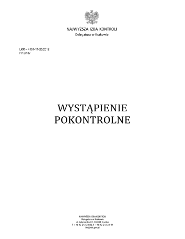 LKR – 4101-17-20/2012 P/12/137 WYSTĄPIENIE POKONTROLNE I. Dane identyfikacyjne kontroli Numer i tytuł kontroli P/12/137 – Realizacja przepisów ustawy o ochronie zdrowia przed następstwami używania tytoniu i wyrobów tytoniowych Jednostka przeprowadzająca kontrolę Najwyższa Izba Kontroli Delegatura w Krakowie Kontroler Marta Pankowska specjalista kontroli państwowej, upoważnienie do kontroli nr 83782 z dnia 9 listopada 2012 r. (dowód: akta kontroli str. 1 – 2) Jednostka Kontrolowana Krakowska Akademia im. Andrzeja Frycza Modrzewskiego, ul. G. Herlinga-Grudzińskiego 1, 30-705 Kraków Kierownik jednostki kontrolowanej Prof. dr hab. Jerzy Malec, Rektor Krakowskiej Akademii im. Andrzeja Frycza Modrzewskiego II. Ocena kontrolowanej działalności Ocena ogólna Uzasadnienie oceny ogólnej Najwyższa Izba Kontroli ocenia pozytywnie1 działalność Krakowskiej Akademii im. Andrzeja Frycza Modrzewskiego (dalej Uczelnia) w zakresie przestrzegania zakazu palenia wyrobów tytoniowych w wybranych obiektach użyteczności publicznej i realizacji niektórych obowiązków z tym związanych. W kontrolowanej jednostce przestrzegano wymogów ustawy o ochronie zdrowia przed następstwami używania tytoniu i wyrobów tytoniowych2 (dalej zwaną ustawą antynikotynową). Stosownie do przepisów art. 5 ust. 1a ustawy antynikotynowej, na wszystkich wejściach na ogrodzony teren Uczelni oraz na wejściu głównym do Budynku A umieszczono w widocznym miejscu odpowiednie oznaczenia słowne i graficzne informujące o zakazie palenia wyrobów tytoniowych. Na wejściach głównych do Budynków B (jedno weście) i C (dwa wejścia) nie umieszczono oznaczeń informujących o zakazie palenia. Oznaczenia te zostały umieszczone wewnątrz budynków przy wejściach. W poddanych kontroli pomieszczeniach przestrzegany był zakaz palenia, o którym mowa w art. 5 ust. 1 ww. ustawy. III. Opis ustalonego stanu faktycznego 1. Ocena przestrzegania zakazu palenia w obiektach 1.1. Opis stanu faktycznego Oznakowanie obiektów Kampus Uczelni jest ogrodzony i składa się z trzech budynków, tj. Budynku A, Budynku B oraz Budynku C. Budynki A i C są połączone łącznikiem na poziomie I piętra. Budynek C składa się z dwóch części posiadających odrębne wejścia: części hotelowej, w której mieści się również Dział Rekrutacji oraz z części dydaktycznej. W dniu 13 listopada 2012 r. przeprowadzono oględziny we wszystkich trzech budynkach, obejmujące 24 pomieszczenia (m.in. Rektorat, dziekanat Wydziału Zdrowia i Nauk Medycznych, pomieszczenie samorządu studenckiego, toalety, sale wykładowe, archiwum, pomieszczenia Działu Rekrutacji i Rachunkowości). W odniesieniu do każdego budynku oględzinom poddano również wejścia do budynków oraz ciągi komunikacyjne, tj. korytarze. 1 2 Najwyższa Izba Kontroli stosuje 3-stopniową skalę ocen: pozytywna, pozytywna mimo stwierdzonych nieprawidłowości, negatywna. Ustawa z dnia 9 listopada 1995 r. o ochronie zdrowia przed następstwami używania tytoniu i wyrobów tytoniowych (Dz. U. z 1996 r. Nr 10, poz. 55 ze zm.). 2 W dniu 23 listopada 2012 r. przeprowadzono dodatkowe oględziny wejść na ogrodzony teren Uczelni (4 wejścia dla pieszych i 1 wjazd dla samochodów). W wyniku dokonanych w dniu 13 listopada 2012 r. oględzin ustalono, że na wejściu głównym do Budynku A umieszczono w widocznym miejscu odpowiednie oznaczenia słowne i graficzne informujące o zakazie palenia wyrobów tytoniowych. Na wejściach głównych do Budynków B i C nie umieszczono tego rodzaju oznaczeń. Oznaczenia te zostały umieszczone wewnątrz budynków przy wejściach, tj.: w Budynku B na portierni, znajdującej się przy wejściu głównym, po lewej stronie; w Budynku C w Dziale Rekrutacji znajdującym się przy wejściu (wejście do części hotelowej) oraz w holu na parterze przy windach (wejście do części dydaktycznej). Oznaczenia te były widoczne dla osób, które weszły do tych budynków. (dowód: akta kontroli str. 3 – 6) W innych poddanych oględzinom pomieszczeniach oraz na wszystkich wejściach na ogrodzony teren Uczelni znajdowały się widoczne oznaczenia informujące o zakazie palenia (słowne i graficzne lub graficzne). (dowód: akta kontroli str. 3 – 6) Rektor Uczelni prof. dr hab. Jerzy Malec wskazał w wyjaśnieniach, że na wejściu głównym do Budynku B oraz dwóch wejściach do Budynku C nie umieszczono oznaczeń słownych i graficznych informujących o zakazie palenia, gdyż oznaczenia takie umieszczone są w miejscach widocznych, tuż przy wejściach do tych budynków, zgodnie z art. 5 ust. 1a ustawy antynikotynowej. W opinii Rektora Uczelni wymóg ustawowy został spełniony. Zapewnił on jednak, że oznaczenia zostaną umieszczone na wejściu głównym do Budynku B oraz na dwóch wejściach do Budynku C. (dowód: akta kontroli str. 9 – 13) Ustalone nieprawidłowości W działalności kontrolowanej jednostki w przedstawionym wyżej zakresie nie stwierdzono nieprawidłowości. 1.2. Spełnianie wymogów ustawowych przez wyznaczone na terenie obiektów jednostki palarnie Opis stanu faktycznego W budynkach Kampusu Uczelni nie wyznaczono palarni, natomiast miejsca, w których można palić wyznaczono na zewnątrz budynków. (dowód: akta kontroli str. 3 – 6, 9 – 14) Ustalone nieprawidłowości W działalności kontrolowanej jednostki w przedstawionym wyżej zakresie nie stwierdzono nieprawidłowości. 1.3. Opis stanu faktycznego Przestrzeganie zakazu palenia na terenie jednostki W poddanych oględzinom w dniu 13 listopada 2012 r. pomieszczeniach i obiektach przestrzega się zakazu palenia, o którym mowa w art. 5 ust. 1 ustawy antynikotynowej. (dowód: akta kontroli str. 3 – 6) W trakcie oględzin stwierdzono, że na zewnątrz przed wejściem do Budynków A, B, C umieszczono popielniczki i w tych miejscach studenci palili papierosy. W jednym miejscu, przy Budynku A znajdowało się graficzne oznaczenie informujące o pozwoleniu na palenie w 
