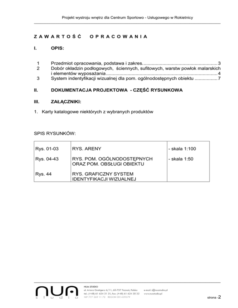 Projekt wystroju wnętrz dla Centrum Sportowo - Usługowego w Rokietnicy ____________________________________________________________________________________ Z AW AR T O Ś Ć I. O P R AC O W AN I A OPIS: 1 2 3 Przedmiot opracowania, podstawa i zakres. ....................................................... 3 Dobór okładzin podłogowych, ściennych, sufitowych, warstw powłok malarskich i elementów wyposażania ................................................................................... 4 System indentyfikacji wizualnej dla pom. ogólnodostępnych obiektu ................. 7 II. DOKUMENTACJA PROJEKTOWA - CZĘŚĆ RYSUNKOWA III. ZAŁĄCZNIKI: 1. Karty katalogowe niektórych z wybranych produktów SPIS RYSUNKÓW: Rys. 01-03 RYS. ARENY - skala 1:100 Rys. 04-43 RYS. POM. OGÓLNODOSTĘPNYCH ORAZ POM. OBSŁUGI OBIEKTU - skala 1:50 Rys. 44 RYS. GRAFICZNY SYSTEM IDENTYFIKACJI WIZUALNEJ ____________________________________________________________________________________ strona -2 Projekt wystroju wnętrz dla Centrum Sportowo - Usługowego w Rokietnicy ____________________________________________________________________________________ I . P r o j e k t w ys t r o j u w n ę t r z - O p i s 1. Przedmiot opracowania, podstawa i zakres 1.1. Przedmiotem opracowania jest projekt wystroju wnętrz sporządzony do sporządzanego równolegle opracowania dokumentacji aneksu do Projektu Wykonawczego dla Inwestycji budowy Centrum Sportowo - Usługowego w Rokietnicy. Inwestor: Rokietnicki Ośrodek Sportu 1.2. Podstawa opracowania - Wizja lokalna Podkłady architektoniczno budowlane aneksu do projektu wykonawczego Projekty branżowe Normy i przepisy budowlane Uzgodnienia projektowe z projektantem sporządzającym aneks do projektu Wykonawczego oraz z projektantami branżowymi. 1.3. Zakres opracowania Opracowanie obejmuje projekt w zakresie wystroju wnętrz, doboru urządzeń wyposażenia stałego oraz wytyczne instalacyjne dla montażu opraw oświetleniowych. Jest uzupełnieniem dla projektów architektoniczno - budowlanych sporządzonych dla przedmiotowej inwestycji. Określa system wzorniczy identyfikacji wizualnej dla poszczególnych funkcji zlokalizowanych w obiekcie. Obiekt jest realizowany dwu stopniowo: 1. funkcje publiczne - hole, arena sportowa, szatnie, pomieszczenia obsługi, etc. 2. pomieszczenia pod wynajem. Zakres opracowania dotyczy części 1 -publicznej, pozostałe pomieszczenia, część 2, jest przewidywana do pozostawienia w tak zwanym wykończeniu developerskim. ____________________________________________________________________________________ strona -3 Projekt wystroju wnętrz dla Centrum Sportowo - Usługowego w Rokietnicy ____________________________________________________________________________________ 2. Dobór okładzin podłogowych, ściennych, sufitowych, warstw powłok malarskich i elementów wyposażania 2.1. Okładziny podłogowe Przestrzenie ogólnodostępne Dla głównych przestrzeni użytkowych takich jak hole, szatnie, toalety, kawiarnie, projekt przewiduje zastosowanie gresu porcellanato nieszkliwionego Marki Nowa Gala serii Concept. w odcieniach CN12 i CN13 wykończeniu naturalnym (niepolerowany). Wymiary dobranego asortymentu zaznaczono na rysunkach i zawierają formaty 30x30cm (w szatniach) oraz 60x60cm (w toaletach i holach wejściowych). Arena Posadzka areny przewiduje się wykonaną w nawierzchni sportowej wg. projektu architektonicznego wykonawczego. Pomieszczenia szatni trenerskich, pierwszej pomocy oraz śluz korytarzowych (korytarze obuwia czystego) Podłoga winylowa np.Tarkett Micra Premium kolor beżowo-szary nr 3110606 wykonana zgodnie z instrukcją producenta. Pomieszczenia szatni trenerskich w części sanitarnej Przewiduje się zastosowanie gresu porcellanato nieszkliwionego Marki Nowa Gala serii Concept. w odcieniach CN12 w wykończeniu naturalnym (niepolerowany). Wymiary dobranego asortymentu zaznaczono na rysunkach i zawierają format 30x30cm Biura obsługi Wykładzina tzw. dywanowa producent ITC Solid wzór 90 Pomieszczenie operatora obiektu i sterowania elektryczna Przewiduje się wykonaną wg. projektu architektoniczno budowlanego w wykładzinie PCV kolor szary. Magazyn środków higienicznych, pomszczenie sprzątaczek, pomieszczenie konserwatora, magazyn podręczny. ____________________________________________________________________________________ strona -4 Projekt wystroju wnętrz dla Centrum Sportowo - Usługowego w Rokietnicy ____________________________________________________________________________________ Posadzka granitogresowa, Tubądzin P-Tartan 11 Zaplecze bufetu Płytka podłogowa 20x20 kolor szary [np. markii Tubodzin Seria Pastele - P-mono G25 Klatki schodowe Nastopnie i podstopnice wykonać z granitu naturalnego (niepolerowanego) w kolorze popielatym. Ostateczny wybór zatwierdzić u projektanta na etapie nadzoru. 2.2. Okładziny ścienne Przestrzenie ogólnodostępne Dla głównych przestrzeni użytkowych takich jak hole, szatnie, toalety, kawiarnie, projekt przewiduje zastosowanie gresu porcellanato nieszkliwionego Marki Nowa Gala serii Concept. w odcieniach CN12 i CN13 w wykończeniu naturalnym (niepolerowany). Wymiary dobranego asortymentu zaznaczono na rysunkach i zawierają formaty 30x30cm (w szatniach), 30x60cm (częściowo w toaletach) oraz 60x60cm (częściowo w toaletach i holach wejściowych). Arena Okładziny ścian areny do wysokości 375 cm wykonane z korka naturalnego jako powłoka akustyczna, powyżej w pasie kondygnacyjnym zastosowano listwę szerokości 37 cm z aluminium anodowanego. W poziomie II kondygnacji zastosowano powłokę malarską wg. kolorystki oznaczonej na rysunkach. Ponadto w przestrzeni galerii widowni projektuje sie balustradę systemową wykonaną ze szkła bezpiecznego o parametrach pozwalających na bezpieczne zastosowanie w tego typu obiektach. Zamienienie dopuszcza się zastosowanie balustrad systemowych ze stali malowanych proszkowo, ewentualne zamienniki uzgodnić z projektantem n