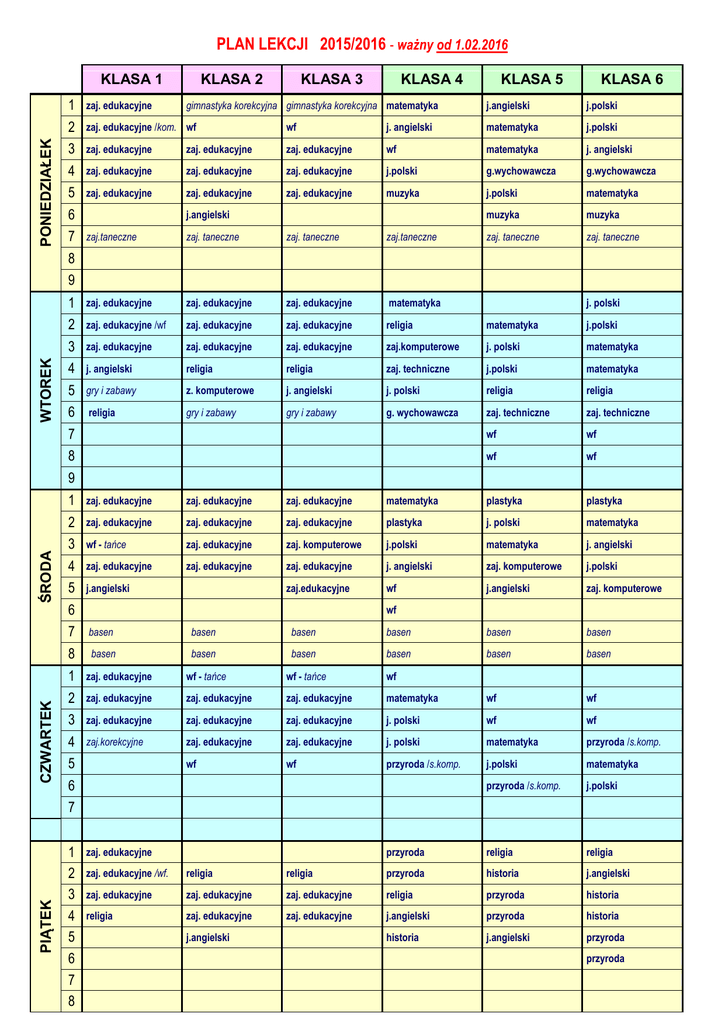 PLAN LEKCJI 2015/2016 - ważny od 1.02.2016 PIĄTEK CZWARTEK ŚRODA WTOREK PONIEDZIAŁEK KLASA 1 KLASA 2 KLASA 3 KLASA 4 KLASA 5 KLASA 6 1 2 3 4 5 6 7 8 9 zaj. edukacyjne zaj.taneczne zaj. taneczne zaj. taneczne zaj.taneczne 1 zaj. edukacyjne zaj. edukacyjne zaj. edukacyjne matematyka 2 3 4 5 zaj. edukacyjne /wf zaj. edukacyjne zaj. edukacyjne religia matematyka j.polski zaj. edukacyjne zaj. edukacyjne zaj. edukacyjne zaj.komputerowe j. polski matematyka j. angielski religia religia zaj. techniczne j.polski matematyka gry i zabawy z. komputerowe j. angielski j. polski religia religia 6 7 8 9 religia gry i zabawy gry i zabawy g. wychowawcza zaj. techniczne zaj. techniczne wf wf wf wf 1 zaj. edukacyjne zaj. edukacyjne zaj. edukacyjne matematyka plastyka plastyka 2 3 4 5 6 7 8 zaj. edukacyjne zaj. edukacyjne zaj. edukacyjne plastyka j. polski matematyka wf - tańce zaj. edukacyjne zaj. komputerowe j.polski matematyka j. angielski zaj. edukacyjne zaj. edukacyjne zaj. edukacyjne j. angielski zaj. komputerowe j.polski zaj.edukacyjne wf j.angielski zaj. komputerowe 1 2 3 gimnastyka korekcyjna gimnastyka korekcyjna matematyka j.angielski j.polski zaj. edukacyjne /kom. wf wf j. angielski matematyka j.polski zaj. edukacyjne zaj. edukacyjne zaj. edukacyjne wf matematyka j. angielski zaj. edukacyjne zaj. edukacyjne zaj. edukacyjne j.polski g.wychowawcza g.wychowawcza zaj. edukacyjne zaj. edukacyjne zaj. edukacyjne muzyka j.polski matematyka muzyka muzyka zaj. taneczne zaj. taneczne j.angielski j.angielski j. polski wf basen basen basen basen basen basen basen basen basen basen basen basen zaj. edukacyjne wf - tańce wf - tańce wf zaj. edukacyjne zaj. edukacyjne zaj. edukacyjne matematyka wf wf zaj. edukacyjne zaj. edukacyjne zaj. edukacyjne j. polski wf wf 4 5 6 7 zaj.korekcyjne zaj. edukacyjne zaj. edukacyjne j. polski matematyka przyroda /s.komp. wf wf przyroda /s.komp. j.polski matematyka przyroda /s.komp. j.polski 1 2 3 4 5 6 7 8 zaj. edukacyjne przyroda religia religia zaj. edukacyjne /wf. religia religia przyroda historia j.angielski zaj. edukacyjne zaj. edukacyjne zaj. edukacyjne religia przyroda historia religia zaj. edukacyjne zaj. edukacyjne j.angielski przyroda historia historia j.angielski przyroda j.angielski przyroda