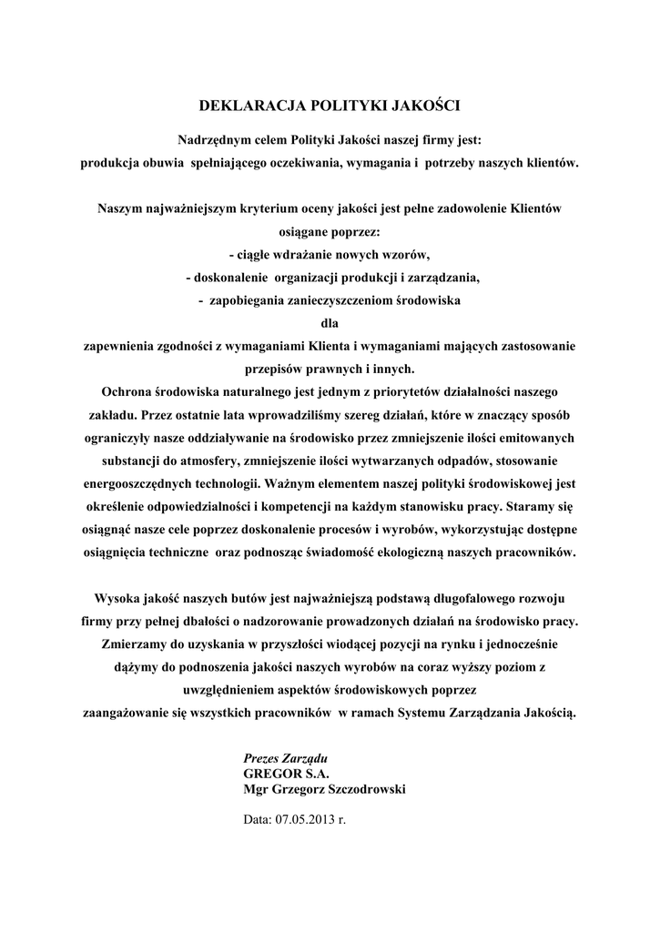 DEKLARACJA POLITYKI JAKOŚCI Nadrzędnym celem Polityki Jakości naszej firmy jest: produkcja obuwia spełniającego oczekiwania, wymagania i potrzeby naszych klientów. Naszym najważniejszym kryterium oceny jakości jest pełne zadowolenie Klientów osiągane poprzez: - ciągłe wdrażanie nowych wzorów, - doskonalenie organizacji produkcji i zarządzania, - zapobiegania zanieczyszczeniom środowiska dla zapewnienia zgodności z wymaganiami Klienta i wymaganiami mających zastosowanie przepisów prawnych i innych. Ochrona środowiska naturalnego jest jednym z priorytetów działalności naszego zakładu. Przez ostatnie lata wprowadziliśmy szereg działań, które w znaczący sposób ograniczyły nasze oddziaływanie na środowisko przez zmniejszenie ilości emitowanych substancji do atmosfery, zmniejszenie ilości wytwarzanych odpadów, stosowanie energooszczędnych technologii. Ważnym elementem naszej polityki środowiskowej jest określenie odpowiedzialności i kompetencji na każdym stanowisku pracy. Staramy się osiągnąć nasze cele poprzez doskonalenie procesów i wyrobów, wykorzystując dostępne osiągnięcia techniczne oraz podnosząc świadomość ekologiczną naszych pracowników. Wysoka jakość naszych butów jest najważniejszą podstawą długofalowego rozwoju firmy przy pełnej dbałości o nadzorowanie prowadzonych działań na środowisko pracy. Zmierzamy do uzyskania w przyszłości wiodącej pozycji na rynku i jednocześnie dążymy do podnoszenia jakości naszych wyrobów na coraz wyższy poziom z uwzględnieniem aspektów środowiskowych poprzez zaangażowanie się wszystkich pracowników w ramach Systemu Zarządzania Jakością. Prezes Zarządu GREGOR S.A. Mgr Grzegorz Szczodrowski Data: 07.05.2013 r.