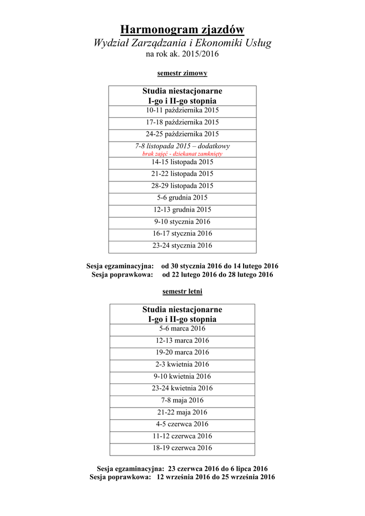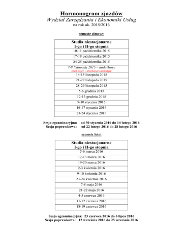 Harmonogram zjazdów Wydział Zarządzania i Ekonomiki Usług na rok ak. 2015/2016 semestr zimowy Studia niestacjonarne I-go i II-go stopnia 10-11 października 2015 17-18 października 2015 24-25 października 2015 7-8 listopada 2015 – dodatkowy brak zajęć - dziekanat zamknięty 14-15 listopada 2015 21-22 listopada 2015 28-29 listopada 2015 5-6 grudnia 2015 12-13 grudnia 2015 9-10 stycznia 2016 16-17 stycznia 2016 23-24 stycznia 2016 Sesja egzaminacyjna: Sesja poprawkowa: od 30 stycznia 2016 do 14 lutego 2016 od 22 lutego 2016 do 28 lutego 2016 semestr letni Studia niestacjonarne I-go i II-go stopnia 5-6 marca 2016 12-13 marca 2016 19-20 marca 2016 2-3 kwietnia 2016 9-10 kwietnia 2016 23-24 kwietnia 2016 7-8 maja 2016 21-22 maja 2016 4-5 czerwca 2016 11-12 czerwca 2016 18-19 czerwca 2016 Sesja egzaminacyjna: 23 czerwca 2016 do 6 lipca 2016 Sesja poprawkowa: 12 września 2016 do 25 września 2016