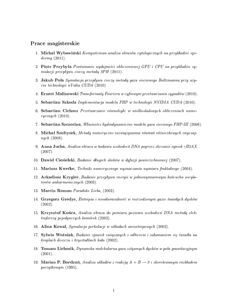 Prace magisterskie 1. Michal Wybawi«ski Komputerowa analiza obrazów cytologicznych na przykªadzie epi- dermy (2011). 2. Piotr Przybyªa Porównanie wydajno±ci obliczeniowej GPU i CPU na przykªadzie sy- mulacji przepªywu cieczy metod¡ SPH (2011). 3. Jakub Poªa Symulacja przepªywu cieczy metod¡ gazu sieciowego Boltzmanna przy u»y- ciu technologii nVidia CUDA (2010) 4. Ernest Malinowski Transformaty Fouriera w cyfrowym przetwarzaniu sygnaªów (2010). 5. Sebastian Szkoda Implementacja modelu FHP w technologii NVIDIA CUDA (2010). 6. Sebastian Cichosz Przetwarzanie równolegªe w wielkoskalowych obliczeniach nume- rycznych (2010). 7. Sebastian Szczecina, Wªasno±ci hydrodynamiczne modelu gazu sieciowgo FHP-III (2008). 8. Michaª Szoªtysek, Metody numeryczne rozwi¡zywania równa« ró»niczkowych zwyczaj- nych (2008). 9. Anna Jucha, Analiza obrazu w badaniu uszkodze« DNA poprzez zliczanie ognisk γ H2AX (2007). 10. Dawid Ciesielski, Badanie dªugich skoków w dyfuzji powierzchniowej (2007). 11. Mariusz Kwe¢ke, Techniki numerycznego wyznaczania wymiaru fraktalnego (2004). 12. Arkadiusz Krygier, Badanie przepªywu energii w jednowymiarowym ªa«cuchu oscyla- torów anharmonicznych (2003). 13. Marcin Roman Paradoks Lieba, (2003). 14. Grzegorz Gredys, Entropia i nieodwracalno±¢ w rozrzedzonym gazie twardych dysków (2002). 15. Krzysztof Ko«ca, Analiza obrazu do pomiaru poziomu uszkodze« DNA metod¡ elek- troforezy pojedynczych komórek (2002). 16. Alina Kowal, Symulacja perkolacji w ukªadach anizotropowych (2002). 17. Sylwia Wo¹niak, Badanie zjawisk zwi¡zanych z odbiciem i zaªamaniem si¦ ±wiatªa na kroplach deszczu i krysztaªkach lodu (2002). 18. Tomasz Lichosik, Dynamika molekularna gazu sztywnych dysków w polu grawitacyjnym (2001). 19. Marian P. Bordza«, Analiza ukªadów z reakcj¡ A pocz¡tkowym (1995). 1 + B → 0 i skorelowanym rozkªadem Licencjaty 1. Anna Jucha, Termostat Nosego-Hoovera w prostym ukªadzie hamiltonowskim, (2005). 2. Bartosz Dobrzycki, Komputerowy model konwekcji (atmosferycznej) swobodnej powie- trza, (2004). 3. Marcin Krystek, Rozwi¡zywanie modelu Isinga metod¡ Creutza, (2004). 4. Krzysztof Olszewski, Numeryczne rozwi¡zywanie równa« ró»niczkowych zwyczajnych za pomoc¡ biblioteki GSL na przykªadzie ukªadu sªonecznego, (2004). 5. Mariusz Lupa, Generowanie liczb pseudolosowych za pomoc¡ biblioteki GSL, (2004). 6. Marek Ku¹micki, Zastosowanie metody wy»arzania komputerowego w problemie komi- woja»era, (2003). 7. Jarosªaw Jaworski, Analiza ukªadów dyfuzyjnych typu A 2 + B → 0, (2001).