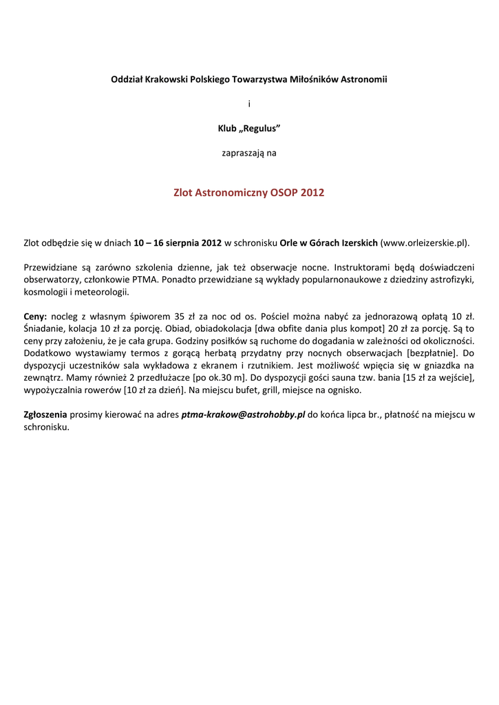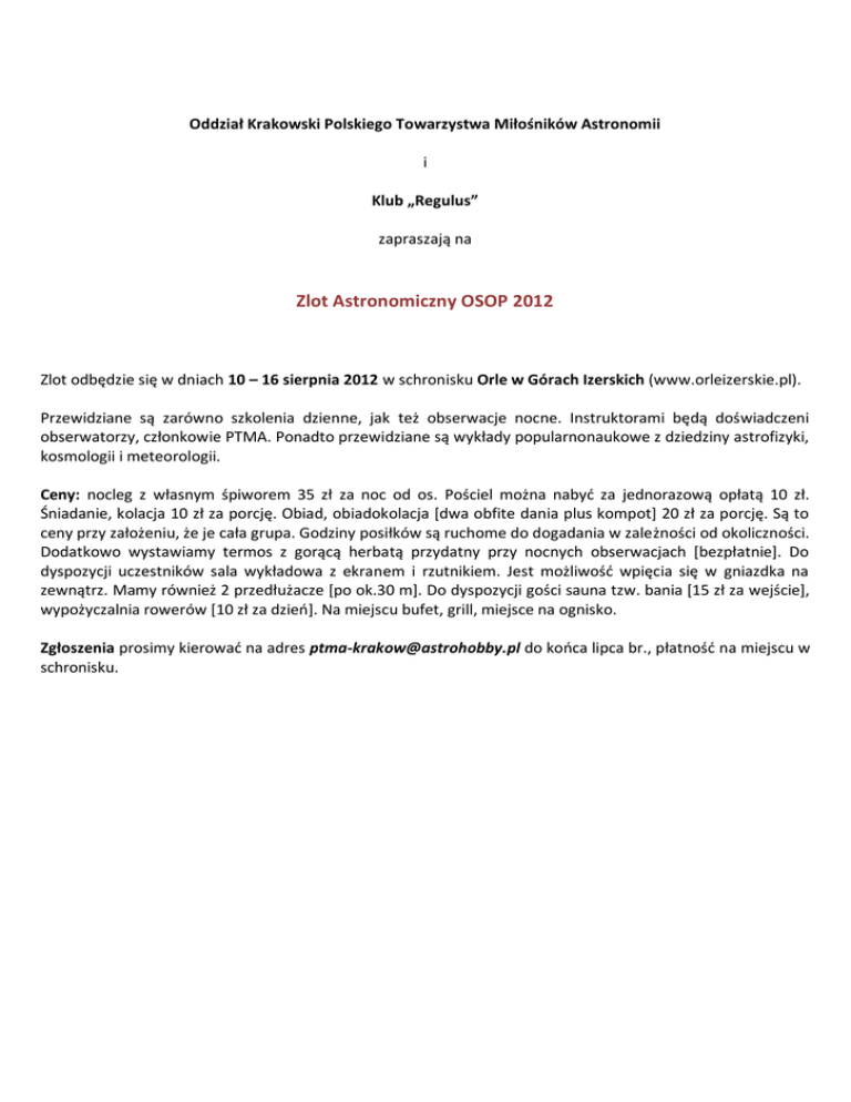 Oddział Krakowski Polskiego Towarzystwa Miłośników Astronomii i Klub „Regulus” zapraszają na Zlot Astronomiczny OSOP 2012 Zlot odbędzie się w dniach 10 – 16 sierpnia 2012 w schronisku Orle w Górach Izerskich (www.orleizerskie.pl). Przewidziane są zarówno szkolenia dzienne, jak też obserwacje nocne. Instruktorami będą doświadczeni obserwatorzy, członkowie PTMA. Ponadto przewidziane są wykłady popularnonaukowe z dziedziny astrofizyki, kosmologii i meteorologii. Ceny: nocleg z własnym śpiworem 35 zł za noc od os. Pościel można nabyć za jednorazową opłatą 10 zł. Śniadanie, kolacja 10 zł za porcję. Obiad, obiadokolacja [dwa obfite dania plus kompot] 20 zł za porcję. Są to ceny przy założeniu, że je cała grupa. Godziny posiłków są ruchome do dogadania w zależności od okoliczności. Dodatkowo wystawiamy termos z gorącą herbatą przydatny przy nocnych obserwacjach [bezpłatnie]. Do dyspozycji uczestników sala wykładowa z ekranem i rzutnikiem. Jest możliwość wpięcia się w gniazdka na zewnątrz. Mamy również 2 przedłużacze [po ok.30 m]. Do dyspozycji gości sauna tzw. bania [15 zł za wejście], wypożyczalnia rowerów [10 zł za dzień]. Na miejscu bufet, grill, miejsce na ognisko. Zgłoszenia prosimy kierować na adres [email protected] do końca lipca br., płatność na miejscu w schronisku.