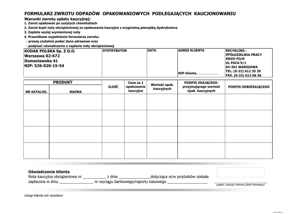 FORMULARZ ZWROTU ODPADÓW OPAKOWANIOWYCH PODLEGAJĄCYCH KAUCJONOWANIU Warunki zwrotu opłaty kaucyjnej: 1. Zwrot opakowań po zużytych chemikaliach 2. Zwrot kopii noty obciążeniowej za opakowania kaucyjne z oryginalną pieczątką dystrybutora 3. Zapłata wyżej wymienionej noty 4. Prawidłowe wypełnienie formularza zwrotu: - proszę czytelnie podać dane adresowe oraz - podpisać oświadczenie o zapłacie noty obciążeniowej DATA ADRES KLIENTA DYSTRYBUTOR KODAK POLSKA Sp. Z O.O. Warszawa 02-672 Domaniewska 41 NIP: 526-020-15-54 NIP klienta............................ PRODUKT ILOŚĆ NR KATALOG. NAZWA Cena za 1 opakowanie kaucyjne Wartość opak. kaucyjnych PODPIS ZDAJĄCEGOprzyjmującego wartość opak. kaucyjnych Oświadczenie klienta Nota kaucyjna obciążeniowa nr ___________ z dnia _______________dotycząca w/w produktów została zapłacona w dniu ________________ nr wyciągu bankowego/raportu kasowego ___________________ RECYKLING : SPÓŁDZIELNIA PRACY ARGO-FILM UL PACA 9/1 04-361 WARSZAWA TEL. (0-22) 612 35 29 FAX. (0-22) 612 06 36 PODPIS ODBIERAJĄCEGO podpis i pieczęć imienna (dział finansowy) Uwagi klienta lub recyklera: WO v. 02'05 v.2
