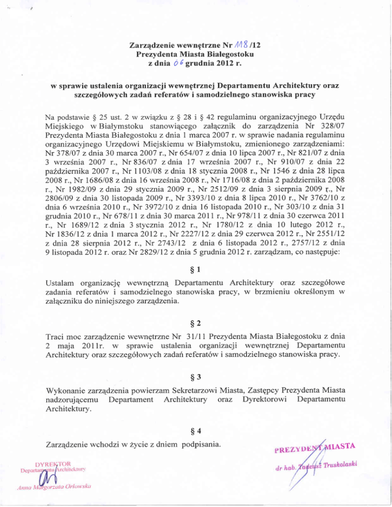 Zarz4dzeniewewngtrzneNr /48 ttZ Prezydenta Miasta Bialegostoku z dnia g 6 grudnia 2012 r. w sprawie ustaleniaorganizacji wewngtrznejDepartamentu Architektury oraz szczeg6lowychzadafi referat6w i samodzielnegostanowiska pracy Na podstawie$ 25 ust. 2 w zwiqzkuz $ 28 i S 42 regulaminu organizacyjnegoUrzEdu Miejskiego w Bialymstoku stanowi4cego zalqcznik do zarzqdzenia Nr 328107 PrezydentaMiasta Bialegostokuz dnia 1 marca2007 r. w sprawienadaniaregulaminu organizacyjnegoUrzgdowi Miejskiemu w Bialymstoku, zmienionego zarzqdzeniami: Nr 378/07z dnia 30 marca 2007 r., Nr 654107z dnia 10 lipca 2007 r., Nr 821107z dnia 3 wrzesnia 2007 r., Nr836107 zdnia 17 wrzeSnia2007 r., Nr 910107z dnia 22 paldziernika200Tr., Nr 1103/08zdnia l8 stycznia2008 r., Nr 1546z dnia 28 lipca z dnia2 paldziernika2008 2008r., Nr 1686/08z dnia 16 wrzeSnia2008r., Nr 1716108 r., Nr 1982109z dnia 29 stycznia2009 r., Nr 2512109z dnia 3 sierpnia 2009 r., Nr 2806109z dnia 30 listopada2009 r., Nr 3393110z dnia 8 lipca 2010 r.,Nr 3762110z dnia 6 wrzesnia2010 r., Nr 3972110z dnia 16 listopada2010r., Nr 303/10z dnia3l grudnia2010r., Nr 678/11z dnia30 marca20ll r., Nr 978/11z dnia30 czerwca20ll r., Nr 1689112zdnia 3 stycznia 2012 r., Nr |780ll2 z dnia 10 lutego 2012 r., z dnia29 czerwca2012r., Nr 255IlI2 Nr 1836/12z dnia I marca2012r.,Nr 2227112 Nr 2743112 z dnia 6 listopada2012 r., 2757112z dnia 2012 r., z dnia 28 sierpnia 9 listopada2012 r. oraz Nr 2829112z dnia 5 grudnia2012 r. zarzqdzam,co nastgpuje: s1 Ustalam organizacjQ wewngtrznq Departamentu Architektury oraz szczeg6lowe zadaniareferat6w i samodzielnegostanowiska pracy, w brzmieniu okreSlonymw zalqczniku do nini ejszego zar zqdzenia. s2 Traci moc zarzqdzeniewewnptrzneNr 3llll PrezydentaMiasta Bialegostokuz dnia 2 maja 201h. w sprawie ustalenia organizacji wewngtrznej Departamentu Architektury oraz szczegotowychzadanreferat6wi samodzielnegostanowiskapracy. $3 Wykonanie zarzqdzeniapowierzam SekretarzowiMiasta, ZastEpcyPrezydentaMiasta nadzorujqcemu Departament Architektury oraz Dyrektorowi Departamentu Architektury. s4 Zarzqdzeniewchodzi w Zycie z dniem podpisania. IASTA Zalqcznik do zarzqdzeniawewngtrznegoNr Pr ezydentaMiasta B ialegostoku zdnia?6 grudnia2012r. .ll2 ORGANIZACJA.WEWN4TRZNA DEPARTAMENTU ARCHITEKTURY ORAZ SZCZEGOI,OWE ZADANIA REFERATOW I SAMODZIELNEGO STANOWISKA PRACY. I. Organizacj^ wewnetrzna. 1. Departament Architektury dzieli sig na nastgpuj4cereferaty oraz samodzielne stanowiskopracy: 1) ReferatPozwolerina Budowg - Rejon Poludnie(DAR.I); 2) ReferatPozwolerina Budowp - Rejon P6lnoc (DAR.II); 3) ReferatInfrastrukturyMiejskiej (DAR.V); 4) Samodzielnestanowiskopracyds. organizacyjno-prawnych(DAR.VI) ; 5) ReferatPozwolerina Budowg - Rejon Centrum(DAR.VII). 2. Departamentemkieruje Dyrektor przy pomocy jednego ZastEpcyi Kierownik6w Referat6w oraz nadzorule Referat Infrastruktury Miejskiej i samodzielne stanowiskopracy ds. organizacyjno-prawnych. 3. ZastEpcaDyrektora kieruje ReferatemPozwolerina Budowg - Rejon P6lnoc oraz nadzoruje Referat Pozwoleri na Budowp Rejon Potudnie i Referat Pozwoleri na BudowE Rejon Centrum, a w czasienieobecnoSciDyrektora kieruje pracq calego departamentu. II. Szczeg6lowezadania referat6w i samodzielnegostanowiska pracy. 1. Do zadafi Referat6w Pozrvolef na Budowg (Rejon P6lnoc, Rejon Poludnie i Rejon Centrum), naleLy: 1) prowadzeniepostgpowarii wydawanie decyzji w sprawachpozwoleri na budowE, rozbi6rek obiekt6w budowlanychlub zatwierdzaniaprojekt6w budowlanych; 2) przyjmowanie zgloszefi budowy, przebudowy, rozbi6rki i wykonania rob6t budowlanych, dla kt6rych nie jest wymaganeuzyskaniepozwolenia na budowg (rozbiorkg); 3) przyjmowanie zgloszehw sprawach zmiany sposobuuzytkowania obiekt6w lub ich czpSci; 4) wydawanie na wniosek inwestora spelniaj4cego warunki do uzyskania pozwolenia na budowE, odrgbnych decyzji o zatwierdzeniu projektu budowlanego; 5) przygotowywanieprojekt6w wyst4pierido wla5ciwegoministra, z wnioskami w sprawie upowaznienia do udzielenia zgody fia odstppstwa od przepisow techniczno-budowlanych ; 6) wydawanie postanowieri w sprawie zgody na odstgpstwo od przepis6w techniczno-budowlanych ; 7) przenoszenie,za zgodqstrony, decyli o pozwoleniu na budowEna rzecz innego podmiotu; 8) wydawanie ra wniosek inwestora decyzji rozstrzygaj4cych o niezbEdnoSci wejScia do sEsiedniegobudynku, lokalu lub na teren s4siedniejnieruchomoSci, z okresleniem granic niezbgdnej potrzeby oraz warunk6w korzystania lub nieruchomoSci w przypadku uznania z sqsiedniego budynku lokalu wniosku inwestora; zasadnoSci 9) pr zekazywanie organom nadzorubudowlanego : a) kopii ostatecznychdecyzji o pozwoleniu na budowE wraz z zatwierdzonym projektembudowlanym, b) kopii ostatecznychodrgbnych decyzji o zatwierdzeniuprojektu budowlanego wrazztym projektem, c) kopii innych decyzji, postanowieri i zgloszefi wynikaj4cych z prawa budowlanego; 10) uczestnictwo, na wezwanie organu nadzoru budowlanego w czynnoSciach inspekcyjnych i kontrolnych oraz udostEpnianiewszelkich dokument6w i informacji zw iqzanych z tymi czynnoSciami; ll) przyjmowaniei wykonywanie kierowanychprzez organy nadzorubudowlanego zalecehp okontrolnych; 12) wsp6ldzialanie z organami nadzont budowlanego oraz organami kontroli paristwowej; 13) kierowanie wniosk6w do wlaSciwego powiatowego inspektora nadzoru budowlanego w celu podjgcia dzialah zmrerzajqcych do usunigcia bezpoSredniego zagrohenia Zycia lub zdrowia ludzi, zwiqzanego z budowq utrzy maniem lub rozbi 6rkE obi ekt6w budowlanych; r4) wy dawanie zalw iadczeristwier dzajqcych samodzielnoS6 Iokalu; ls) wydawanie zalwiadczef potwierdzajqcych powierzchnip uzytkowq oraz wyposaZenietechnicznebudynku mieszkalnego. 2.Do zadafi Referatu Infrastruktury Miejskiej naleiry: 1) prowadzeniespraw dotyczqcychrobot budowlanych zwtqzanychz budowlami, w zakresieokreSlonymw ust. 1 pkt 1-13w odniesieniudo calegoMiasta; 2) prowadzenie postEpowari dotycz4cych zezwoleh na realizacjE inwestycji drogowych. 3. Do zadafi samodzielnegostanowiskapracy ds. organizacyjno- prawnych'