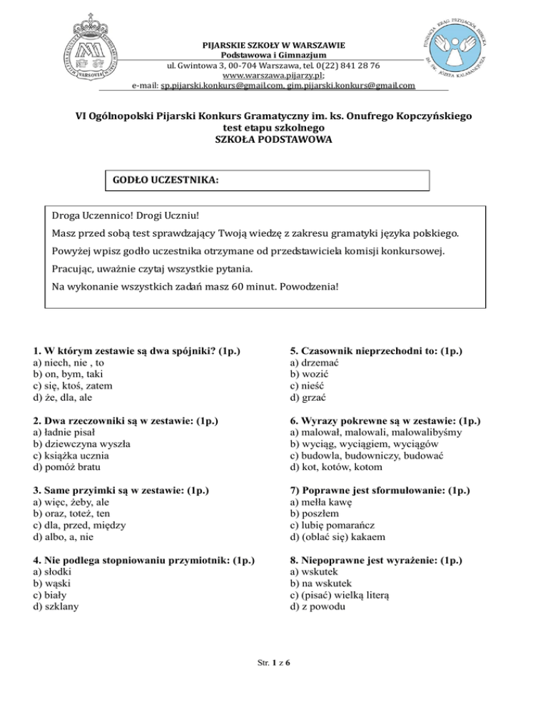 PIJARSKIE SZKOŁY W WARSZAWIE Podstawowa i Gimnazjum ul. Gwintowa 3, 00-704 Warszawa, tel. 0(22) 841 28 76 www.warszawa.pijarzy.pl; e-mail: [email protected], [email protected] VI Ogólnopolski Pijarski Konkurs Gramatyczny im. ks. Onufrego Kopczyńskiego test etapu szkolnego SZKOŁA PODSTAWOWA GODŁO UCZESTNIKA: Droga Uczennico! Drogi Uczniu! Masz przed sobą test sprawdzający Twoją wiedzę z zakresu gramatyki języka polskiego. Powyżej wpisz godło uczestnika otrzymane od przedstawiciela komisji konkursowej. Pracując, uważnie czytaj wszystkie pytania. Na wykonanie wszystkich zadań masz 60 minut. Powodzenia! 1. W którym zestawie są dwa spójniki? (1p.) a) niech, nie , to b) on, bym, taki c) się, ktoś, zatem d) że, dla, ale 5. Czasownik nieprzechodni to: (1p.) a) drzemać b) wozić c) nieść d) grzać 2. Dwa rzeczowniki są w zestawie: (1p.) a) ładnie pisał b) dziewczyna wyszła c) książka ucznia d) pomóż bratu 6. Wyrazy pokrewne są w zestawie: (1p.) a) malował, malowali, malowalibyśmy b) wyciąg, wyciągiem, wyciągów c) budowla, budowniczy, budować d) kot, kotów, kotom 3. Same przyimki są w zestawie: (1p.) a) więc, żeby, ale b) oraz, toteż, ten c) dla, przed, między d) albo, a, nie 7) Poprawne jest sformułowanie: (1p.) a) mełła kawę b) poszłem c) lubię pomarańcz d) (oblać się) kakaem 4. Nie podlega stopniowaniu przymiotnik: (1p.) a) słodki b) wąski c) biały d) szklany 8. Niepoprawne jest wyrażenie: (1p.) a) wskutek b) na wskutek c) (pisać) wielką literą d) z powodu Str. 1 z 6 9. W którym wyrazie nie ma głoski bezdźwięcznej? (1p.) a) pocieszyć b) malinowy c) wytrawne d) polonistyczny 10. Same czasowniki w formach nieosobowych są w zestawie: (1p.) a) śpiąc, bieganie, wszedłszy b) wiszący, pomalowany, chciałbyś c) zniesiemy, mówiący, wypiwszy d) zabrano, kochać, móc 11. Odmień przez przypadki w obu liczbach rzeczownik „spółka”. Oddziel końcówki od tematu, wskaż oboczności, wypisz tematy oboczne. (4p.) ….......................................................................................................................................................................... .............................................................................................................................................................................. .............................................................................................................................................................................. .............................................................................................................................................................................. .............................................................................................................................................................................. .............................................................................................................................................................................. .............................................................................................................................................................................. 12. Do podanych form osobowych dopisz bezokoliczniki, od których zostały utworzone: (3p.) sprzątnęli-............................................................................................ jesteśmy-.............................................................................................. przygotowywała-................................................................................. przyrzekł-............................................................................................. możecie-............................................................................................... pomogłybyście-.................................................................................... Str. 2 z 6 13. Uzupełnij tabelę, określ formę gramatyczną każdego czasownika. W miejscach, gdzie nie można tego zrobić, postaw kreskę. ( 7p.) osoba liczba tryb czas rodzaj strona aspekt niech zamykają zamknął będziemy spacerowały chodźcie został sklejony trzymałabyś modlimy się 14. Rozpoznaj zdania w stronie czynnej i biernej (zapisz obok każdego nazwę „strona czynna” lub „strona bierna”). Następnie przekształć zdania w stronie czynnej na stronę bierną, a zdania w stronie biernej – na czynną. Jeżeli nie można dokonać przekształcenia – postaw kreskę. (5p.) 1. Turyści obeszli zamek dookoła. …............................................................................................................... ….......................................................................................................................................................................... 2. Mały chłopczyk zbiera kasztany. …............................................................................................................... ….......................................................................................................................................................................... 3. Komputer został wyłączony przez mamę. …................................................................................................ ….......................................................................................................................................................................... 4. Książki będą układane na półkach przez dzieci. …...................................................................................... ….......................................................................................................................................................................... 5. Uczeń zje kanapkę. …................................................................................................................................... …