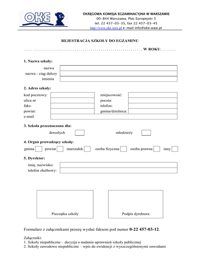 OKRĘGOWA KOMISJA EGZAMINACYJNA W WARSZAWIE 00-844 Warszawa, Plac Europejski 3 tel. 22 457-03-35, fax 22 457-03-45 http://www.oke.waw.pl e-mail [email protected] REJESTRACJA SZKOŁY DO EGZAMINU . . . . . . . . . . . . . . . . . .. . . . . . . . . . . . . . . . . . . . . . . . . . . . . . . . . . . . . . . . . W ROKU. . . . . . . . 1. Nazwa szkoły: nazwa nazwa - ciąg dalszy imienia 2. Adres szkoły: miejscowość: poczta: telefon: gmina/dzielnica: kod pocztowy: ulica nr faks: powiat: e-mail 3. Szkoła przeznaczona dla: dorosłych młodzieży 4. Organ prowadzący szkołę: gmina powiat marszałek osoba fizyczna osoba prawna inny 5. Dyrektor: imię, nazwisko: telefon służbowy: Pieczątka szkoły Podpis dyrektora Formularz z załącznikami proszę wysłać faksem pod numer 0-22 457-03-12. Załączniki: 1. Szkoły niepubliczne – decyzja o nadaniu uprawnień szkoły publicznej 2. Szkoły zawodowe niepubliczne – wpis do ewidencji z wyszczególnionymi zawodami