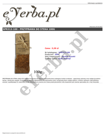 Informacje o produkcie Utworzono 07-03-2017 a. pl SPR313-100 - PRZYPRAWA DO STEKA 100G Cena : 5,59 zł er b Nr katalogowy : SPR313-100 Producent : SPR Stan magazynowy : bardzo wysoki Średnia ocena : brak recenzji eY PRZYPRAWA DO STEKA 100G ECO FARMA Przyprawa do steka to mieszanka,ktora wzbogaca bukiet smakowo - zapachowy potrawy oraz nadaje jej piekna barwe i atrakcyjny wyglad. Przyprawa ta zawiera odpowiednio skomponowane ziola i przyprawy,ktore nadaja stekom i miesom wolowym zdecydowany aromat i wydobywaja ich szlachetny smak. Mieszanka ta naciera sie mieso przed pieczeniem lub smazeniem jak rowniez sporzadza sie z niej marynate. Wygenerowano w programie www.oscGold.com