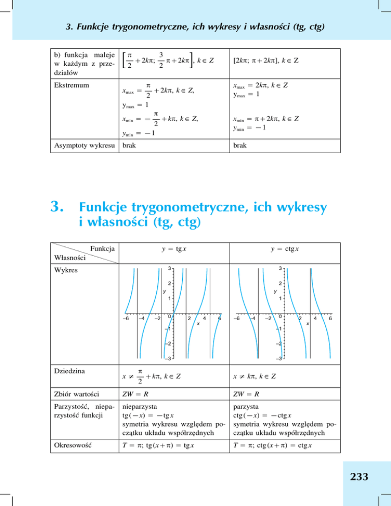 3. Funkcje trygonometryczne, ich wykresy i własności (tg, ctg) b) funkcja maleje w każdym z przedziałów Ekstremum 8 _2 +2k_; 32 _+2k_9, k ∈ Z _ +2k_, k ∈ Z, 2 ymax = 1 _ xmin = − +k_, k ∈ Z, 2 ymin = −1 xmax = Asymptoty wykresu brak [2k_; _+2k_], k ∈ Z xmax = 2k_, k ∈ Z ymax = 1 xmin = _+2k_, k ∈ Z ymin = −1 brak 3. Funkcje trygonometryczne, ich wykresy i własności (tg, ctg) Funkcja y = tg x y = ctg x Własności Wykres Dziedzina _ x= 2 +k_, k ∈ Z x = k_, k ∈ Z Zbiór wartości ZW = R ZW = R Parzystość, nieparzystość funkcji nieparzysta tg(−x) = −tg x symetria wykresu wzgle˛dem pocza˛tku układu współrze˛dnych parzysta ctg (−x) = −ctg x symetria wykresu wzgle˛dem pocza˛tku układu współrze˛dnych Okresowość T = _; tg (x+_) = tg x T = _; ctg (x+_) = ctg x 233
