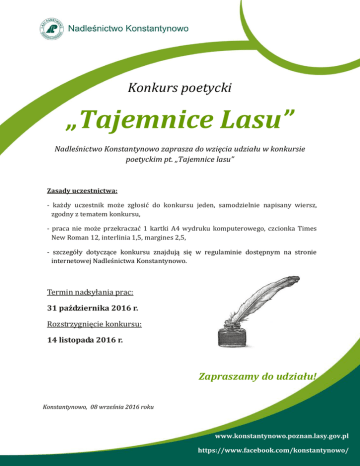 Konkurs poetycki „Tajemnice Lasu” Nadleśnictwo Konstantynowo zaprasza do wzięcia udziału w konkursie poetyckim pt. „Tajemnice lasu” Zasady uczestnictwa: - każdy uczestnik może zgłosić do konkursu jeden, samodzielnie napisany wiersz, zgodny z tematem konkursu, - praca nie może przekraczać 1 kartki A4 wydruku komputerowego, czcionka Times New Roman 12, interlinia 1,5, margines 2,5, - szczegóły dotyczące konkursu znajdują się w regulaminie dostępnym na stronie internetowej Nadleśnictwa Konstantynowo. Termin nadsyłania prac: 31 października 2016 r. Rozstrzygnięcie konkursu: 14 listopada 2016 r. Zapraszamy do udziału! Konstantynowo, 08 września 2016 roku www.konstantynowo.poznan.lasy.gov.pl https://www.facebook.com/konstantynowo/