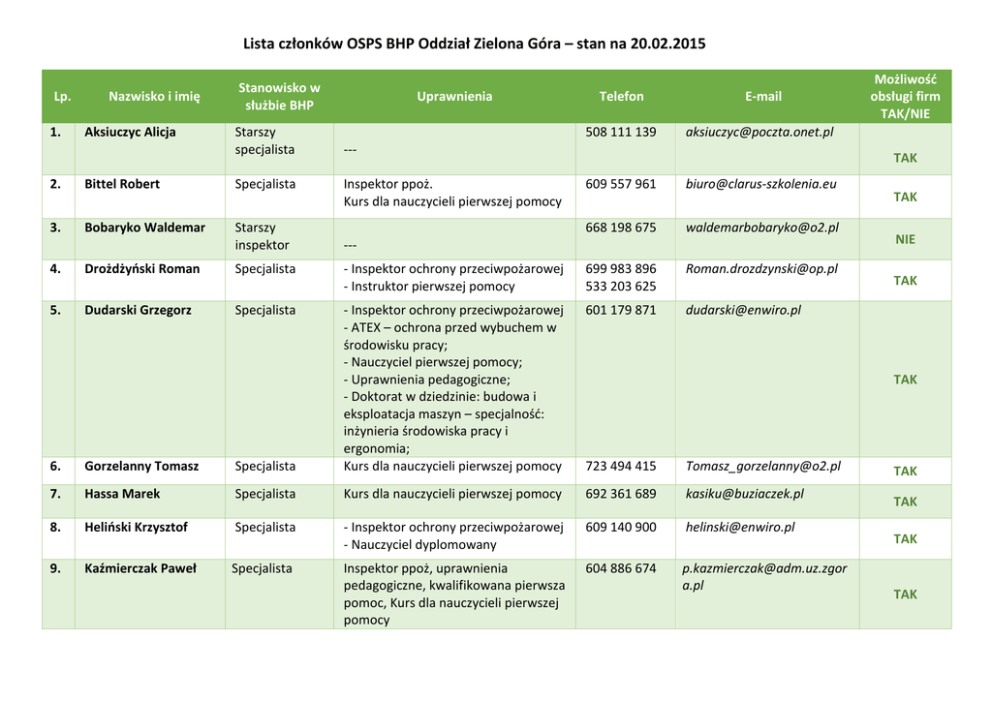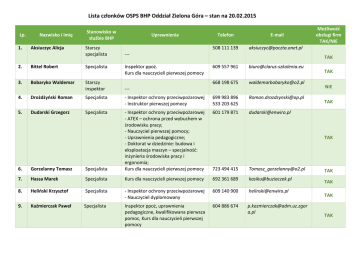 Lista członków OSPS BHP Oddział Zielona Góra – stan na 20.02.2015 Lp. 1. Nazwisko i imię Aksiuczyc Alicja Stanowisko w służbie BHP Starszy specjalista 2. Bittel Robert Specjalista 3. Bobaryko Waldemar Starszy inspektor Uprawnienia Telefon E-mail 508 111 139 [email protected] --Inspektor ppoż. Kurs dla nauczycieli pierwszej pomocy Możliwość obsługi firm TAK/NIE TAK 609 557 961 [email protected] 668 198 675 [email protected] --- TAK NIE 4. Drożdżyński Roman Specjalista - Inspektor ochrony przeciwpożarowej - Instruktor pierwszej pomocy 699 983 896 533 203 625 [email protected] 5. Dudarski Grzegorz Specjalista 601 179 871 [email protected] 723 494 415 [email protected] TAK TAK 6. Gorzelanny Tomasz Specjalista - Inspektor ochrony przeciwpożarowej - ATEX – ochrona przed wybuchem w środowisku pracy; - Nauczyciel pierwszej pomocy; - Uprawnienia pedagogiczne; - Doktorat w dziedzinie: budowa i eksploatacja maszyn – specjalność: inżynieria środowiska pracy i ergonomia; Kurs dla nauczycieli pierwszej pomocy 7. Hassa Marek Specjalista Kurs dla nauczycieli pierwszej pomocy 692 361 689 [email protected] 8. Heliński Krzysztof Specjalista - Inspektor ochrony przeciwpożarowej - Nauczyciel dyplomowany 609 140 900 [email protected] 9. Kaźmierczak Paweł Specjalista Inspektor ppoż, uprawnienia pedagogiczne, kwalifikowana pierwsza pomoc, Kurs dla nauczycieli pierwszej pomocy 604 886 674 [email protected] a.pl TAK TAK TAK TAK 10. Klaja Beata Specjalista Inspektor ppoż., Pedagogiczny kurs kwalifikacyjny dla nauczycieli 668 041 369 [email protected] TAK 11. Klorek Aneta Inspektor Inspektor ppoż, HCCP, Kurs dla nauczycieli pierwszej pomocy 696 765 315 [email protected] 12. Kojtych Piotr Specjalista Inspektor ppoż., Nauczyciel Dyplomowany, Kurs dla nauczycieli pierwszej pomocy - Inspektor ochrony przeciwpożarowej, - Instruktor pierwszej pomocy, - Placówka oświatowa kształcenia ustawicznego, - Nadzór bhp dużych inwestycji budowlanych Kurs Pedagogiczny, Kwalifikowana Pierwsza Pomoc - Inspektor ppoż., - Instruktor pierwszej pomocy, - Kurs Pedagogiczny, - Specjalista ds. Ochrony Środowiska Inspektor ppoż. 606 218 364 [email protected] 509 697 839 Inspektor ppoż 692 004 627 13. Kotowski Jan 14. Kozłowski Julian 15. Krakowiak Rafał 16. Kramarczyk Artur 17. Krzych Katarzyna Główny specjalista Ekspert BHP Starszy inspektor Specjalista Starszy inspektor Specjalista Inspektor 18. Kubalewski Mateusz 19. Lisowski Lesław 20. Ławrowski Łukasz Starszy inspektor Specjalista 21. Nitka Małgorzata Specjalista 22. Oleksy Janina Starszy inspektor NIE TAK 603 369 752 [email protected] TAK 607 718 920 [email protected] 791 023 464 [email protected] NIE NIE [email protected] m [email protected] NIE TAK Inspektor ppoż., Instruktor pierwszej pomocy Inspektor ppoż., Specjalista ds. Ochrony Środowiska Inspektor ppoż. 600 055 653 [email protected] 693 293 911 [email protected] 695 258 916 501 510 776 [email protected] m [email protected] 601 596 931 [email protected] ----- NIE NIE TAK TAK NIE 23. 24. Przymuszała Natalia Rogowski Piotr 25. Skopczyński Roman 26. 27. Szatkowski Andrzej Tatyrża Kamil 28. Welcz Jolanta 29. Wiater Andrzej 30. 31. Wieligórska Danuta Wojtkiewicz Kornel Starszy inspektor Starszy specjalista Starszy inspektor Główny specjalista Starszy inspektor Starszy specjalista Starszy specjalista Główny specjalista Inspektor 600 204 357 [email protected] --- Inspektor ppoż., - Instruktor pierwszej pomocy, - Audytor w dziedzinie PN EN 19001, PN-N18001, ISO 14001, - uprawnienia pedagogiczne, - instruktor i egzaminatora na operatorów wózków podnośnikowych Inspektor ppoż., Instruktor pierwszej pomocy Inspektor ppoż NIE 666 228 995 [email protected] TAK 606 234 867 [email protected] 504 219 035 [email protected] NIE TAK Inspektor ppoż. Audytor w dziedzinie: zintegr. system zarządz (PN-N-18001:2004. ISO 9001: 2008, PN-EN ISO 14001: 2005) Instruktor praktycznej nauki zawodu --Inspektor ppoż., Audytor ISO 9001,14001,18001,17025 Inspektor ppoż. 888709427 [email protected] NIE 608 520 490 [email protected] 509 800 435 [email protected] TAK TAK 608 377 071 danaw887gmail.com TAK - Inspektor ppoż., - Instruktor pierwszej pomocy - Audytor w dziedzinie: ISO 9001:2008 ISO/IEC 27001:2007 PN-N-18001:2004 i OHSAS 18001 - Instruktor praktycznej nauki zawodu 602 331 799 [email protected] NIE