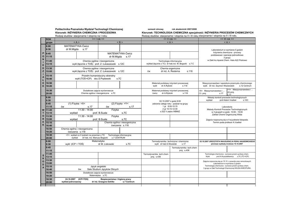 ROK grupa Politechnika Poznańska Wydział Technologii Chemicznej Kierunek: INŻYNIERIA CHEMICZNA I PROCESOWA Rodzaj studiów: stacjonarne I stopnia na I roku >> I rok << <A> <B> 11:45 13:15 Chemia ogólna i nieorganiczna wykł (łącznie z TOŚ) prof. Z. Łukaszewski s.12C 13:30 15:00 Chemia ogólna i nieorganiczna wykł (łącznie z TOŚ) prof. Z. Łukaszewski s.12C Ś R O D A Technologia informacyjna wykład (łącznie z TC) dr hab.inż. M. Bogacki ćw Chemia organiczna dr inż. A. Resterna s.7 C s.118 Przedm.humanistyczny obieralny wykł (TOŚ+ICP) doc.S.Popławski s.7C 15:10 16:40 16:50 18:20 Matemat.podstawy inżynierii procesowej wykł dr A.Rybicki s.118 18:30 20:00 W T O R E K Laboratorium w wymiarze 5 godzin Inżynieria chemiczna - procesy podstawowe i operacje jednostkowe 3 grupy w Zakł.Inz.Aparat.Chem. Hala A22 Piotrowo MATEMATYKA Ćwicz dr M.Migda s.17 9:45 11:15 8:00 9:30 9:45 11:15 11:45 13:15 13:30 15:00 15:10 16:40 16:50 18:20 18:30 20:00 8:00 9:30 9:45 11:15 11:45 13:15 13:30 15:00 15:10 16:40 16:50 18:20 18:30 20:00 rok akademicki 2007/2008 MATEMATYKA Ćwicz dr M.Migda s.17 8:00 9:30 P O N I E D Z I A Ł E K semestr zimowy Kierunek: TECHNOLOGIA CHEMICZNA specjalność: INŻYNIERIA PROCESÓW CHEMICZNYCH Rodzaj studiów: stacjonarne I stopnia na II i III roku stacjonarne I stopnia na II i III roku >> II rok << >> III rok << <A> <A> Matemat.podstawy inżynierii procesowej ćwicz dr A.Rybicki s.118 Dodatkowe zajęcia wyrównawcze Chemia ogólna i nieorganiczna s.7C (1) Fizyka >X< ćw (2) Fizyka >Y< s.17 11:30 - 14:00 wykład ćw s.17 Fizyka prof. B.Susła 11:30 - 14:00 wykład s.7C 02.10.2007 o godz.9:00 zebranie całego roku - podział na grupy 1 gr 8:00-10:15 2 gr 10:15-12:30 s.522 V piętro WBMiZ Fizyka prof. B.Susła s.7C Maszynoznawstwo i aparatura przemysłu chemicznego wykł. Dr inż. Szymon Woziwodzki s.12 Centrum >Y< Maszynoznawstwo i ... (2) proj. s.17 Metody kontroli procesów technologicznych wykład prof.Adam Voelkel s.12C >X< Maszynoznawstwo i ... (1) proj. s.17 Laboratoria Metody Kontroli Procesów Technologicznych w 3 grupach w godz. 10:00 - 19:00 Zakład Chemii Organicznej Wilda Zajęcia rozpoczną się w II-ej połowie listopada. Termin poda profesor A.Voelkel Chemia ogólna i nieorganiczna ćwiczenia s.118 Chemia ogólna i nieorganiczna ćwiczenia s.118 >Y< wykład co II tydzień na przemian z TC Technologia informacyjna wykład dr hab. inż. Mariusz Bogacki s.7 CENTRUM Matematyka dr M. Liskowski wykł (ICP + TOŚ) s.7C Termodynamika techniczna i chemiczna wykł dr hab.G.Musielak s.17 03.10.2007 UROCZYSTA INAUGURACJA ROKU AKADEMICKIEGO pierwsze wykłady środowe 10.10.2007 Termodynamika tech.chem proj. s.436 Termodynamika tech.chem proj. s.436 ćw. Język angielski Sale Studium Języków Obcych Dodatkowe zajęcia wyrównawcze Matematyka s.7C 24.10.2007 (ICP+TOS) wykład jednorazowy Bezpieczeństwo i higiena pracy dr inż. Grzegorz Dahlke s.7 Centrum Technologia chemiczna - surowce przem.syntezy chem. Wykł. prof.A.Krysztafkiewicz s.7C (TC+ICP) Zajęcia rozpoczną się po 15.10. z powodu prac remontowych Laboratorium w wymiarze 2 godzin Technologia chemiczna - surowce przem.syntezy chem. 3 grupy w Zakł.Technologii Chemicznej WILDA KWESTURA C Z W A R T E K P I Ą T E K 8:00 9:30 9:45 11:15 11:45 13:15 13:30 15:00 15:10 16:40 16:50 18:20 18:30 20:00 8:00 9:30 9:45 11:15 11:45 13:15 13:30 15:00 15:10 16:40 16:50 18:20 18:30 20:00 Analiza instrumentalna wykł (IPC + TOŚ) prof. H. Matusiewicz s. 7C Wstęp do inżynierii chemicznej i procesowej wykład prof.L.Broniarz-Press i prof.S.J.Kowalski s.12 Centrum Chemia fizyczna wykład (IPC + TOŚ) prof. A. Lewandowski s.7C Laboratorium w wymiarze 4 godzin Inżynieria chemiczna - bilansowanie masy i energii 3 grupy w Zakł.Inz.Aparat.Chem. Hala A22 Piotrowo Chemia organiczna wykład (IPC + TOŚ) prof. A. Olszanowski s.7C Inżynieria Chemiczna - procesy podstawowe i operacje jednostkowe wykład prof. L.Broniarz-Press s.12 Centrum Metody komputerowe w modelowaniu procesów przepływowych wykł prof.J.Kołodziej s.118 Technologia chemiczna - surowce przem.syntezy chem. Ćwiczenia (po 15.10) s.436 11 października 2007 r. dzień rektorski, zajęcia biblioteczne przełożone na następny czwartek 18.10.2007 r. 18.10. 15:00-16:00 Usługi bibl.inf. 18.10. 16:00-174:00 Usługi bibl.inf. Dodatkowe zajęcia wyrównawcze Fizyka s.7C WYCHOWANIE FIZYCZNE Zajęcia odbywają się na obiektach sportowych zgodnie z podziałem dokonanym przez STUDIUM WYCHOWANIA FIZYCZNEGO PP ćw. >X< Metody komp. model. proces.przepływ proj. s.309 Elementy elektrotechniki i elektroniki wykł. Prof. Władysław Opydo s.118 >Y< Metody komp. model. proces.przepływ proj. s.309 Język angielski Sale Studium Języków Obcych Inżynieria chemiczna - bilansowanie masy i energii wykł prof.L.Broniarz-Press s.12C 14:00-15:30 Inf. 1 proj. S.47W IC - bilansowanie >X< proj. s.436x IC - bilansowanie >Y< proj. s.436x 15:30-17:00 Inf. 2 proj. S.47W 17:00-18:30 Inf. 3 proj. S.47W 18:30-20:00 Inf. 4 proj. S.47W Egzaminy: 1. Matematyka 1. Chemia organiczna 2. Fizyka 2. Analiza instrumentalna Zajęcia projektowe - komputerowe z TECHNOLOGII INFORMACYJNEJ odbędą się w 4 grupach w piątek od 14:00 - 20:00 w sali 47 na Wildzie w gmachu Kwestury Zajęcia: Usługi biblioteczne i informacyjne i BHP obowiązkowe z zaliczeniem w indeksie 3. Termodynamika techniczna i chemiczna 1 .Technologia chemiczna - surowce przemysłowej syntezy chemicznej 2. Inżynieria chemiczna - procesy podstawowe i operacje jednostkowe 3. Maszynoznawstwo i aparatura przemysłu chemicznego UWAGA : Zajęcia oznaczone : >X< odbywają się co drugi tydzień i rozpoczynają się w pierwszym tygodniu zajęć (zajęcia nad kreską) >Y< odbywają się co drugi tydzień i rozpoczynają się w drugim tygodniu zajęć (zajęcia pod kreską) ZOBACZ NA TABLICY WYKAZ TYGODNI DLA ZAJĘĆ ODBYWAJĄCYCH SIĘ CO DRUGI TYDZIEŃ Pełne nazwy przedmiotów umieszczone są na planie studiów w sąsiedniej gablocie. Rodz