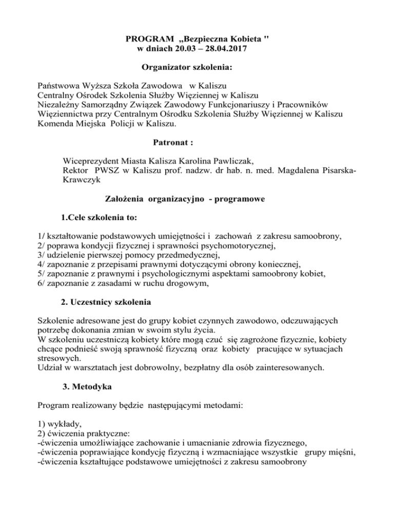 PROGRAM ,,Bezpieczna Kobieta '' w dniach 20.03 – 28.04.2017 Organizator szkolenia: Państwowa Wyższa Szkoła Zawodowa w Kaliszu Centralny Ośrodek Szkolenia Służby Więziennej w Kaliszu Niezależny Samorządny Związek Zawodowy Funkcjonariuszy i Pracowników Więziennictwa przy Centralnym Ośrodku Szkolenia Służby Więziennej w Kaliszu Komenda Miejska Policji w Kaliszu. Patronat : Wiceprezydent Miasta Kalisza Karolina Pawliczak, Rektor PWSZ w Kaliszu prof. nadzw. dr hab. n. med. Magdalena PisarskaKrawczyk Założenia organizacyjno - programowe 1.Cele szkolenia to: 1/ kształtowanie podstawowych umiejętności i zachowań z zakresu samoobrony, 2/ poprawa kondycji fizycznej i sprawności psychomotorycznej, 3/ udzielenie pierwszej pomocy przedmedycznej, 4/ zapoznanie z przepisami prawnymi dotyczącymi obrony koniecznej, 5/ zapoznanie z prawnymi i psychologicznymi aspektami samoobrony kobiet, 6/ zapoznanie z zasadami w ruchu drogowym, 2. Uczestnicy szkolenia Szkolenie adresowane jest do grupy kobiet czynnych zawodowo, odczuwających potrzebę dokonania zmian w swoim stylu życia. W szkoleniu uczestniczą kobiety które mogą czuć się zagrożone fizycznie, kobiety chcące podnieść swoją sprawność fizyczną oraz kobiety pracujące w sytuacjach stresowych. Udział w warsztatach jest dobrowolny, bezpłatny dla osób zainteresowanych. 3. Metodyka Program realizowany będzie następującymi metodami: 1) wykłady, 2) ćwiczenia praktyczne: -ćwiczenia umożliwiające zachowanie i umacnianie zdrowia fizycznego, -ćwiczenia poprawiające kondycję fizyczną i wzmacniające wszystkie grupy mięśni, -ćwiczenia kształtujące podstawowe umiejętności z zakresu samoobrony /zagrożenie na ulicy, zagrożenie w pomieszczeniach z wykorzystaniem różnych dostępnych przedmiotów do obrony własnej /. 4. Ramowy program warsztatów Lp. Zagadnienia Wykład Ćwiczenia Samoobrona 8 Pierwsza pomoc przedmedyczna Aspekty prawne 2 Warsztaty Liczba godz. 8 1. 2. 2 2 2 3. Psychologia 4 4 4. 5. Profilaktyka społeczna Fitness 4 4 2 6. Miejsce : PWSZ Kalisz / Sala sportowa ul. Nowy Świat 4a, Termin: 20.03 - 28. 04.2017 roku , Czas: 2 x 45 min. Liczba uczestników: min 50 kobiet, Ubiór: dowolny strój sportowy. Kierownik szkolenia : dr Paweł Kamiński ppłk mgr Mirosław Kuświk, zajęcia z samoobrony: ppłk mgr Mirosław Kuświk, zajęcia pomocy przedmedycznej mgr Łukasz Cichocki, zajęcia prawne i fitness: mgr Marek Kruszka, zajęcia z psychologii (radzenie sobie ze stresem) mgr Anna Leśniak - Jarecka, profilaktyka społeczna st. sierż. Agnieszka Olejnik Mucha Ruch drogowy 2 Kom. Przemysław Czarnecki Wybrane aspekty zagrożeń terrorystycznych dr Paweł Kamiński Szkolenie kończy się wydaniem stosownych dyplomów dla wszystkich uczestniczek Uwagi 1. Każdy uczestnik ubezpiecza się we własnym zakresie. 2. Posiada aktualne i ważne badania lekarskie. Program opracowali : dr Paweł Kamiński ppłk mgr Mirosław Kuświk