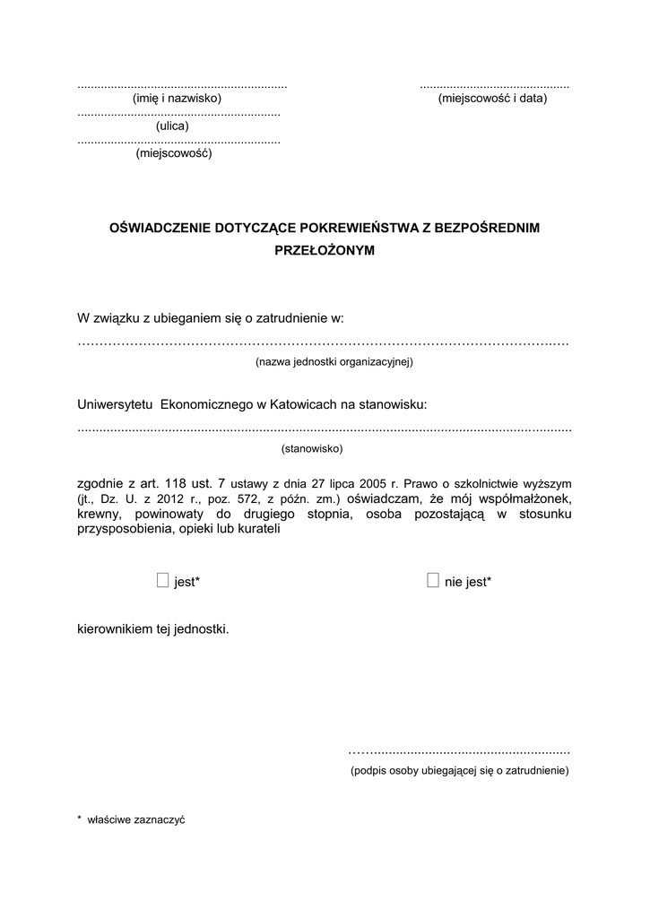 ............................................................... (imię i nazwisko) ............................................................. (ulica) ............................................................. (miejscowość) ............................................. (miejscowość i data) OŚWIADCZENIE DOTYCZĄCE POKREWIEŃSTWA Z BEZPOŚREDNIM PRZEŁOŻONYM W związku z ubieganiem się o zatrudnienie w: ……………………………………………………………………………………………….…. (nazwa jednostki organizacyjnej) Uniwersytetu Ekonomicznego w Katowicach na stanowisku: ........................................................................................................................................ (stanowisko) zgodnie z art. 118 ust. 7 ustawy z dnia 27 lipca 2005 r. Prawo o szkolnictwie wyższym (jt., Dz. U. z 2012 r., poz. 572, z późn. zm.) oświadczam, że mój współmałżonek, krewny, powinowaty do drugiego stopnia, osoba pozostającą w stosunku przysposobienia, opieki lub kurateli jest* nie jest* kierownikiem tej jednostki. ……...................................................... (podpis osoby ubiegającej się o zatrudnienie) * właściwe zaznaczyć