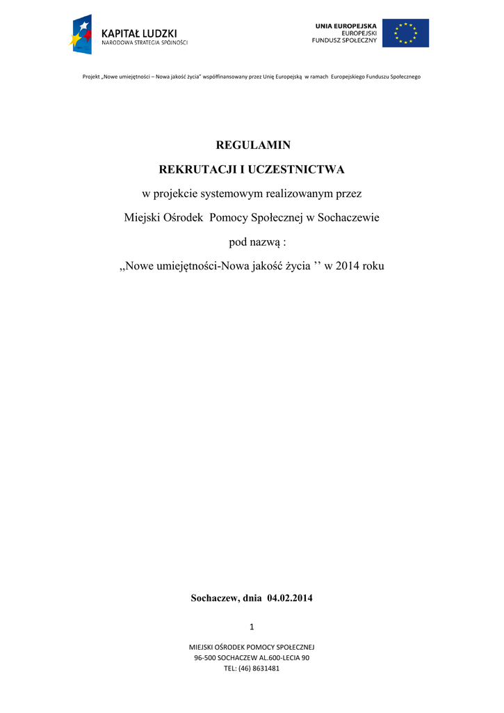 Projekt „Nowe umiejętności – Nowa jakość życia” współfinansowany przez Unię Europejską w ramach Europejskiego Funduszu Społecznego REGULAMIN REKRUTACJI I UCZESTNICTWA w projekcie systemowym realizowanym przez Miejski Ośrodek Pomocy Społecznej w Sochaczewie pod nazwą : ,,Nowe umiejętności-Nowa jakość życia ’’ w 2014 roku Sochaczew, dnia 04.02.2014 1 MIEJSKI OŚRODEK POMOCY SPOŁECZNEJ 96-500 SOCHACZEW AL.600-LECIA 90 TEL: (46) 8631481 Projekt „Nowe umiejętności – Nowa jakość życia” współfinansowany przez Unię Europejską w ramach Europejskiego Funduszu Społecznego Projekt realizowany w roku 2014 stanowi siódmą edycję realizacji projektu w ramach Programu Operacyjnego Kapitał Ludzki, Priorytet VII- Promocja integracji społecznej, Działanie 7.1 – Rozwój i upowszechnianie aktywnej integracji, Poddziałanie 7.1.1.- Rozwój i upowszechnianie aktywnej integracji przez ośrodki pomocy społecznej współfinansowany ze środków Unii Europejskiej w ramach Europejskiego Funduszu Społecznego. §1. INFORMACJE OGÓLNE 1. Niniejszy regulamin określa zasady rekrutacji kandydatów/kandydatek do udziału w projekcie, zasady uczestnictwa w projekcie oraz prawa i obowiązki Beneficjentów Ostatecznych Projektu. 2. Projekt systemowy pod nazwą ,,Nowe umiejętności-Nowa jakość życia’’ realizowany jest przez Miejski Ośrodek Pomocy Społecznej w Sochaczewie z siedzibą przy ulicy Aleja 600lecia 90,96-500 Sochaczew. 3. Biuro projektu znajduje się w budynku Miejskiego Ośrodka Pomocy Społecznej w Sochaczewie przy ulicy Aleja 600-lecia 90,96-500 Sochaczew, Pokój 210 tel: 046 86314 81 wew.15 4. Projekt jest współfinansowany przez Unię Europejską w ramach Europejskiego Funduszu Społecznego. 5.Projekt jest realizowany na podstawie umowy zawartej pomiędzy Gminą Miasto Sochaczew w imieniu, której występuje Miejski Ośrodek Pomocy Społecznej w Sochaczewie, a Mazowiecką Jednostką Wdrażania Programów Unijnych w Warszawie.(Instytucją Pośredniczącą II stopnia) 6. Celem głównym realizowanego projektu jest Rozwój aktywnej integracji wśród osób zagrożonych wykluczeniem społecznym z terenu miasta Sochaczew i upowszechnianie pracy socjalnej. W roku 2014 projekt jest skierowany do 21 osób( 13 K i 8 M) , oraz trzech osób kontynuujących udział w projekcie w 2014 w związku z kontynuacją nauki w szkole. 2 MIEJSKI OŚRODEK POMOCY SPOŁECZNEJ 96-500 SOCHACZEW AL.600-LECIA 90 TEL: (46) 8631481 Projekt „Nowe umiejętności – Nowa jakość życia” współfinansowany przez Unię Europejską w ramach Europejskiego Funduszu Społecznego 7. Użyte w regulaminie określenia oznaczają: a) Projekt- Projekt systemowy w ramach Programu Operacyjnego Kapitał Ludzki , Priorytet VII Promocja integracji społecznej, Działanie 7.1 Rozwój i upowszechnianie aktywnej integracji, Poddziałanie 7.1.1 Rozwój i upowszechnianie aktywnej integracji przez ośrodki pomocy społecznej. pt. „Nowe umiejętności-Nowa jakość życia ” b) EFS- Europejski Fundusz Społeczny c) UE- Unia Europejska d) Beneficjent- Gmina Miasto Sochaczew / Miejski Ośrodek Pomocy Społecznej w Sochaczewie e) Kandydat – osoba ubiegająca się o zakwalifikowanie do udziału w projekcie. f) Beneficjent Ostateczny Projektu/ Uczestnik/Uczestniczka Projektu – uczestnik /uczestniczka projektu. g) Zespół rekrutacyjny- w składzie: Z-ca dyrektora MOPS, reprezentanci pracowników socjalnych. Zadaniem zespołu jest wybór kandydatów spełniających wszystkie wymogi kwalifikacyjne do udziału w projekcie. h) Deklaracja Uczestnictwa w projekcie- dokument stanowiący wyrażenie zgody na udział w projekcie. i) Instrumenty aktywnej integracji( narzędzia aktywizacji zawodowej, społecznej, edukacyjnej, zdrowotnej) – są to formy wsparcia o charakterze aktywizacyjnym mające na celu przywrócenie możliwości lub zdolności do zatrudnienia oraz integracji społecznej osób korzystających ze świadczeń pomocy społecznej. 3 MIEJSKI OŚRODEK POMOCY SPOŁECZNEJ 96-500 SOCHACZEW AL.600-LECIA 90 TEL: (46) 8631481 Projekt „Nowe umiejętności – Nowa jakość życia” współfinansowany przez Unię Europejską w ramach Europejskiego Funduszu Społecznego §2. INFORMACJE O PROJEKCIE 1.Projekt w roku 2014 zakłada objęcie wsparciem aktywizacyjno-integracyjnym 21 Beneficjentów Ostatecznych / Uczestników Projektu przy pomocy kontraktu socjalnego, oraz kontynuacje wsparcia w ramach projektu dla 3 osób realizujących edukację szkolną. Kontrakt socjalny zawarty zostanie z Uczestnikami/Uczestniczkami Projektu przez pracownika socjalnego , których stanowić będą osoby bezrobotne, nieaktywne zawodowo, niepełnosprawne będące w wieku aktywności zawodowej zagrożone wykluczeniem społecznym i korzystające ze świadczeń pomocy społecznej Kontrakt socjalny zawarty w roku 2014 dotyczy 21 osób ,( w tym 13 Kobiet ,8 Mężczyzn ) , które stanowić będą ; osoby bezrobotne (10 kobiet, 5 mężczyzn) nieaktywne zawodowo (3 kobiety, 3 mężczyzna) niepełnosprawne będące w wieku aktywności zawodowej zagrożone wykluczeniem społecznym korzystające ze świadczeń pomocy społecznej , mieszkające na ternie miasta Sochaczew 2.Realizację działań zawartych w kontrakcie dla uczestników/uczestniczek projektu 2014 planuje się do grudnia 2014 roku 3. Udział Uczestników/Uczestniczek w projekcie jest bezpłatny. 4. Udział Uczestników/Uczestniczek w projekcie jest dobrowolny. 5. Każdy z uczestników projektu zostanie objęty co najmniej trzema instrumentami aktywnej integracji ,które będą indywidualnie dobierane do potrzeb uczestników projektu. 4 MIEJSKI OŚRODEK POMOCY SPOŁECZNEJ 96-500 SOCHACZEW AL.600-LECIA 90 TEL: (46) 8631481 Projekt „Nowe umiejętności – Nowa jakość życia” współfinansowany przez Unię Europejską w ramach Europejskiego Funduszu Społecznego Zakres wsparcia dla Uczestników/Uczestniczek w projekcie w ramach kontraktu obejmuje a) INSTRUMENTY AKTYW