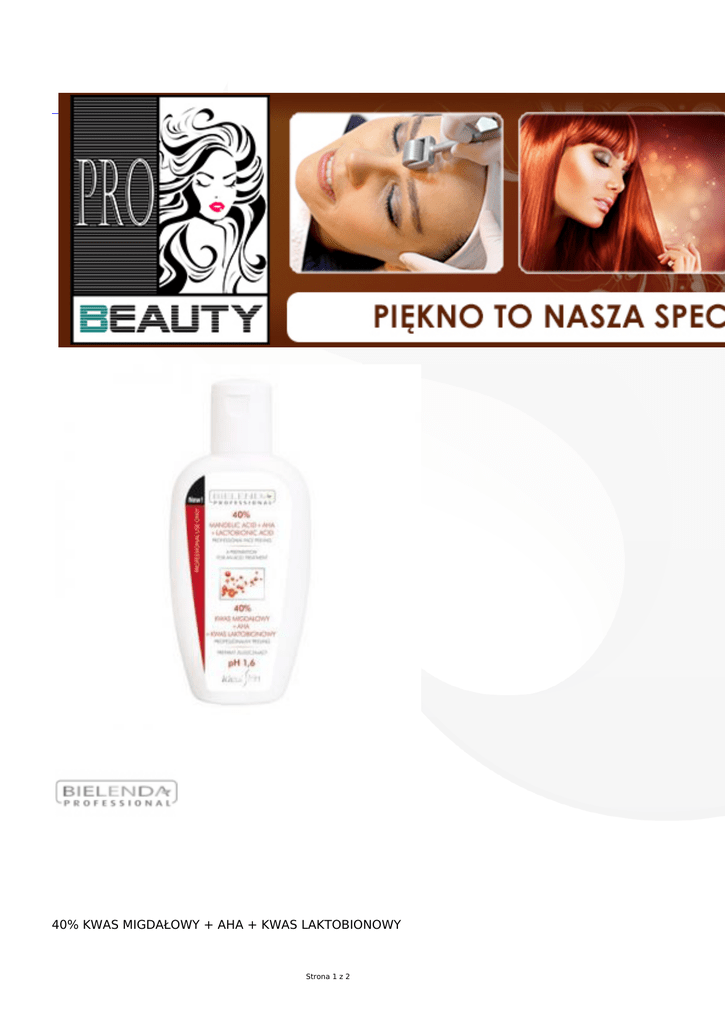 40% KWAS MIGDAŁOWY + AHA + KWAS LAKTOBIONOWY Strona 1 z 2 40% Kwas Migdałowy + AHA + Kwas Laktobionowy, pH 1,6 Profesjonalny peeling Pojemność 150g Działanie - odmładza uelastycznia wygładza ujędrnia skórę ujednolica koloryt skóry rozjaśnia przebarwienia wykazuje działanie bakteriostatyczne (pomocny w leczeniu trądziku) redukuje i reguluje wydzielanie sebum zmniejsza drobne zmarszczki wykazuje działanie keratolityczne. Stosowanie Odpowiednią ilość preparatu nanieść pędzelkiem na osuszoną skórę twarzy, szyi, dekoltu (omijając okolice oczu). Pozostawić preparat na czas dostosowany do stanu skóry pacjenta oraz jej wrażliwości. Działanie kwasu zatrzymać Neutralizatorem (zmieniając kilkakrotnie waciki), następnie pozostałość preparatów usunąć letnia wodą. Osuszyć chusteczką kosmetyczną. Strona 2 z 2
