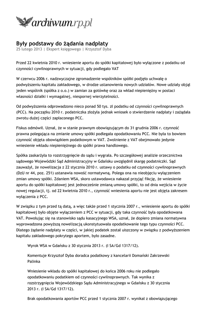 Były podstawy do żądania nadpłaty 25 lutego 2013 | Ekspert księgowego | Krzysztof Dyba Przed 22 kwietnia 2010 r. wniesienie aportu do spółki kapitałowej było wyłączone z podatku od czynności cywilnoprawnych w sytuacji, gdy podlegało VAT W czerwcu 2006 r. nadzwyczajne zgromadzenie wspólników spółki podjęło uchwałę o podwyższeniu kapitału zakładowego, w drodze ustanowienia nowych udziałów. Nowe udziały objął jeden wspólnik (spółka z o.o.) w zamian za gotówkę oraz za wkład niepieniężny w postaci własności działki i wymagalnej, niespornej wierzytelności. Od podwyższenia odprowadzono nieco ponad 50 tys. zł podatku od czynności cywilnoprawnych (PCC). Na początku 2010 r. podatniczka złożyła jednak wniosek o stwierdzenie nadpłaty i zażądała zwrotu dużej części zapłaconego PCC. Fiskus odmówił. Uznał, że w stanie prawnym obowiązującym do 31 grudnia 2006 r. czynność prawna polegająca na zmianie umowy spółki podlegała opodatkowaniu PCC. Nie była to bowiem czynność objęta obowiązkiem podatkowym w VAT. Zwolnienie z VAT obejmowało jedynie wniesienie wkładu niepieniężnego do spółki prawa handlowego. Spółka zaskarżyła to rozstrzygnięcie do sądu i wygrała. Po szczegółowej analizie orzecznictwa sądowego Wojewódzki Sąd Administracyjny w Gdańsku uwzględnił skargę podatniczki. Sąd zauważył, że nowelizacja z 22 stycznia 2010 r. ustawy o podatku od czynności cywilnoprawnych (DzU nr 44, poz. 251) ustanawia nowość normatywną. Polega ona na nieobjęciu wyłączeniem zmian umowy spółki. Zdaniem WSA, skoro ustawodawca nakazał przyjąć fikcję, że wniesienie aportu do spółki kapitałowej jest jednocześnie zmianą umowy spółki, to od dnia wejścia w życie nowej regulacji, tj. od 22 kwietnia 2010 r., czynność wniesienia aportu nie jest objęta zakresem wyłączenia z PCC. W związku z tym przed tą datą, a więc także przed 1 stycznia 2007 r., wniesienie aportu do spółki kapitałowej było objęte wyłączeniem z PCC w sytuacji, gdy taka czynność była opodatkowana VAT. Powołując się na stanowisko sądu kasacyjnego WSA, uznał, że dopiero zmiana normatywna wyprowadzona powyższą nowelizacją ukonstytuowała opodatkowanie tego typu czynności PCC. Dlatego żądanie nadpłaty w części, w jakiej podatek został uiszczony w związku z podwyższeniem kapitału zakładowego pokrytego aportem, było zasadne. Wyrok WSA w Gdańsku z 30 stycznia 2013 r. (I SA/Gd 1317/12). Komentuje Krzysztof Dyba doradca podatkowy z kancelarii Domański Zakrzewski Palinka Wniesienie wkładu do spółki kapitałowej do końca 2006 roku nie podlegało opodatkowaniu podatkiem od czynności cywilnoprawnych. Tak wynika z rozstrzygnięcia Wojewódzkiego Sądu Administracyjnego w Gdańsku z 30 stycznia 2013 r. (I SA/Gd 1317/12). Brak opodatkowania aportów PCC przed 1 stycznia 2007 r. wynikał z obowiązującego wówczas brzmienia ustawy o PCC oraz zwolnienia takich transakcji z VAT. Ustawa wyłączała opodatkowanie PCC czynności zwolnionych z VAT, w tym również zmian umów spółek. Za taką zmianę uznawała także wniesienie wkładu do spółki, powodujące podwyższenie jej kapitału zakładowego. Zwolnie- nie aportów z VAT (notabene, niezgodne z prawem wspólnotowym) przekładało się więc na brak opodatkowania takich czynności PCC. Organy podatkowe próbowały wybrnąć z tej sytuacji, twierdząc, że zmiana umowy spółki, mająca na celu podwyższenie kapitału zakładowego i wniesienie wkładu na pokrycie tego kapitału, to dwie różne czynności. Dlatego rezerwowały sobie prawo do poboru podatku od pierwszej z nich, niezależnie od zasad opodatkowania drugiej. Pierwotnie takie stanowisko bywało akceptowane w orzecznictwie, jednak ostatecznie sądy stanęły po stronie podatników. Linia ta ugruntowała się wraz z podjęciem przez NSA uchwały składu 7 sędziów z 19 listopada 2012 r. (II FPS 1/12), rozstrzygającej rozbieżne stanowiska w tej sprawie. Wyrok WSA w Gdańsku wpisuje się w tę linię orzeczniczą. Po pierwsze, potwierdza on, że podatek od aportów wnoszonych do spółek do końca 2006 r. był pobierany nienależnie. Po drugie, akcentuje charakter podatku od czynności cywilnoprawnych – w zakresie dotyczącym umów spółek – jako podatku od gromadzenia kapitału. Nie sposób zauważyć, że wyrok WSA w Gdańsku to także kolejny przykład wieloletniego sporu podatników z administracją podatkową, którego pozytywny finał nastąpił już po wygaśnięciu prawa zdecydowanej większości podatników do wnioskowania o zwrot nadpłaconego podatku. Zobowiązania podatkowe za okresy, w których pobierany był PCC, są już przedawnione, co praktycznie uniemożliwia odzyskanie daniny. Rzeczpospolita © Wszystkie prawa zastrzeżone