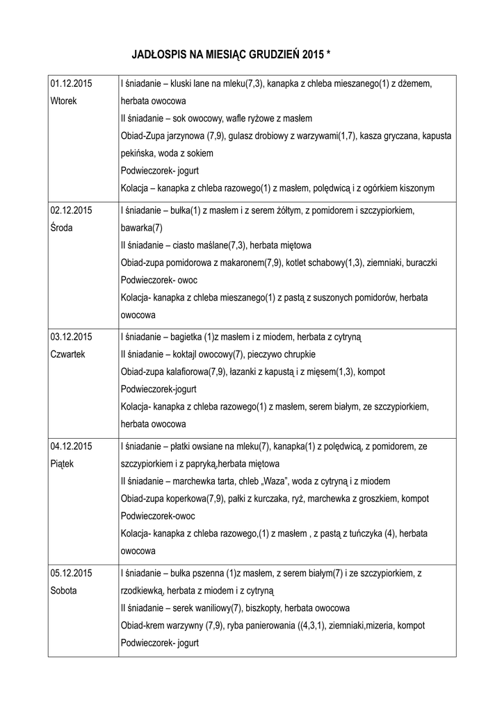 JADŁOSPIS NA MIESIĄC GRUDZIEŃ 2015 * 01.12.2015 I śniadanie – kluski lane na mleku(7,3), kanapka z chleba mieszanego(1) z dżemem, Wtorek herbata owocowa II śniadanie – sok owocowy, wafle ryżowe z masłem Obiad-Zupa jarzynowa (7,9), gulasz drobiowy z warzywami(1,7), kasza gryczana, kapusta pekińska, woda z sokiem Podwieczorek- jogurt Kolacja – kanapka z chleba razowego(1) z masłem, polędwicą i z ogórkiem kiszonym 02.12.2015 I śniadanie – bułka(1) z masłem i z serem żółtym, z pomidorem i szczypiorkiem, Środa bawarka(7) II śniadanie – ciasto maślane(7,3), herbata miętowa Obiad-zupa pomidorowa z makaronem(7,9), kotlet schabowy(1,3), ziemniaki, buraczki Podwieczorek- owoc Kolacja- kanapka z chleba mieszanego(1) z pastą z suszonych pomidorów, herbata owocowa 03.12.2015 I śniadanie – bagietka (1)z masłem i z miodem, herbata z cytryną Czwartek II śniadanie – koktajl owocowy(7), pieczywo chrupkie Obiad-zupa kalafiorowa(7,9), łazanki z kapustą i z mięsem(1,3), kompot Podwieczorek-jogurt Kolacja- kanapka z chleba razowego(1) z masłem, serem białym, ze szczypiorkiem, herbata owocowa 04.12.2015 I śniadanie – płatki owsiane na mleku(7), kanapka(1) z polędwicą, z pomidorem, ze Piątek szczypiorkiem i z papryką,herbata miętowa II śniadanie – marchewka tarta, chleb „Waza”, woda z cytryną i z miodem Obiad-zupa koperkowa(7,9), pałki z kurczaka, ryż, marchewka z groszkiem, kompot Podwieczorek-owoc Kolacja- kanapka z chleba razowego,(1) z masłem , z pastą z tuńczyka (4), herbata owocowa 05.12.2015 I śniadanie – bułka pszenna (1)z masłem, z serem białym(7) i ze szczypiorkiem, z Sobota rzodkiewką, herbata z miodem i z cytryną II śniadanie – serek waniliowy(7), biszkopty, herbata owocowa Obiad-krem warzywny (7,9), ryba panierowania ((4,3,1), ziemniaki,mizeria, kompot Podwieczorek- jogurt 07.12.2015 I śniadanie – kanapka(1) z masłem i z dżemem, kakao(7) Poniedziałek II śniadanie- kisiel wiśniowy z jabłkiem tartym Obiad-rosół z makaronem(1,3,9), makaron z serem(1,3,7),kompot Podwieczorek- owoc Kolacja- kanapka z chleba mieszanego(1) z wędliną drobiową z ogórkiem kiszonym herbata z cytryną i miodem 08.12.2015 I śniadanie – parówka z szynki, kanapka (1)z masłem, herbata miętowa Wtorek II śniadanie – galaretka owocowa , herbatniki, woda z cytryną Obiad- krupnik(1,9), pulpety drobiowe w sosie koperkowym(1,3,4), woda z sokiem Podwieczorek-jogurt Kolacja – bułka ziarnista(1) z masłem, z ogórkiem świeżym, ze szczypiorkiem, herbata owocowa 09.12.2015 I śniadanie – Kanapka z chleba razowego z masłem i z bananem, bawarka Środa II śniadanie- ciasto domowe z owocami, herbata miętowa Obiad-zupa brokułowa(7,9), spagetti(1,7), kompot Podwieczorek-owoc Kolacja- Kanapka z chleba mieszanego(1) z masłem, z kiełbasą suchą, z ogórkiem kiszonym, herbat owocowa 10.12.2015 I śniadanie- bułka maślana (1)z serem żółtym, z masłem i pomidorem, herbata z cytryną i Czwartek z miodem II śniadanie – budyń owocowy(7), biszkopt, woda z cytryną Obiad-barszcz czerwony(3,7), kotlet mielony, ziemniaki,czerwona kapusta, kompot Podwieczorek-jogurt Kolacja- kanapka z chleba mieszanego(1), z pasztetem pieczony, z ogórkiem kiszonym, herbata z cytryną i z miodem 11.12.2015 I śniadanie – kluski lane na mleku(7,3), kanapka z chleba mieszanego z dżemem, herbata Piątek owocowa II śniadanie – sok owocowy, wafle ryżowe z masłem Obiad-kapuśniak(9), ryba panierowana(4,1,3), ziemniaki, ogórek korniszon, kompot Podwieczorek-owoc Kolacja – kanapka z chleba razowego(1) z masłem, polędwicą i z ogórkiem kiszonym 12.12.2015 I śniadanie – bułka pszenna(1) z masłem, z serem białym(7) i ze szczypiorkiem, herbata z Sobota miodem i z cytryną II śniadanie – serek waniliowy(7), biszkopty, herbata owocowa Obiad-barszcz biały(3,9), jajko sadzone(3),ziemniaki,kapusta pekińska, kompot Podwieczorek-jogurt 14.12.2015 I śniadanie – bułka z masłem(1) i z serem żółtym, z pomidorem(7) i szczypiorkiem, Poniedziałek bawarka(7) II śniadanie – ciasto maślane(7,3), herbata miętowa Obiad-zupa groszkowa(7,9), risotto z kurczakiem i z warzywami,kompot Podwieczorek- owoc Kolacja- kanapka z chleba mieszanego(1) z pastą z suszonych pomidorów, herbata owocowa 15.12.2015 I śniadanie – bagietka z masłem(1) i z miodem, herbata z cytryną Wtorek II śniadanie – koktajl owocowy, pieczywo chrupkie Obiad-zupa kalafiorowa(7,9), naleśniki z dżemem(1,3), kompot Podwieczorek-jogurt Kolacja- kanapka z chleba razowego(1) z masłem, z kiełbasą podsuszaną, ze szczypiorkiem, herbata owocowa 16.12.2015 I śniadanie – płatki owsiane na mleku(7), kanapka z polędwicą, z pomidorem, ze Środa szczypiorkiem,herbata miętowa II śniadanie – babka piaskowa(7,3), woda z cytryną i z miodem Obiad-zupa pomidorowa z ryżem(7,9), gołąbki z mięsem w formie kotlecików, ziemniaki, kapusta kiszona, kompot Podwieczorek- owoc Kolacja- kanapka z chleba razowego(1), z masłem , z pastą z suszonych pomidorów, herbata owocowa 17.12.2015 I śniadanie – kanapka z masłem(1) i z dżemem, kakao(7) Czwartek II śniadanie- kisiel wiśniowy z jabłkiem tartym Obiad-zupa koperkowa(7,9), pałki z kurczaka, ryż, brokuł, woda z sokiem Podwieczorek- jogurt Kolacja- kanapka z chleba mieszanego(1) z wędliną drobiową z ogórkiem kiszonym herbata z cytryną i miodem 18.12.2015 I śniadanie – parówka z szynki, kanapka(1) z masłem, herbata miętowa Piątek II śniadanie – galaretka owocowa , herbatniki, woda z cytryną Obiad- barszcz ukraiński(1,9),ryba po grecku(1,3,4,7,9), ziemniaki, marchew z jabłkiem, kompot Podwieczorek-owoc Kolacja – bułka ziarnista(1) z masłem, z ogórkiem świeżym, ze szczypiorkiem, herbata owocowa 19.12.2015 I śniadanie – kanapka z chleba mieszanego(1) z masłem z szynką z indyka, szczypiorek, Sobota herbata owocowa II śniadanie – chleb „Waza” z dżemem truskawkowym, sok owocowy Obiad-zupa jarz