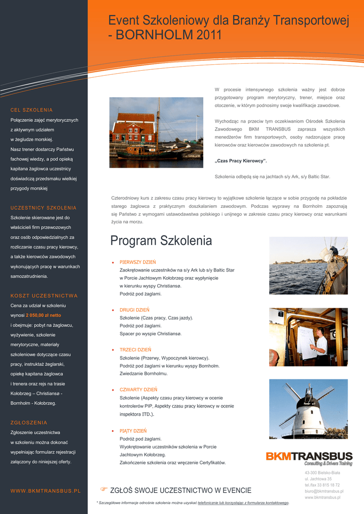Event Szkoleniowy dla Branży Transportowej - BORNHOLM 2011 W procesie intensywnego szkolenia ważny jest dobrze przygotowany program merytoryczny, trener, miejsce oraz otoczenie, w którym podnosimy swoje kwalifikacje zawodowe. CEL SZKOLENIA Połączenie zajęć merytorycznych Wychodząc na przeciw tym oczekiwaniom Ośrodek Szkolenia z aktywnym udziałem Zawodowego BKM TRANSBUS zaprasza wszystkich menedżerów firm transportowych, osoby nadzorujące pracę w żegludze morskiej. kierowców oraz kierowców zawodowych na szkolenia pt. Nasz trener dostarczy Państwu fachowej wiedzy, a pod opieką „Czas Pracy Kierowcy”. kapitana żaglowca uczestnicy Szkolenia odbędą się na jachtach s/y Ark, s/y Baltic Star. doświadczą przedsmaku wielkiej przygody morskiej Czterodniowy kurs z zakresu czasu pracy kierowcy to wyjątkowe szkolenie łączące w sobie przygodę na pokładzie UCZESTNICY SZKOLENIA Szkolenie skierowane jest do starego żaglowca z praktycznym doszkalaniem zawodowym. Podczas wyprawy na Bornholm zapoznają się Państwo z wymogami ustawodawstwa polskiego i unijnego w zakresie czasu pracy kierowcy oraz warunkami życia na morzu. właścicieli firm przewozowych oraz osób odpowiedzialnych za rozliczanie czasu pracy kierowcy, a także kierowców zawodowych wykonujących pracę w warunkach samozatrudnienia. Program Szkolenia PIERWSZY DZIEŃ Zaokrętowanie uczestników na s/y Ark lub s/y Baltic Star w Porcie Jachtowym Kołobrzeg oraz wypłynięcie w kierunku wyspy Christiansø. KOSZT UCZESTNICTWA Podróż pod żaglami. Cena za udział w szkoleniu DRUGI DZIEŃ wynosi 2 050,00 zł netto Szkolenie (Czas pracy, Czas jazdy). i obejmuje: pobyt na żaglowcu, Podróż pod żaglami. wyżywienie, szkolenie Spacer po wyspie Christiansø. merytoryczne, materiały TRZECI DZIEŃ szkoleniowe dotyczące czasu Szkolenie (Przerwy, Wypoczynek kierowcy). pracy, instruktaż żeglarski, Podróż pod żaglami w kierunku wyspy Bornholm. opiekę kapitana żaglowca Zwiedzanie Bornholmu. i trenera oraz rejs na trasie Kołobrzeg – Christiansø - CZWARTY DZIEŃ Szkolenie (Aspekty czasu pracy kierowcy w ocenie Bornholm - Kołobrzeg. kontrolerów PIP, Aspekty czasu pracy kierowcy w ocenie inspektora ITD.). ZGŁOSZENIA Zgłoszenie uczestnictwa w szkoleniu można dokonać wypełniając formularz rejestracji załączony do niniejszej oferty. WWW .BKMTRANSBUS.PL PIĄTY DZIEŃ Podróż pod żaglami. Wyokrętowanie uczestników szkolenia w Porcie Jachtowym Kołobrzeg. Zakończenie szkolenia oraz wręczenie Certyfikatów. ZGŁOŚ SWOJE UCZESTNICTWO W EVENCIE * Szczegółowe informacje odnośnie szkolenia można uzyskać telefonicznie lub korzystając z formularza kontaktowego. 43-300 Bielsko-Biała ul. Jachtowa 35 tel./fax 33 815 18 72 [email protected] www.bkmtransbus.pl