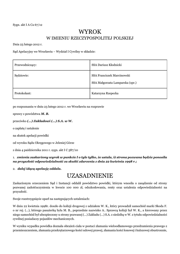 Sygn. akt I A Ca 67/12 WYROK W IMIENIU RZECZYPOSPOLITEJ POLSKIEJ Dnia 23 lutego 2012 r. Sąd Apelacyjny we Wrocławiu – Wydział I Cywilny w składzie: Przewodniczący: SSA Dariusz Kłodnicki Sędziowie: SSA Franciszek Marcinowski SSA Małgorzata Lamparska (spr.) Protokolant: Katarzyna Rzepecka po rozpoznaniu w dniu 23 lutego 2012 r. we Wrocławiu na rozprawie sprawy z powództwa M. B. przeciwko (...) Zakładowi (...) S.A. w W. o zapłatę i ustalenie na skutek apelacji powódki od wyroku Sądu Okręgowego w Jeleniej Górze z dnia 4 października 2011 r. sygn. akt I C 587/10 1. zmienia zaskarżony wyrok w punkcie I o tyle tylko, że ustala, iż strona pozwana będzie ponosiła na przyszłość odpowiedzialność za skutki zdarzenia z dnia 22 kwietnia 1998 r.; 2. dalej idącą apelację oddala. UZASADNIENIE Zaskarżonym orzeczeniem Sąd i Instancji oddalił powództwo powódki, którym wnosiła o zasądzenie od strony pozwanej zadośćuczynienia w kwocie 100 000 zł, odszkodowania, renty oraz ustalenia odpowiedzialności na przyszłość. Swoje rozstrzygnięcie oparł na następujących ustaleniach: W dniu 22 kwietnia 1998r. doszło do kolizji drogowej z udziałem W. K., który prowadził samochód marki Skoda F. o nr rej. (...), którego pasażerką była M. B., poprzednie nazwisko A.. Sprawcą kolizji był W. K., a kierowany przez niego samochód był ubezpieczony u strony pozwanej (...) Zakładu (...) S.A. z siedzibą w W. z tytułu odpowiedzialności cywilnej posiadaczy pojazdów mechanicznych. W wyniku wypadku powódka doznała obrażeń ciała w postaci złamania wieloodłamowego przedramienia prawego z przemieszczeniem, złamania przekrętarzowego kości udowej prawej, złamania kości łonowej i kulszowej obustronnie, złamania kości III i IV śródręcza lewego, uszkodzenia rogówki prawego oka z upośledzeniem widzenia, a także licznych ran szarpano-tłuczeniowych prawej strony twarzy, szyi, klatki piersiowej, kończyny górnej prawej i lewej, dolnej prawej, uszkodzenia urazowego zębów 1, 2 prawego górnego 1, 2 lewego górnego. M. B. doznała również powierzchownego uszkodzenia rogówki oka lewego. W chwili wypadku M. B. miała 19 lat i była uczennicą ostatniej klasy liceum ogólnokształcącego o profilu ekonomicznym. Uzyskiwała dobre wyniki w nauce i zamierzała przystąpić do egzaminu maturalnego. W następstwie zdarzenia z dnia 22 kwietnia 1998r., nie przystąpiła do egzaminu maturalnego w roku 1998r. Natomiast przystępując do matury w roku 1999r. uzyskała wynik niedostateczny. W toku leczenia powódce założono wyciąg szkieletowy nadłokciowy w obrębie uda prawego, nastawiono załamanie obu kości przedramienia prawego oraz unieruchomiono złamanie w obrębie kości śródręcza lewego. Bezpośrednio po wypadku, w czasie trwania leczenia ortopedycznego, do dnia 26 lutego 1999r. M. B. wymagała pomocy osób trzecich. Pod koniec 1999r. powódka, za namową rodziców, pojęła pracę w szpitalu na stanowisku referenta za wynagrodzeniem około 700 zł netto. Pracę wykonywała na podstawie umowy na czas określony, przez niecałe pół roku. Następnie pracowała w firmie (...), jako osoba sprzątająca uzyskując wynagrodzenie w kwocie ok. 900- 920 zł. M. B. z pracy tej zrezygnowała po ok. 7 miesiącach, gdyż jako alergik stykała się ze środkami chemicznymi co źle wpływało na jej zdrowie. M. B. korzystała w 2000r. z usługi medycznej (...) K. za co zapłaciła 400 zł. W tym samym roku wobec poszkodowanej wykonano korekcję pourazową czoła i brody, za którą zapłaciła 600 zł. Ubezpieczyciel określił poniesiony przez powódkę uszczerbek na zdrowiu łącznie na 133% ( 103% w dniu 20.03.1999r. i 30% w dniu 30.03.1999r.). Wyniku postępowania likwidacyjnego poszkodowanej został wypłacony zwrot kosztów leczenia w wysokości 1.595,35 zł obejmujący między innymi wydatki poniesione przez M. B. na usługi medyczne w (...) P. K. w sumie 1.000 zł. Następnie ubezpieczyciel przyznał dalszą część świadczenia w kwocie 70.000 zł tytułem zadośćuczynienia z krzywdę, a także w kwocie 6.500 zł tytułem odszkodowania. Oprócz zwrotu kosztów leczenia wypłacono powódce kwotę 500 zł z tytułu zwrotu kosztów zniszczonej odzieży. Dnia 20 lutego 2002r. po przeprowadzonych badaniach wydano zaświadczenie lekarskie o stanie zdrowia powódki przygotowane na zlecenie Zespołu do spraw Orzekania o Stopniu Niepełnosprawności. Od tego czasu M. B. miała pełną wiedzę w zakresie poniesionej przez nią szkody doznanej w wyniku wypadku. Pismem z dnia 25 stycznia 2010r. powódka wezwała ubezpieczyciela do zapłaty zadośćuczynienia w kwocie 100.000 zł, zwrotu kosztów leczenia w kwocie 1.000 zł, comiesięcznej renty związanej ze zmniejszeniem widoków na przyszłość w kwocie 1.317 zł płatnej do dnia 10-go każdego miesiąca począwszy od lutego 2010r., skapitalizowanej renty związanej ze zmniejszeniem widoków na przyszłość za okres od dnia stycznia 2007r. do dnia stycznia 2010r. w kwocie 47.412 zł. Obecnie M. B. wykazuje liczne zagojone, niesymetryczne blizny na twarzy, szyi, w okolicy mostka, dłoni lewej oraz blizny pooperacyjne na przedramieniu prawym. Skutki wypadku, w postaci bólów zlokalizowanych w zespole miednicy, kręgosłupie lędźwiowym, oraz biodrze i nodze, poszkodowana odczuwa również w chwili obecnej. Dolegliwości pojawiają się głównie przy wysiłkach fizycznych. Procentowe uszkodzenie ciała powódki związane z wypadkiem ze względów na zaburzenia adaptacyjne będące następstwem urazów i wypadków, w których nie doszło do trwałych uszkodzeń OUN wynosi 7%, na uszkodzenie powłok twarzy (blizny i ubytki oceniane bez zaburzeń funkcji i ubytków powłok twarzy) - 3% oraz na izolowane złamania miednicy w zależności od zniekształcenia i zaburzeń funkcji - 5%. Obecnie poszkodowana nie wymaga pomocy osób trzecich. Z przyczyn okulistycznych łączny uszczerbek na zdrowiu poszkodowanej związany z 