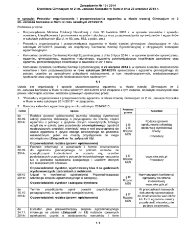 Zarządzenie Nr 19 / 2014 Dyrektora Gimnazjum nr 2 im. Janusza Korczaka w Rumi z dnia 23 września 2014 r. w sprawie: Procedur organizowania i przeprowadzania egzaminu w klasie trzeciej Gimnazjum nr 2 im. Janusza Korczaka w Rumi w roku szkolnym 2014/2015 Podstawa prawna: Rozporządzenie Ministra Edukacji Narodowej z dnia 30 kwietnia 2007 r. w sprawie warunków i sposobu oceniania, klasyfikowania i promowania uczniów i słuchaczy oraz przeprowadzania sprawdzianów i egzaminów w szkołach publicznych (Dz.U. nr 83, poz. 562, z późn. zm.) Procedury organizowania i przeprowadzania egzaminu w klasie trzeciej gimnazjum obowiązujące w roku szkolnym 2014/2015 powstały we współpracy Centralnej Komisji Egzaminacyjnej z okręgowymi komisjami egzaminacyjnymi. Komunikat dyrektora Centralnej Komisji Egzaminacyjnej z dnia 3 lipca 2014 r. w sprawie terminów sprawdzianu, egzaminu gimnazjalnego, egzaminu maturalnego, egzaminu potwierdzającego kwalifikacje zawodowe oraz egzaminu potwierdzającego kwalifikacje w zawodzie w 2015 roku Komunikat dyrektora Centralnej Komisji Egzaminacyjnej z 29 sierpnia 2014 r. w sprawie sposobu dostosowania warunków i form przeprowadzania w roku szkolnym 2014/2015 sprawdzianu i egzaminu gimnazjalnego do potrzeb uczniów ze specjalnymi potrzebami edukacyjnymi, w tym niepełnosprawnych, niedostosowanych społecznie oraz zagrożonych niedostosowaniem społecznym §1 Ustala się organizację i sposób przeprowadzenia egzaminu w klasie trzeciej Gimnazjum nr 2 im. Janusza Korczaka w Rumi w roku szkolnym 2014/2015 oraz związane z tym zadania, obowiązki nauczycieli oraz prawa i obowiązki uczniów i rodziców (prawnych opiekunów) przez: 1. "Procedury organizowania i przeprowadzania egzaminu w klasie trzeciej Gimnazjum nr 2 im. Janusza Korczaka w Rumi w roku szkolnym 2014/2015" - w załączeniu. 2. Ramowy kalendarz egzaminacyjny w roku szkolnym 2014/2015 Podstawa prawna Termin Sprawa do 30.09. 2014r. Rodzice (prawni opiekunowie) uczniów składają dyrektorowi szkoły pisemną deklarację o przystąpieniu do trzeciej części egzaminu z jednego z języków obcych nowożytnych, którego uczyli się w szkole, jako przedmiotu obowiązkowego (spośród następujących: angielski, niemiecki) oraz o woli przystąpienia do części egzaminu z języka obcego nowożytnego na poziomie rozszerzonym, jeżeli nie muszą przystępować do niego obowiązkowo (Załącznik nr 1a, załącznik 1b). do 30.09. 2014r. 09/10 2014r. Odpowiedzialni: rodzice (prawni opiekunowie) Podanie informacji o warunkach i formie dostosowania do egzaminu gimnazjalnego do potrzeb uczniów ze specyficznymi trudnościami w uczeniu się, uczniów posiadających orzeczenie o potrzebie indywidualnego nauczania lub o potrzebie kształcenia specjalnego i uczniów chorych lub niesprawnych czasowo. Odpowiedzialni: dyrektor, wychowawcy klas 3 na godzinach wychowawczych i zebraniach z rodzicami. Udział w konferencji szkoleniowej Przewodniczącego szkolnego zespołu egzaminacyjnego (i zastępcy). Odpowiedzialni: dyrektor i zastępca dyrektora do 15.10. 2014r. Termin przedłożenia opinii poradni psychologicznopedagogicznej, w tym poradni specjalistycznej. do 24.11. 2014r. Dyrektor, jako przewodniczący zespołu egzaminacyjnego informuje na piśmie (Załącznik nr 13) rodziców (prawnych opiekunów) ucznia o dostosowaniu warunków i form Odpowiedzialni: rodzice (prawni opiekunowie) 1/5 § 35 § 36 Rozporz. MEN Komentarz Rodzice (prawni opiekunowie) składają deklarację dyrektorowi szkoły. Procedury § 37 Rozporz. MEN www.cke.edu.pl Procedury § 40 Rozporz. MEN Harmonogram konferencji ogłoszony na stronie internetowej www.oke.gda.pl § 37 Rozporz. MEN W przypadkach losowych dokumenty uprawniające do dostosowania warunków lub form egzaminu należy przedstawić niezwłocznie po jego otrzymaniu. przeprowadzania egzaminu do jego dysfunkcji. do 28.11. 2014r. do 28.11. 2014r. Rodzice (prawni opiekunowie) ucznia składają oświadczenie o skorzystaniu lub rezygnacji z przyznanych uczniowi dostosowań (również w Załączniku nr 13). Odpowiedzialni: rodzice (prawni opiekunowie) Wychowawcy klas 3 dostarczają do wicedyrektora: § 37 Rozporz. MEN - koperty z imieniem, nazwiskiem, numerem PESEL, kodem zdającego (Załącznik nr 17) Przewodniczący zespołu nadzorującego wicedyrektora: Egzamin próbny 9, 10, 11 grudnia 2014r. dostarczają do - kartki z numerami stolików i kartki do losowania (Załącznik nr 18) do 30.11. 2014r. Dyrektor gimnazjum w terminie ustalonym przez dyrektora Okręgowej Komisji Egzaminacyjnej w Gdańsku, ale nie później niż do 30 listopada 2014 r. roku szkolnego, w którym odbywa się egzamin, jest zobowiązany przekazać w formie elektronicznej do OKE listę uczniów przystępujących do egzaminu zawierającą: imię (imiona) i nazwisko ucznia, numer PESEL, miejsce urodzenia, datę urodzenia, płeć, informację o specyficznych trudnościach w uczeniu się, rodzaj arkusza egzaminacyjnego, symbol oddziału i numer ucznia w dzienniku lekcyjnym, numer sali, w której uczeń przystąpi do egzaminu. 09.12. 2014r. Odpowiedzialni: dyrektor, sekretarz szkoły Przeprowadzenie próbnego egzaminu gimnazjalnego w części humanistycznej. 10.12. 2014r. Przeprowadzenie próbnego egzaminu gimnazjalnego w części matematyczno-przyrodniczej. 11.12. 2014r. Przeprowadzenie próbnego egzaminu gimnazjalnego z zakresu języka obcego nowożytnego. do 31.12. 2014r. Dyrektor szkoły, w sposób określony przez dyrektora OKE, informuje na piśmie o liczbie poszczególnych rodzajów arkuszy egzaminacyjnych (tj. symbol arkusza – liczba arkuszy) od stycznia 2015r. Otwarcie Serwisu dla ucznia na stronie www.oke.gda.pl Serwis OKE serwis dla uczniów § 41 Rozporz. MEN Procedury OKE w celu sprawdzenia poprawności swoich danych osobowych i ewentualne błędy uczeń powinien zgłosić dyrektorowi szkoły. OKE Odpowiedzialni: dyrektor do 21.01. 2015r. Rodzice (prawni opiekunowie) uczniów składają dyrektorowi szkoły pisemną 