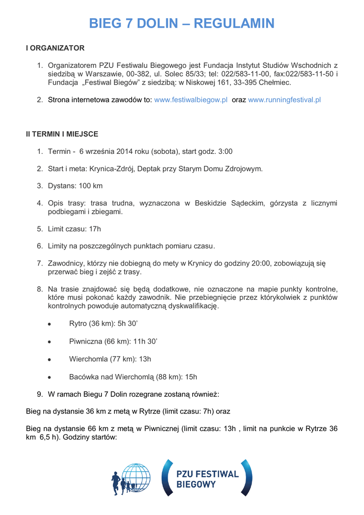 BIEG 7 DOLIN – REGULAMIN I ORGANIZATOR 1. Organizatorem PZU Festiwalu Biegowego jest Fundacja Instytut Studiów Wschodnich z siedzibą w Warszawie, 00-382, ul. Solec 85/33; tel: 022/583-11-00, fax:022/583-11-50 i Fundacja „Festiwal Biegów” z siedzibą: w Niskowej 161, 33-395 Chełmiec. 2. Strona internetowa zawodów to: www.festiwalbiegow.pl oraz www.runningfestival.pl II TERMIN I MIEJSCE 1. Termin - 6 września 2014 roku (sobota), start godz. 3:00 2. Start i meta: Krynica-Zdrój, Deptak przy Starym Domu Zdrojowym. 3. Dystans: 100 km 4. Opis trasy: trasa trudna, wyznaczona w Beskidzie Sądeckim, górzysta z licznymi podbiegami i zbiegami. 5. Limit czasu: 17h 6. Limity na poszczególnych punktach pomiaru czasu. 7. Zawodnicy, którzy nie dobiegną do mety w Krynicy do godziny 20:00, zobowiązują się przerwać bieg i zejść z trasy. 8. Na trasie znajdować się będą dodatkowe, nie oznaczone na mapie punkty kontrolne, które musi pokonać każdy zawodnik. Nie przebiegnięcie przez którykolwiek z punktów kontrolnych powoduje automatyczną dyskwalifikację. Rytro (36 km): 5h 30’ Piwniczna (66 km): 11h 30’ Wierchomla (77 km): 13h Bacówka nad Wierchomlą (88 km): 15h 9. W ramach Biegu 7 Dolin rozegrane zostaną również: Bieg na dystansie 36 km z metą w Rytrze (limit czasu: 7h) oraz Bieg na dystansie 66 km z metą w Piwnicznej (limit czasu: 13h , limit na punkcie w Rytrze 36 km 6,5 h). Godziny startów: BIEG 7 DOLIN – REGULAMIN 3:10 - Bieg na 66 km. Start: Krynica-Zdrój, meta: Piwniczna Zdrój 3:20 - Bieg na 36 km. Start Krynica-Zdrój, meta: Rytro 10. Uwagi ogólne: zawodnicy uczestniczący w Biegu 7 Dolin na dystansie 100 km, którzy nie zmieszczą się w limitach czasowych na poszczególnych punktach pomiaru czasu: Rytro (36 km): 5h 30’ Piwniczna (66 km): 11h 30’ Wierchomla (77 km): 13h Bacówka nad Wierchomlą (88 km): 15h bądź z innych względów nie będą mogli kontynuować biegu otrzymają pamiątkowy medal a ich czasy osiągnięte na 36, 66, 77 i 88 km znajdą się w oficjalnym komunikacie końcowym Biegu 7 Dolin na dystansie 100 km. Podobnie startujący w biegu na 66 km, którzy zakończą rywalizację Rytrze otrzymają pamiątkowy medal, a ich wynik osiągnięty na 36 km znajdzie się w komunikacie końcowym Biegu na 66 km. Wyniki zawodników, którzy wystartowali na 100 i 66 km, a zakończyli rywalizację wcześniej, nie będą brane pod uwagę w ustalaniu klasyfikacji końcowej Biegu na 66 km i Biegu na 36 km. Wszyscy zawodnicy, którzy ukończą Bieg 7 Dolin na 100 km w limicie czasowym, otrzymają na mecie w Krynicy-Zdrój specjalny, limitowany medal. 11. Każdy zawodnik musi posiadać przy sobie: aktywny, dobrze naładowany, telefon komórkowy (którego numer jest odnotowany na karcie zgłoszenia wraz z kontaktem do osoby najbliższej) latarkę (czołówkę) Ponadto, każdy zawodnik musi posiadać podstawowe ubezpieczenie zdrowotne (nie ma wymogu zabierania ze sobą dowodu ubezpieczenia). III UCZESTNICY 1. Wszyscy zawodnicy, którzy zarejestrują się przez elektroniczny formularz lub w biurze zawodów, uiszczą opłatę, odbiorą numer startowy, a w dniu 6 września 2014 będą mieli ukończone 18 lat. BIEG 7 DOLIN – REGULAMIN IV ZGŁOSZENIA 1. Zgłoszenia przyjmowane są na stronie www.festiwalbiegow.pl. Istnieje możliwość zgłoszenia się do biegów Festiwalu bezpośrednio w biurze zawodów w dniu 5 września. 2. Zarejestrowany zawodnik, który poprawnie wypełnił kartę zgłoszenia i uiścił opłatę, otrzymuje w biurze zawodów numer startowy, który widnieje przy jego nazwisku na liście startowej. 3. Zgłoszenie każdego zawodnika powinno być własnoręcznie podpisane. Podpis na karcie rejestracji można złożyć przy odbiorze numeru startowego w biurze zawodów lub przesyłając podpisaną kartę rejestracji bezpośrednio do biura organizatora. 4. Opłaty startowe zawarte są w Regulaminie PZU Festiwalu Biegowego. V KLASYFIKACJE 1. W biegu na dystansie 100 km prowadzone będą następujące klasyfikacje: a) Klasyfikacja generalna kobiet i mężczyzn. b) klasyfikacje wiekowe mężczyzn: 18-29, 30-39, 40-49, powyżej 50 lat 2. W biegu na dystansie 66 km prowadzone będą następujące klasyfikacje: a) Klasyfikacja generalna kobiet i mężczyzn. 3. W biegu na dystansie 36 km prowadzone będą następujące klasyfikacje: a) Klasyfikacja generalna kobiet i mężczyzn VI NAGRODY 1. Zwycięzcy w klasyfikacji generalnej oraz klasyfikacjach wiekowych otrzymują nagrody według tabeli nagród znajdującej się w REGULAMINIE PZU FESTIWALU BIEGOWEGO. VII POSTANOWIENIA KOŃCOWE 1. Regulamin jest spójny z postanowieniami Regulaminu PZU Festiwalu Biegowego. 2. Ostateczna interpretacja regulaminu należy do Organizatorów.