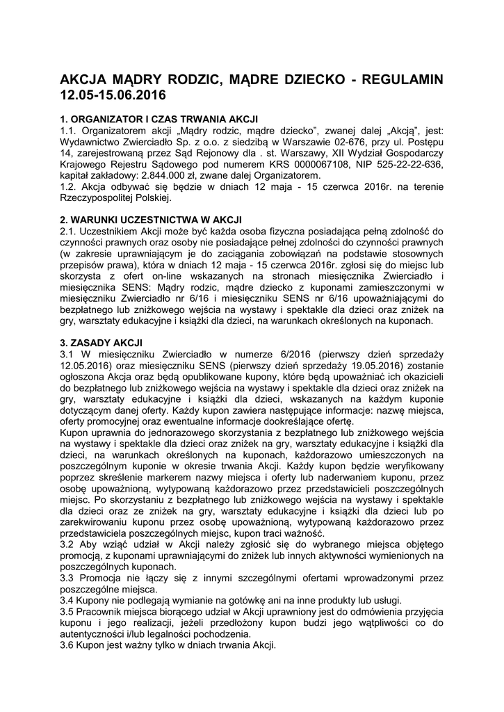 AKCJA MĄDRY RODZIC, MĄDRE DZIECKO - REGULAMIN 12.05-15.06.2016 1. ORGANIZATOR I CZAS TRWANIA AKCJI 1.1. Organizatorem akcji „Mądry rodzic, mądre dziecko”, zwanej dalej „Akcją”, jest: Wydawnictwo Zwierciadło Sp. z o.o. z siedzibą w Warszawie 02-676, przy ul. Postępu 14, zarejestrowaną przez Sąd Rejonowy dla . st. Warszawy, XII Wydział Gospodarczy Krajowego Rejestru Sądowego pod numerem KRS 0000067108, NIP 525-22-22-636, kapitał zakładowy: 2.844.000 zł, zwane dalej Organizatorem. 1.2. Akcja odbywać się będzie w dniach 12 maja - 15 czerwca 2016r. na terenie Rzeczypospolitej Polskiej. 2. WARUNKI UCZESTNICTWA W AKCJI 2.1. Uczestnikiem Akcji może być każda osoba fizyczna posiadająca pełną zdolność do czynności prawnych oraz osoby nie posiadające pełnej zdolności do czynności prawnych (w zakresie uprawniającym je do zaciągania zobowiązań na podstawie stosownych przepisów prawa), która w dniach 12 maja - 15 czerwca 2016r. zgłosi się do miejsc lub skorzysta z ofert on-line wskazanych na stronach miesięcznika Zwierciadło i miesięcznika SENS: Mądry rodzic, mądre dziecko z kuponami zamieszczonymi w miesięczniku Zwierciadło nr 6/16 i miesięczniku SENS nr 6/16 upoważniającymi do bezpłatnego lub zniżkowego wejścia na wystawy i spektakle dla dzieci oraz zniżek na gry, warsztaty edukacyjne i książki dla dzieci, na warunkach określonych na kuponach. 3. ZASADY AKCJI 3.1 W miesięczniku Zwierciadło w numerze 6/2016 (pierwszy dzień sprzedaży 12.05.2016) oraz miesięczniku SENS (pierwszy dzień sprzedaży 19.05.2016) zostanie ogłoszona Akcja oraz będą opublikowane kupony, które będą upoważniać ich okazicieli do bezpłatnego lub zniżkowego wejścia na wystawy i spektakle dla dzieci oraz zniżek na gry, warsztaty edukacyjne i książki dla dzieci, wskazanych na każdym kuponie dotyczącym danej oferty. Każdy kupon zawiera następujące informacje: nazwę miejsca, oferty promocyjnej oraz ewentualne informacje dookreślające ofertę. Kupon uprawnia do jednorazowego skorzystania z bezpłatnego lub zniżkowego wejścia na wystawy i spektakle dla dzieci oraz zniżek na gry, warsztaty edukacyjne i książki dla dzieci, na warunkach określonych na kuponach, każdorazowo umieszczonych na poszczególnym kuponie w okresie trwania Akcji. Każdy kupon będzie weryfikowany poprzez skreślenie markerem nazwy miejsca i oferty lub naderwaniem kuponu, przez osobę upoważnioną, wytypowaną każdorazowo przez przedstawicieli poszczególnych miejsc. Po skorzystaniu z bezpłatnego lub zniżkowego wejścia na wystawy i spektakle dla dzieci oraz ze zniżek na gry, warsztaty edukacyjne i książki dla dzieci lub po zarekwirowaniu kuponu przez osobę upoważnioną, wytypowaną każdorazowo przez przedstawiciela poszczególnych miejsc, kupon traci ważność. 3.2 Aby wziąć udział w Akcji należy zgłosić się do wybranego miejsca objętego promocją, z kuponami uprawniającymi do zniżek lub innych aktywności wymienionych na poszczególnych kuponach. 3.3 Promocja nie łączy się z innymi szczególnymi ofertami wprowadzonymi przez poszczególne miejsca. 3.4 Kupony nie podlegają wymianie na gotówkę ani na inne produkty lub usługi. 3.5 Pracownik miejsca biorącego udział w Akcji uprawniony jest do odmówienia przyjęcia kuponu i jego realizacji, jeżeli przedłożony kupon budzi jego wątpliwości co do autentyczności i/lub legalności pochodzenia. 3.6 Kupon jest ważny tylko w dniach trwania Akcji. 3.7 Kupon jest ważny dla 1 osoby, chyba że oferta zamieszczona na kuponie stanowi inaczej. 3.8 Udział w Akcji jest dobrowolny i bezpłatny. 3.9.Osoby korzystające z każdej oferty obowiązuje regulamin poszczególnych miejsc biorących udział w Akcji. 4. POSTANOWIENIA KOŃCOWE 4.1. Reklamacje dotyczące przebiegu Akcji powinny być zgłaszane pocztą elektroniczną na adres: [email protected] z tytułem maila „kupony” lub listownie na adres Organizatora w terminie do 19 czerwca 2016r. (w przypadku przesłania reklamacji złożonej listownie decyduje data nadania - stempla pocztowego na reklamacji). Reklamacja powinna zawierać co najmniej adres (listowny lub elektroniczny) lub telefon kontaktowy oraz opis zgłaszanych zastrzeżeń. Jeżeli podane w reklamacji dane lub informacje wymagają uzupełnienia, przed rozpatrzeniem reklamacji Organizator zwraca się do składającego reklamację o jej uzupełnienie we wskazanym zakresie. Prawidłowe reklamacje będą rozpatrywane przez Organizatora w terminie 14 dni od otrzymania reklamacji i wysłane w takiej samej formie jak nadana przez zgłaszającego reklamację na jego adres wskazany w reklamacji. 4.2. Decyzja Organizatora co do zgłoszonej reklamacji jest ostateczna, co nie wyłącza prawa osoby składającej reklamację do dochodzenia nieuwzględnionych roszczeń na drodze postępowania sądowego. 4.3. Regulamin niniejszej Akcji jest dostępny w siedzibie Organizatora i na stronie www.zwierciadlo.pl. 4.4. W sprawach nieuregulowanych niniejszym Regulaminem zastosowanie mają przepisy Kodeksu Cywilnego.