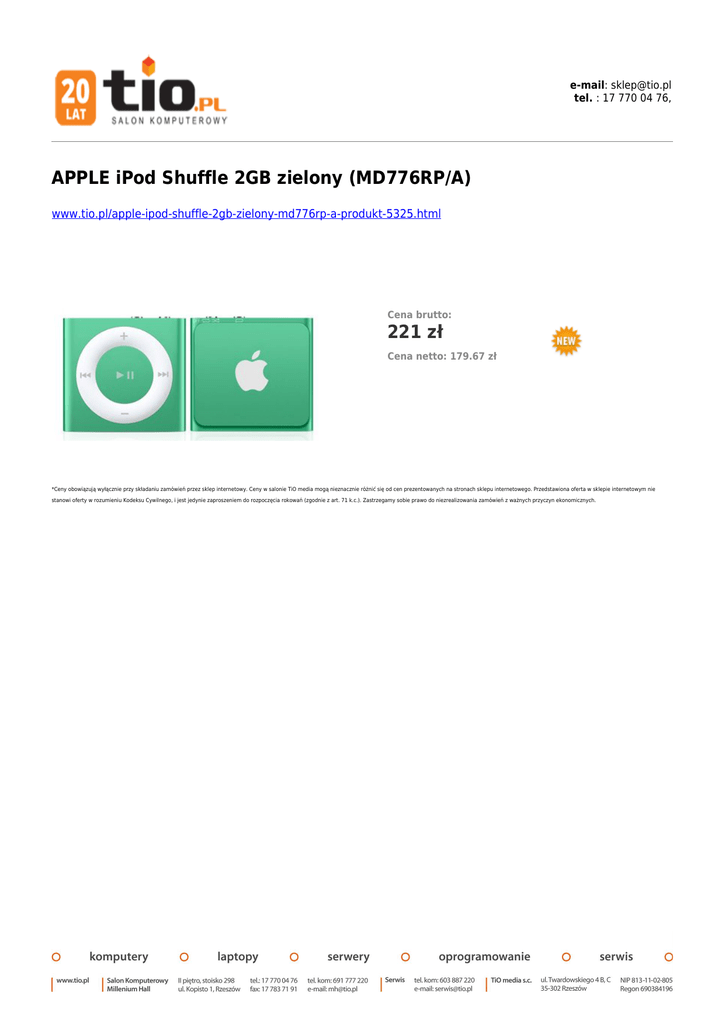 e-mail: [email protected] tel. : 17 770 04 76, APPLE iPod Shuffle 2GB zielony (MD776RP/A) www.tio.pl/apple-ipod-shuffle-2gb-zielony-md776rp-a-produkt-5325.html Cena brutto: 221 zł Cena netto: 179.67 zł *Ceny obowiązują wyłącznie przy składaniu zamówień przez sklep internetowy. Ceny w salonie TiO media mogą nieznacznie różnić się od cen prezentowanych na stronach sklepu internetowego. Przedstawiona oferta w sklepie internetowym nie stanowi oferty w rozumieniu Kodeksu Cywilnego, i jest jedynie zaproszeniem do rozpoczęcia rokowań (zgodnie z art. 71 k.c.). Zastrzegamy sobie prawo do niezrealizowania zamówień z ważnych przyczyn ekonomicznych.