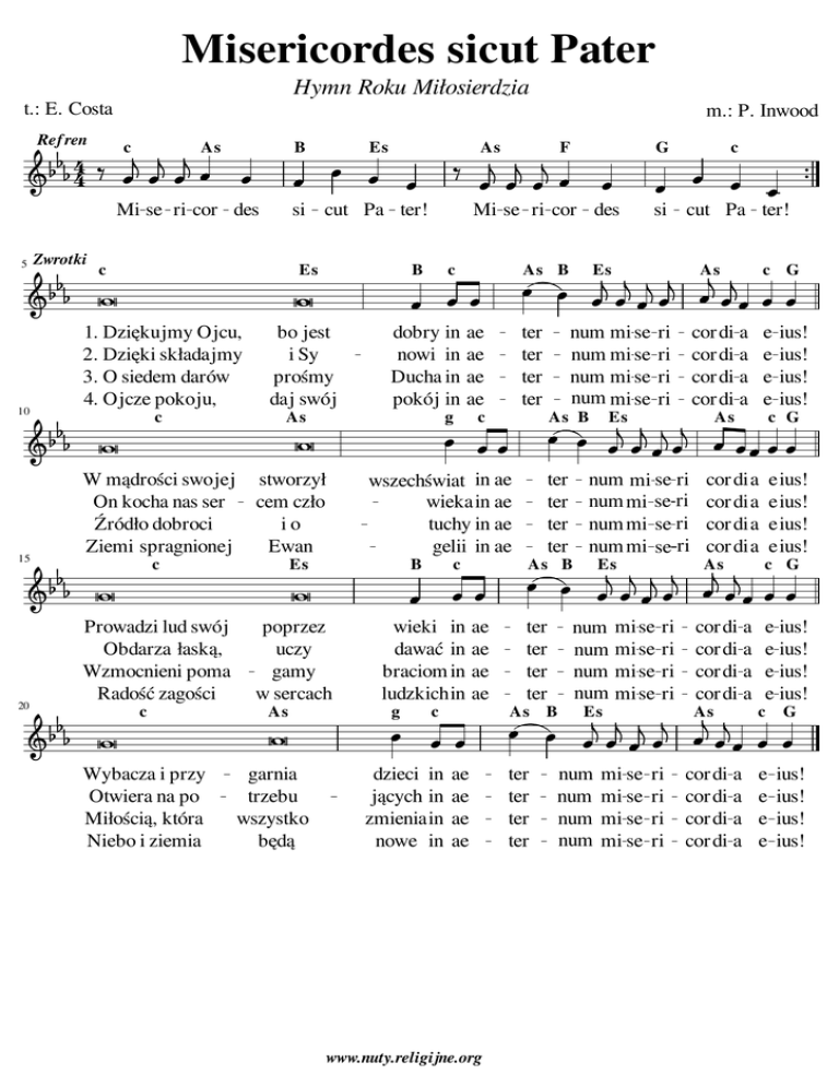 Misericordes sicut Pater Hymn Roku Miłosierdzia t.: E. Costa m.: P. Inwood Refren 4 c As 4 B Zwrotki 10 B c dobry in nowi in Ducha in pokój in As c ter ter ter ter c B c Prowadzi lud swój Obdarza łaską, Wzmocnieni poma Radość zagości c poprzez uczy gamy w sercach As wieki in dawać in braciom in ludzkich in g ae ae ae ae c dzieci in jących in zmienia in nowe in cor di a cor di a cor di a cor di a e e e e ius! ius! ius! ius! As c G ter ter ter ter Es num mi se ri num mi se ri num mi se ri num mi se ri cor di a cor di a cor di a cor di a e ius! e ius! e ius! e ius! Es As c G ter ter ter ter num num num num mi se mi se mi se mi se ri ri ri ri cor di a cor di a cor di a cor di a e ius! e ius! e ius! e ius! As B garnia trzebu wszystko będą ri ri ri ri As B Wybacza i przy Otwiera na po Miłością, która Niebo i ziemia si cut Pa ter! num mi se num mi se num mi se num mi se As B wszechświat in ae wieka in ae tuchy in ae gelii in ae Es Es As c G ae ae ae ae g stworzył cem czło io Ewan c As B W mądrości swojej On kocha nas ser Źródło dobroci Ziemi spragnionej 20 Es bo jest i Sy prośmy daj swój G Mi se ri cor des 15 c c F si cut Pa ter! 1. Dziękujmy Ojcu, 2. Dzięki składajmy 3. O siedem darów 4. Ojcze pokoju, As Mi se ri cor des 5 Es ae ae ae ae www.nuty.religijne.org Es As c G ter ter ter ter num num num num mi se mi se mi se mi se ri ri ri ri cor di a cor di a cor di a cor di a e e e e ius! ius! ius! ius!
