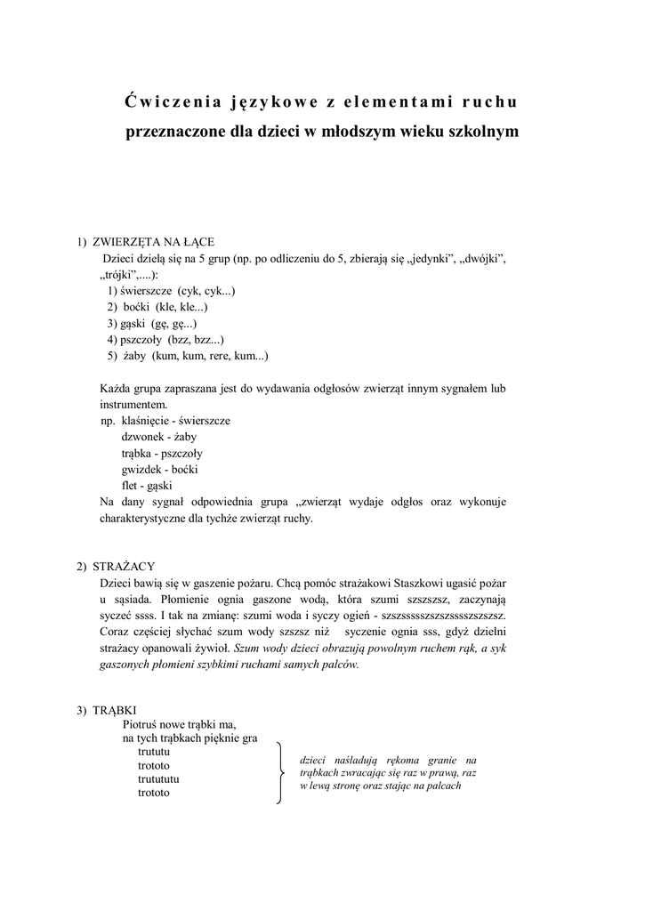 Ćw ic z e nia jęz y ko w e z e l e me nta mi r uc hu przeznaczone dla dzieci w młodszym wieku szkolnym 1) ZWIERZĘTA NA ŁĄCE Dzieci dzielą się na 5 grup (np. po odliczeniu do 5, zbierają się „jedynki”, „dwójki”, „trójki”,....): 1) świerszcze (cyk, cyk...) 2) boćki (kle, kle...) 3) gąski (gę, gę...) 4) pszczoły (bzz, bzz...) 5) żaby (kum, kum, rere, kum...) Każda grupa zapraszana jest do wydawania odgłosów zwierząt innym sygnałem lub instrumentem. np. klaśnięcie - świerszcze dzwonek - żaby trąbka - pszczoły gwizdek - boćki flet - gąski Na dany sygnał odpowiednia grupa „zwierząt wydaje odgłos oraz wykonuje charakterystyczne dla tychże zwierząt ruchy. 2) STRAŻACY Dzieci bawią się w gaszenie pożaru. Chcą pomóc strażakowi Staszkowi ugasić pożar u sąsiada. Płomienie ognia gaszone wodą, która szumi szszszsz, zaczynają syczeć ssss. I tak na zmianę: szumi woda i syczy ogień - szszssssszszszsssszszszsz. Coraz częściej słychać szum wody szszsz niż syczenie ognia sss, gdyż dzielni strażacy opanowali żywioł. Szum wody dzieci obrazują powolnym ruchem rąk, a syk gaszonych płomieni szybkimi ruchami samych palców. 3) TRĄBKI Piotruś nowe trąbki ma, na tych trąbkach pięknie gra trututu trototo trutututu trototo dzieci naśladują rękoma granie na trąbkach zwracając się raz w prawą, raz w lewą stronę oraz stając na palcach 4) TRALA LA W Śpiewowicach, pięknym mieście, Na ulicy Wesolińskiej Mieszka sobie słynny śpiewak Pan Tralisław Tralaliński trala la trala la trala la la trala la trala lo trala lo trala lo lo trala lo Jego żona - Tralalona Jego córka - Tralalurka Jego synek - Tralalinek Jego piesek - Tralalesek trala lu trala lu trala lu lu trala lu trala le trala le trala le le trala le Nauczyciel Dzieci idą według rytmu do przodu, do tyłu, klaszczą w dłonie. Nauczyciel Dzieci idą według rytmu do przodu, do tyłu, klaszczą w dłonie. zwrotki wiersza wg J. Tuwima 5) KACZUSZKI Nad rzeczką, opodal krzaczka Mieszkała kaczka-dziwaczka kaczka szła: człap człap człap potem siadła: kwak kwak kwak Poszła sobie do fryzjera człap człap człap człap człap człap Aby kupić kilo sera kwak kwak kwak kwak kwak kwak A potem poszła do praczki człap człap człap człap człap człap Kupować pocztowe znaczki kwak kwak kwak kwak kwak kwak Wypowiadając „człap człap człap” - dzieci naśladują chód kaczek. Wypowiadając „kwak kwak kwak” - dzieci siadają na dywanie. Opracowanie Maria Radziejewska - logopeda