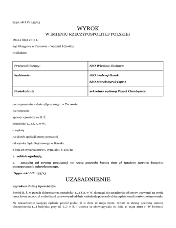 Sygn. akt I Ca 135/13 WYROK W IMIENIU RZECZYPOSPOLITEJ POLSKIEJ Dnia 4 lipca 2013 r. Sąd Okręgowy w Tarnowie – Wydział I Cywilny w składzie: Przewodniczący: SSO Wiesław Zachara Sędziowie: SSO Andrzej Bosak SSO Marek Syrek (spr.) Protokolant: sekretarz sądowy Paweł Chrabąszcz po rozpoznaniu w dniu 4 lipca 2013 r. w Tarnowie na rozprawie sprawy z powództwa B. Ż. przeciwko (...) S. A. w W. o zapłatę na skutek apelacji strony pozwanej od wyroku Sądu Rejonowego w Brzesku z dnia 28 stycznia 2013 r., sygn. akt I C 410/12 1. oddala apelację; 2. zasądza od strony pozwanej na rzecz powoda kwotę 600 zł tytułem zwrotu kosztów postępowania odwoławczego. Sygn. akt I Ca 135/13 UZASADNIENIE wyroku z dnia 4 lipca 2013r. Powód B. Ż. w pozwie skierowanym przeciwko (...) S.A. w W. domagał się zasądzenia od strony pozwanej na swoją rzecz kwoty 10.000 zł z odsetkami ustawowymi od dnia wniesienia pozwu do dnia zapłaty oraz kosztów postępowania. Na uzasadnienie swojego żądania powód podał, iż w dniu 12 maja 2011r. zawarł ze stroną pozwaną umowę ubezpieczenia (...) budynku przy ul. (...) w B. i umowa ta obowiązywała do dnia 11 maja 2012 r. W kwietniu 2012 r. doszło do zalania parkietu bukowego, znajdującego się na parterze budynku, zaś poniesione przez niego celem usunięcia skutków zalania koszty zamknęły się w łącznej kwocie 10.000 zł. Strona pozwana odmówiła jednak wypłaty odszkodowania powołując się na to, że budynek jest wykorzystywany w innym celu niż oznaczony w umowie ubezpieczenia. Zdaniem powoda odmowa ta była bezpodstawna, gdyż zarówno z dokumentacji budynku, jak i z układu i wielkości znajdujących się w nim pomieszczeń wynika, iż przedmiotowy budynek jest wykorzystywany do prowadzenia działalności gospodarczej, a nie – jak przyjęła to strona pozwana w umowie ubezpieczenia – ma charakter mieszkalny. Strona pozwana, jako profesjonalista na rynku ubezpieczeń, powinna była zatem już w dacie zawarcia umowy ubezpieczenia zwrócić uwagę na rzeczywiste przeznaczenie budynku. Powód podniósł również, iż przedmiotowy budynek ubezpiecza u strony pozwanej nieprzerwanie od 2007 r. i w przeszłości pozwana nie podnosiła zarzutu wykorzystywania budynku do innego celu niż oznaczony w umowie, a nawet w związku ze szkodą w 2008 r. wypłaciła mu odszkodowanie uznając, iż dotyczy ona budynku mieszkalnego. Wskazał nadto, że w dacie przedmiotowej szkody najemca budynku nie prowadził w nim działalności gospodarczej oraz że przedmiotem ubezpieczenia był cały budynek, nie zaś jego część. Na rozprawie w dniu 12 grudnia 2012r. powód oświadczył, że akceptuje wyliczoną przez stronę pozwaną wysokość szkody na łączną kwotę 9.470,56 zł. Strona pozwana (...) S.A. w W. wniosła o oddalenie powództwa i zasądzenie kosztów postępowania. Podniosła, iż skoro szkoda powstała w pomieszczeniach, w których prowadzona jest działalność gospodarcza przez osoby trzecie, a do treści umowy ubezpieczenia nie zostały włączone klauzule dodatkowe, przede wszystkim klauzula rozszerzająca ochronę ubezpieczeniową na szkody powstałe w budynkach mieszkalnych, w których prowadzona jest działalność gospodarcza przez osoby inne niż ubezpieczający (klauzula (...)), to roszczenie powoda o odszkodowanie jest bezzasadne. Na rozprawie w dniu 28 stycznia 2013 r. przyznała, że to ubezpieczyciel ponosi odpowiedzialność za źle obliczoną przez agenta ubezpieczeniowego składkę i za nie zastosowanie przez niego odpowiednich klauzul dodatkowych. Wyrokiem z dnia 28 stycznia 2013 r. Sąd Rejonowy w Brzesku zasądził od strony pozwanej na rzecz powoda kwotę 9.470,56 zł z ustawowymi odsetkami od dnia 23 sierpnia 2012 r. do dnia zapłaty, oddalając powództwo w pozostałej części. Zasądził również od strony pozwanej na rzecz powoda kwotę 1.691 zł tytułem zwrotu kosztów postępowania. U podstaw tego rozstrzygnięcia legły następujące ustalenia faktyczne. W dniu 11 maja 2011 r. ojciec powoda – A. Ż. zawarł w jego imieniu z (...) S.A. w W. umowę ubezpieczenia (...) na okres od 12 maja 2011r. do 11 maja 2012 r. Ubezpieczeniem został objęty stanowiący własność powoda budynek przy ul. (...) w B., o pow. użytkowej 595,6m( 2), składający się z części hotelowej, restauracji oraz mieszkania o pow. 60m( 2) oraz garaż. Suma ubezpieczenia na budynek mieszkalny wynosiła 500.000 zł i powód uiścił wymaganą składkę. W imieniu strony pozwanej dokument ubezpieczenia podpisała pośrednik ubezpieczeniowy K. B.. Również w latach poprzednich, tj. w latach 2007 – 2010 ojciec powoda zawierał z reprezentującą stronę pozwaną – K. B. umowy ubezpieczenia przedmiotowego budynku. K. B. prowadzi własną działalność gospodarczą w ramach której zajmuje się pośrednictwem ubezpieczeniowym. Od około 40 lat pośredniczyła przy zawieraniu umów ubezpieczeniowych przez A. Ż., w tym umów ubezpieczenia domu, sali balowej i samochodów. K. B. przed zawarciem umowy ubezpieczenia z dnia 11 maja 2011 r. była w przedmiotowym budynku i wiedziała, że jest on częściowo wynajmowany pod działalność gospodarczą. Pomimo to nie poinformowała powoda o konieczności zawarcia dodatkowych klauzul, w tym klauzuli (...) i w dokumencie ubezpieczenia nie została zakreślona ta rubryka. W dniu 8 listopada 2010 r. powód zawarł z firmą handlowo-usługową (...)umowę najmu przedmiotowego budynku z wyłączeniem części mieszkalnej. Firma ta nie prowadziła jednak działalności gospodarczej w przedmiotowym budynku, gdyż nie był on przystosowany do celów jej działalności, a jedynie jeden z jej współwłaścicieli – M. Z.opłacał za zgodą powoda ok. 70 % czynszu. W dniu 26 kwietnia 2012r., w wyniku awarii zaworu, doszło do zalania parkietu bukowego w wynajmowanych przez ww. firmę pomieszczeniach znajdujących się na parterze budynku, wskutek czego wymagał on całkowitej wymiany. Strona pozwana 