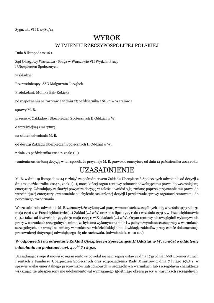 Sygn. akt VII U 2387/14 WYROK W IMIENIU RZECZYPOSPOLITEJ POLSKIEJ Dnia 8 listopada 2016 r. Sąd Okręgowy Warszawa - Praga w Warszawie VII Wydział Pracy i Ubezpieczeń Społecznych w składzie: Przewodniczący: SSO Małgorzata Jarząbek Protokolant: Monika Bąk-Rokicka po rozpoznaniu na rozprawie w dniu 25 października 2016 r. w Warszawie sprawy M. B. przeciwko Zakładowi Ubezpieczeń Społecznych II Oddział w W. o wcześniejszą emeryturę na skutek odwołania M. B. od decyzji Zakładu Ubezpieczeń Społecznych II Oddział w W. z dnia 20 października 2014 r. znak: (...) - zmienia zaskarżoną decyzję w ten sposób, że przyznaje M. B. prawo do emerytury od dnia 14 października 2014 roku. UZASADNIENIE M. B. w dniu 19 listopada 2014 r. złożył za pośrednictwem Zakładu Ubezpieczeń Społecznych odwołanie od decyzji z dnia 20 października 2014r., znak: (...), mocą której organ rentowy odmówił odwołującemu prawa do wcześniejszej emerytury. Odwołujący zaskarżył powyższą decyzję w całości i wniósł o jej zmianę poprzez przyznanie mu prawa do wcześniejszej emerytury, ewentualnie o uchylenie zaskarżonej decyzji i przekazanie sprawy organowi rentowemu do ponownego rozpoznania. W uzasadnieniu odwołania M. B. zaznaczył, że wykonywał pracę w warunkach szczególnych od 5 września 1973 r. do 31 maja 1976 r. w Przedsiębiorstwie (...) Zakład (...) w W. oraz od 2 lipca 1979 r. do 1 września 1979 r. w Przedsiębiorstwie (...), a także od 6 września 1979 do 31 maja 1993 r. w Zakładach (...) w W.. Organ rentowy nie uwzględnił wykonywania pracy w warunkach szczególnych, mimo, że była ona wykonywana stale i w pełnym wymiarze czasu pracy w warunkach szczególnych, a z uwagi na zmiany w strukturze właścicielskiej albo likwidację zakładów pracy całość dokumentacji pracowniczej dotyczącej odwołującego się nie zachowała. (odwołanie k. 2- 10 a.s.) W odpowiedzi na odwołanie Zakład Ubezpieczeń Społecznych II Oddział w W. wniósł o oddalenie odwołania na podstawie art. 47714 § 1 k.p.c. Uzasadniając swoje stanowisko organ rentowy powołał się na przepisy ustawy z dnia 17 grudnia 1998 r. o emeryturach i rentach z Funduszu Ubezpieczeń Społecznych oraz rozporządzenia Rady Ministrów z dnia 7 lutego 1983 r. w sprawie wieku emerytalnego pracowników zatrudnionych w szczególnych warunkach lub szczególnym charakterze wskazując, że ubezpieczony nie udokumentował wymaganego 15-letniego okresu pracy w warunkach szczególnych. Równocześnie organ rentowy zwrócił uwagę, iż zatrudnienie odwołującego w Przedsiębiorstwie (...) Zakładzie (...) w W. od 5 września 1973 r. do 31 maja 1976 r. w Zakładzie (...) przy Przedsiębiorstwie (...) w W. od 2 lipca 1979 r. do 1 września 1979 r. oraz w Zakładach (...) w W. w okresie od 6 września 1979 r. do 31 maja 1993 r. było bezsporne, jednakże na podstawie przedłożonych przez ubezpieczonego dokumentów nie można było stwierdzić w sposób jednoznaczny, że praca wykonywana przez skarżącego w tym okresie miała wyłącznie charakter wynikający z zapisów zawartych w wykazie A stanowiącym załącznik do rozporządzenia w sprawie pracy w warunkach szczególnych (odpowiedź na odwołanie k. 10-11 a.s.). Sąd Okręgowy ustalił następujący stan faktyczny: Ubezpieczony M. B. urodzony (...), w dniu 30 września 2014 r. złożył do Zakładu Ubezpieczeń Społecznych II Oddział w W. wniosek o emeryturę. Do wniosku ubezpieczony dołączył informację dotyczącą okresów składkowych i nieskładkowych, świadectwa pracy z dnia 31 maja 1976 r. z których wynika, że ubezpieczony zatrudniony był na stanowisku montera samochodowego w (...) Zakładzie (...) w W. w okresie 5 września 1973 r. do 31 maja 1976 r., świadectwo z dnia 3 września 1979 r. potwierdzające zatrudnienie odwołującego z (...) przy Przedsiębiorstwie (...) w okresie od 2 lipca 1979 r. do 1 września 1979 r. na stanowisku montera samochodowego, świadectwo pracy z dnia 14 maja 1993 r., z którego wynika że odwołujący w okresie od 6 września 1979 r. do 31 maja 1993 r. w Zakładach (...) na pełny etat wykonywał obowiązki mechanika pojazdów i urządzeń transportowych. Dodatkowo wnioskodawca przedłożył rozliczenie końcowe pracy na budowie (...) Elektrowni (...)w N. – ZSRR, kartotekę zarobkową pracownika fizycznego na stanowisku montera, mechanika silników spalinowych. (wniosek o emeryturę wraz z załącznikami t. I i II a.r.). Organ rentowy po przeprowadzeniu postępowania wyjaśniającego uznał, że ubezpieczony nie udowodnił faktycznego zatrudnienia w warunkach szczególnych przez okres 15 lat. Zakład Ubezpieczeń Społecznych nie uwzględnił jako pracy w szczególnych warunkach okresu zatrudnienia od dnia 5 września 1973 r. do dnia 31 maja 1976 r., od 2 lipca 1979 r. do 1 września 1979 r., od 6 września 1979 r. do 31 maja 1993 r. oraz od 1 czerwca 1993 r. do 31 grudnia 1998 r. z uwagi na brak świadectw pracy potwierdzających wykonywanie pracy w warunkach szczególnych lub w szczególnym charakterze wystawianego przez pracodawcę, bowiem dokumenty przedstawione przez ubezpieczonego nie zawierały stosownej adnotacji o rodzaju wykonywanych prac. Nadto przedstawione przez odwołującego dokumenty jednoznacznie nie wskazywały, że wykonywana przez odwołującego praca była świadczona stale i w pełnym wymiarze czasu pracy. Organ rentowy wskazał także, że łączny staż pracy odwołującego – okresów składkowych i nieskładkowych wynosi 27 lat, 9 miesięcy i 25 dni, lecz z uwagi na niespełnienie warunku 15 letniego okresu pracy w szczególnych warunkach odmówił ubezpieczonemu prawa do wcześniejszej emerytury. (decyzja z dnia 20 października 2014r., znak: (...) k. 21, tom I a.r.). W dniu 19 listopada 2014 roku ubezpieczony M. B. odwołał się od decyzji organu rentowego z dnia 20 października 2014 roku znak: (...) do Sądu Okręgowego Warszawa – Praga w Warszawie VII Wydział Pracy i U