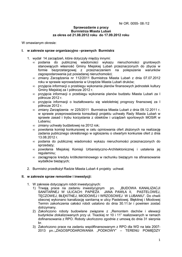 1 Nr OR. 0055- 08 /12 Sprawozdanie z pracy Burmistrza Miasta