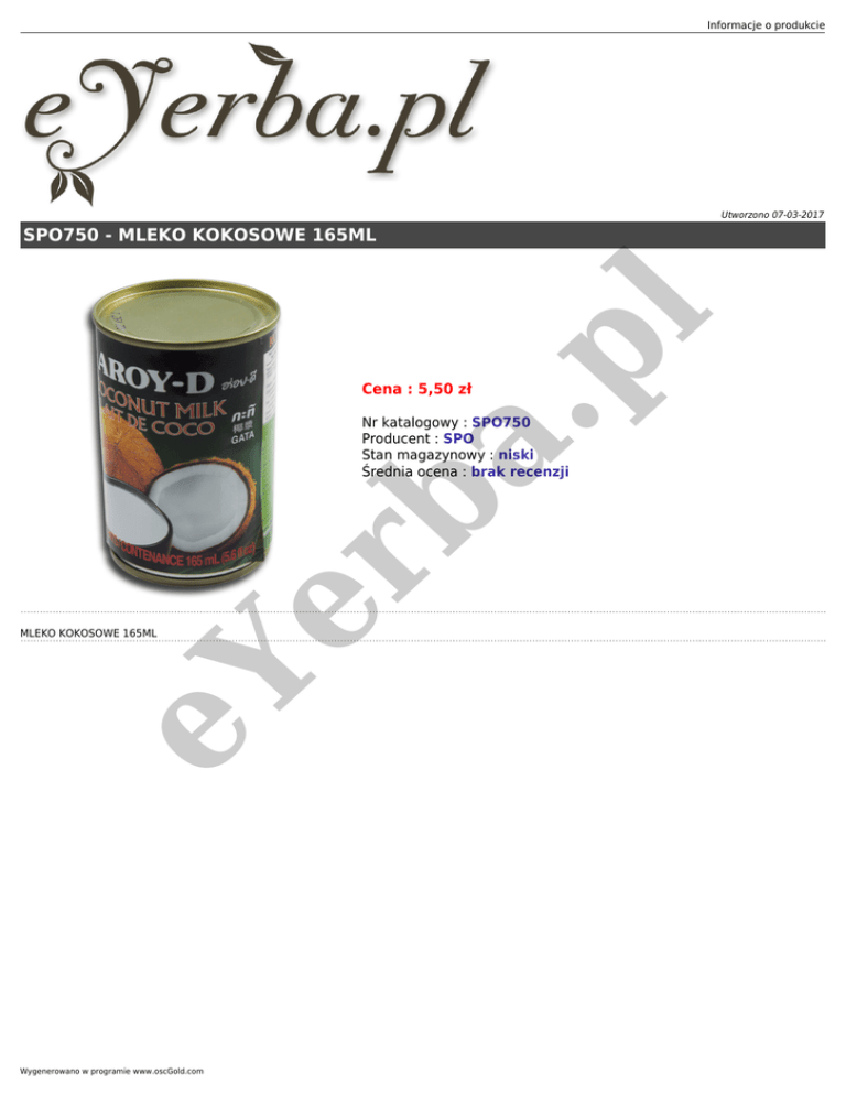 Informacje o produkcie Utworzono 07-03-2017 a. pl SPO750 - MLEKO KOKOSOWE 165ML Cena : 5,50 zł eY MLEKO KOKOSOWE 165ML er b Nr katalogowy : SPO750 Producent : SPO Stan magazynowy : niski Średnia ocena : brak recenzji Wygenerowano w programie www.oscGold.com