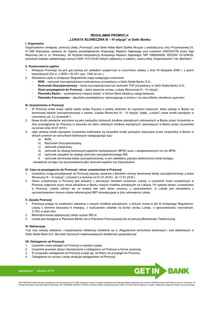 REGULAMIN PROMOCJI „LOKATA SŁONECZNA III – IV edycja” w Getin Banku I. Organizator Organizatorem niniejszej promocji (dalej „Promocja”) jest Getin Noble Bank Spółka Akcyjna z siedzibą przy ulicy Przyokopowej 33, 01-208 Warszawa, wpisana do rejestru przedsiębiorców Krajowego Rejestru Sądowego pod numerem 0000304735 przez Sąd Rejonowy dla m. st. Warszawy, XII Wydział Gospodarczy Krajowego Rejestru Sądowego, NIP 1080004850, REGON 141334039, wysokość kapitału zakładowego wynosi 2.650.143.319,00 złotych (wpłacony w całości), zwany dalej „Organizatorem” lub „Bankiem”. II. Postanowienia ogólne 1. Niniejsza Promocja nie jest grą losową ani zakładem wzajemnym w rozumieniu ustawy z dnia 19 listopada 2009 r. o grach hazardowych (Dz.U. z 2009 r. Nr 201, poz. 1540 ze zm.). 2. Wyrażenia użyte w niniejszym Regulaminie mają następujące znaczenie: − ROR – rachunek oszczędnościowo-rozliczeniowy prowadzony w Getin Noble Banku S.A., − Rachunek Oszczędnościowy – konto oszczędnościowe lub rachunek TOP prowadzony w Getin Noble Banku S.A., − Dzień przystąpienia do Promocji – dzień zawarcia umowy „Lokaty Słonecznej III – IV edycja”, − Placówka Banku – wyodrębnione miejsce (lokal), w którym Bank świadczy usługi bankowe, − Placówka Franczyzowa – placówka przedsiębiorcy wykonującego w imieniu i na rzecz Banku określone czynności. III. Uczestnictwo w Promocji 1. W Promocji może wziąć udział każda osoba fizyczna o pełnej zdolności do czynności prawnych, która ulokuje w Banku na terminowej lokacie oszczędnościowej o nazwie „Lokata Słoneczna III – IV edycja” (dalej: „Lokata”) nowe środki pieniężne w rozumieniu ust. 2 („Uczestnik”). 2. Nowe środki pieniężne wyliczane są jako nadwyżka zlotowych środków pieniężnych ulokowanych w Banku przez Uczestnika w dniu przystąpienia do Promocji w stosunku do stanu złotowych środków pieniężnych ulokowanych w Banku przez Uczestnika na koniec dnia 30.07.2015 r. 3. Jako złotowe środki pieniężne Uczestnika traktowane są wszystkie środki pieniężne ulokowane przez Uczestnika w Banku w złotych polskich na rachunkach bankowych następującego typu: a) ROR, b) Rachunek Oszczędnościowy, c) rachunek przejściowy, d) rachunek do obsługi bankowych papierów wartościowych (BPW) wraz z zarejestrowanymi na nim BPW, e) rachunek specjalny do obsługi rachunku oszczędnościowego IKE, f) rachunek terminowej lokaty oszczędnościowej, w tym zakładany poprzez elektroniczny kanał dostępu, niezależnie od tego czy są prowadzone jako rachunki wspólne czy indywidualne. IV. Czas na przystąpienie do Promocji i okres uczestnictwa w Promocji 1. Uczestnicy mogą przystępować do Promocji poprzez zawarcie z Bankiem umowy terminowej lokaty oszczędnościowej „Lokata Słoneczna III – IV edycja” („Umowa”) w terminie od 01.01.2016 r. do 17.01.2016 r. 2. Okres uczestnictwa w Promocji jest tożsamy z pierwszym okresem umownym Lokaty, a Uczestnik może uczestniczyć w Promocji wyłącznie przez okres lokowania w Banku nowych środków pieniężnych na Lokacie. Po upływie okresu uczestnictwa w Promocji, Lokata odnowi się na kolejny taki sam okres umowny, z zastrzeżeniem, iż Lokata jest odnawialna z oprocentowaniem równym stopie referencyjnej NBP obowiązującej w dniu odnowienia Lokaty. V. Zasady Promocji 1. Promocja polega na możliwości założenia z nowych środków pieniężnych, o których mowa w pkt III niniejszego Regulaminu Lokaty o terminie lokowania 6 miesięcy, z rozliczaniem odsetek na koniec okresu Lokaty, o oprocentowaniu nominalnym 2,70% w skali roku. 2. Minimalna kwota pojedynczej Lokaty wynosi 500 zł. 3. Lokata jest dostępna w Placówce Banku lub w Placówce Franczyzowej lub za pomocą Bankowości Telefonicznej. VI. Reklamacje Tryb oraz zasady składania i rozpatrywania reklamacji określone są w „Regulaminie rachunków bankowych i kart debetowych w Getin Noble Bank S.A. dla osób fizycznych nieprowadzących działalności gospodarczej”. VII. Odstąpienie od Promocji 1. Uczestnik może odstąpić od Promocji w każdym czasie. 2. Uczestnik powinien złożyć oświadczenie o odstąpieniu od Promocji w formie pisemnej. 3. W przypadku odstąpienia od Promocji uznaje się, że Klient nie przystąpił do Promocji. 4. Odstąpienie od umowy Lokaty skutkuje odstąpieniem od Promocji. Getin Noble Bank Spółka Akcyjna z siedzibą przy ulicy Przyokopowej 33, 01-208 Warszawa, wpisana do rejestru przedsiębiorców Krajowego Rejestru Sądowego pod numerem 0000304735 przez Sąd Rejonowy dla m.st. Warszawy, XII Wydział Gospodarczy Krajowego Rejestru Sądowego, NIP 1080004850, REGON 141334039, wysokość kapitału zakładowego wynosi 2.650.143.319,00 złotych (wpłacony w całości). Opłata jak za połączenie lokalne wg taryfy operatora. VIII. Inne postanowienia 1. Getin Noble Bank S.A. z siedzibą przy ulicy Przyokopowej 33, 01-208 Warszawa, jako Organizator i administrator danych, informuje, że będzie przetwarzał dane osobowe Uczestników w celu realizacji Promocji. Uczestnikom przysługuje prawo dostępu do danych oraz prawo ich poprawiania. 2. Komisja Nadzoru Finansowego jest organem nadzoru nad działalnością Banku. 3. Spory pomiędzy Uczestnikiem a Organizatorem mogą być rozstrzygane polubownie przed Arbitrem Bankowym przy Związku Banków Polskich, o ile wartość przedmiotu sporu nie jest wyższa niż 8000 zł. 4. Uczestnik może zwrócić się o bezpłatną pomoc prawną do Miejskiego lub Powiatowego Rzecznika Konsumenta. IX. Postanowienia końcowe 1. Niniejszy Regulamin jest jedynym dokumentem określającym szczegółowe zasady niniejszej Promocji. 2. Każda promocja organizowana przez Bank stanowi odrębną ofertę, której zasady określa odrębny regulamin. 3. Organizator jest odpowiedzialny za przeprowadzenie Promocji i jej prawidłowy przebieg. 4. Treść niniejszego Regulaminu znajduje się na stronie internetowej www.g