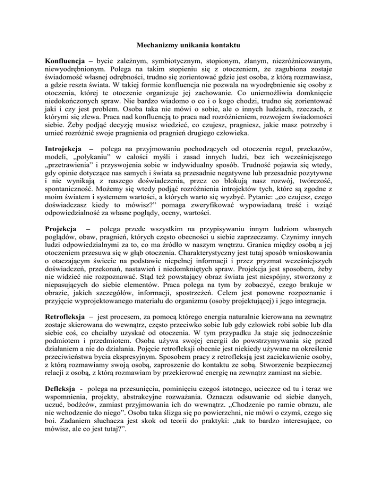 Mechanizmy unikania kontaktu Konfluencja – bycie zaleŜnym, symbiotycznym, stopionym, zlanym, niezróŜnicowanym, niewyodrębnionym. Polega na takim stopieniu się z otoczeniem, Ŝe zagubiona zostaje świadomość własnej odrębności, trudno się zorientować gdzie jest osoba, z którą rozmawiasz, a gdzie reszta świata. W takiej formie konfluencja nie pozwala na wyodrębnienie się osoby z otoczenia, której te otoczenie organizuje jej zachowanie. Co uniemoŜliwia domknięcie niedokończonych spraw. Nie bardzo wiadomo o co i o kogo chodzi, trudno się zorientować jaki i czy jest problem. Osoba taka nie mówi o sobie, ale o innych ludziach, rzeczach, z którymi się zlewa. Praca nad konfluencją to praca nad rozróŜnieniem, rozwojem świadomości siebie. śeby podjąć decyzję musisz wiedzieć, co czujesz, pragniesz, jakie masz potrzeby i umieć rozróŜnić swoje pragnienia od pragnień drugiego człowieka. Introjekcja – polega na przyjmowaniu pochodzących od otoczenia reguł, przekazów, modeli, „połykaniu” w całości myśli i zasad innych ludzi, bez ich wcześniejszego „przetrawienia” i przyswojenia sobie w indywidualny sposób. Trudność pojawia się wtedy, gdy opinie dotyczące nas samych i świata są przesadnie negatywne lub przesadnie pozytywne i nie wynikają z naszego doświadczenia, przez co blokują nasz rozwój, twórczość, spontaniczność. MoŜemy się wtedy podjąć rozróŜnienia introjektów tych, które są zgodne z moim światem i systemem wartości, a których warto się wyzbyć. Pytanie: „co czujesz, czego doświadczasz kiedy to mówisz?” pomaga zweryfikować wypowiadaną treść i wziąć odpowiedzialność za własne poglądy, oceny, wartości. Projekcja – polega przede wszystkim na przypisywaniu innym ludziom własnych poglądów, obaw, pragnień, których często obecności u siebie zaprzeczamy. Czynimy innych ludzi odpowiedzialnymi za to, co ma źródło w naszym wnętrzu. Granica między osobą a jej otoczeniem przesuwa się w głąb otoczenia. Charakterystyczny jest tutaj sposób wnioskowania o otaczającym świecie na podstawie niepełnej informacji i przez pryzmat wcześniejszych doświadczeń, przekonań, nastawień i niedomkniętych spraw. Projekcja jest sposobem, Ŝeby nie widzieć nie rozpoznawać. Stąd teŜ powstający obraz świata jest niespójny, stworzony z niepasujących do siebie elementów. Praca polega na tym by zobaczyć, czego brakuje w obrazie, jakich szczegółów, informacji, spostrzeŜeń. Celem jest ponowne rozpoznanie i przyjęcie wyprojektowanego materiału do organizmu (osoby projektującej) i jego integracja. Retrofleksja – jest procesem, za pomocą którego energia naturalnie kierowana na zewnątrz zostaje skierowana do wewnątrz, często przeciwko sobie lub gdy człowiek robi sobie lub dla siebie coś, co chciałby uzyskać od otoczenia. W tym przypadku Ja staje się jednocześnie podmiotem i przedmiotem. Osoba uŜywa swojej energii do powstrzymywania się przed działaniem a nie do działania. Pojęcie retrofleksji obecnie jest niekiedy uŜywane na określenie przeciwieństwa bycia ekspresyjnym. Sposobem pracy z retrofleksją jest zaciekawienie osoby, z którą rozmawiamy swoją osobą, zaproszenie do kontaktu ze sobą. Stworzenie bezpiecznej relacji z osobą, z którą rozmawiam by przekierować energię na zewnątrz zamiast na siebie. Defleksja - polega na przesunięciu, pominięciu czegoś istotnego, ucieczce od tu i teraz we wspomnienia, projekty, abstrakcyjne rozwaŜania. Oznacza odsuwanie od siebie danych, uczuć, bodźców, zamiast przyjmowania ich do wewnątrz. „Chodzenie po ramie obrazu, ale nie wchodzenie do niego”. Osoba taka ślizga się po powierzchni, nie mówi o czymś, czego się boi. Zadaniem słuchacza jest skok od teorii do praktyki: „tak to bardzo interesujące, co mówisz, ale co jest tutaj?”. Egotyzm - tendencja do nadmiernego zajmowania się własną osobą, rozmyślania nad sobą, nieustanne kierowanie uwagi na siebie. Przesadne kierowanie własnej i cudzej uwagi na siebie. Inwalidacja – proces charakteryzujący się dostarczaniem osobie sprzecznych informacji z jej odczuciami. Przykład: Małe dziecko udaje się do rodzica, poniewaŜ się przewróciło i coś je boli. Rodzic na to odpowiada, Ŝe nic jemu nie jest. Taka sytuacja moŜe prowadzić do "zagubienia" się dziecka, poniewaŜ rodzic dostarcza mu sprzecznych informacji z jego odczuciem, co powoduje, Ŝe dziecko nie jest w stanie zrozumieć czy coś je boli czy jednak nie.