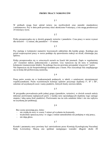 PRÓBY PRACY NOROWCÓW §1 W próbach mogą brać udział teriery ras myśliwskich oraz jamniki standardowe i miniaturowe. Psy w dniu prób powinny mieć ukończone 9 miesięcy, a nie mogą przekroczyć 24 miesięcy życia. §2 Próby przeprowadza się w dwóch grupach: terierów i jamników. Czas pracy w norze wynosi dla terierów – 12 minut, dla jamników – 15 minut. §3 Psy startują w kolejności numerów losowanych oddzielnie dla każdej grupy. Każdego psa przed rozpoczęciem pracy w norze poddaje się sprawdzeniu reakcji na strzał, eliminując psy lękliwe. Próby przeprowadza się w sztucznych norach na lisach lub jenotach. Zapis w regulaminie „lis” rozumieć należy jednoznacznie z jenotem. Lisy wpuszcza się do nory w ustalonej kolejności (numerowane klatki). Na jednego lisa nie powinno przypadać więcej niż 7 psów. Nie dopuszcza się do bezpośredniego kontaktu psa z lisem. Pies oszczekuje lisa znajdującego się za kratą lub perforowaną zastawką. §4 Pracę psów ocenia się w konkurencjach podanych, w tabeli, z ustalonymi, niezmiennymi współczynnikami. Psom wyróżnionym komisja sędziów przyznaje dyplomy I°, II° i III°, zależnie od uzyskanych ocen i sumy punktów, których limity zawiera tabela. §5 W przypadku prowadzenia prób jednej grupy (jamników, terierów), w dwóch norach należy dokonać porównania najlepszych psów z każdej nory (posiadających dyplomy tego samego stopnia i taką samą ilość punktów). Porównanie ma na celu ustalenie lokat i nie ma wpływu na uzyskaną już punktację. §6 Bez oceny pozostają psy, które: - nie wejdą do nory w czasie 3 minut od wydania im komendy, - trzykrotnie opuszczą norę i w ciągu 2 minut samodzielnie nie podejmą w niej pracy, - nie dają głosu. §7 Kształt i parametry nory powinny być zatwierdzone przez Komisję Kynologiczną Naczelnej Rady Łowieckiej. Muszą one spełniać następujące warunki: długość około 20 metrów, wysokość korytarzy – 20 cm, szerokość – 18 cm, co najmniej 3 kotły, utrudnienia w postaci 16 cm przewężenia, przynajmniej jednego spadku – komin. Powinna posiadać sprawnie działającą sygnalizację umożliwiającą obserwację przemieszczających się psa i lisa. Konstrukcja nory musi umożliwiać obsłudze podejmowanie skutecznej interwencji w każdym jej miejscu. §8 W kotle nr 1 umieszcza się lisa. Następnie, na polecenie sędziego, przewodnik z odległości ok. 1 metra od okna wejściowego puszcza do nory uwolnionego ze smyczy i obroży psa. Przewodnikowi wolno zachęcać psa do pracy tylko przed jego wejściem do nory. Pies powinien wejść do nory w czasie 3 minut i oszczekiwać lisa znajdującego się w kotle nr 1. Po upływie tego czasu wpuszcza się lisa do kotła nr 2, a następnie umożliwia dojście tam psa. Po około 1 – 2 minutowej pracy psa przy kotle nr 2 (atakowanie, oszczekiwanie), lisa wpuszcza się do kotła nr 3, po czym pozwala się dojść tam psu. Po dojściu pies powinien przez 3 minuty pracować przez zamkniętą zastawkę (kratę). Następnie wpuszcza się lisa do umieszczonej u wylotu zaciemnionej klatki, po czym, przez otworzenie zastawek kotła nr 3, umożliwia się psu wyjście z nory. W tym stadium pracy pozostałe kotły (nr 1 i 2 ) są również otwarte. §9 W przypadku uzyskania przez psy jednakowej liczy punktów o lokacie decyduje: 1. – ocena z odwagi; 2. – wiek psa; młodszy przed starszym; 3. – płeć; suka przed psem. Próby Pracy Norowców 5 4 4 6 2 2 Limity Suma punktów 80 70 Dyplo m I° II° Oceny 3 2 3 2 3 2 3 2 3 2 3 2 1 1 3 3 WspółKonkurencje 1 2 3 4 5 6 7 czynnik Odwaga Wytrwałość Pasja Styl pracy Donośność głosu Rytmiczność głosu Posłuszeństwo: - reakcja na rozkazy - chodzenie przy nodze Razem Najwyższa ilość punktów do zdobycia: 25 x 4 = 100 25 2 2 55 III° 2 2 2 2 2 2 2 2