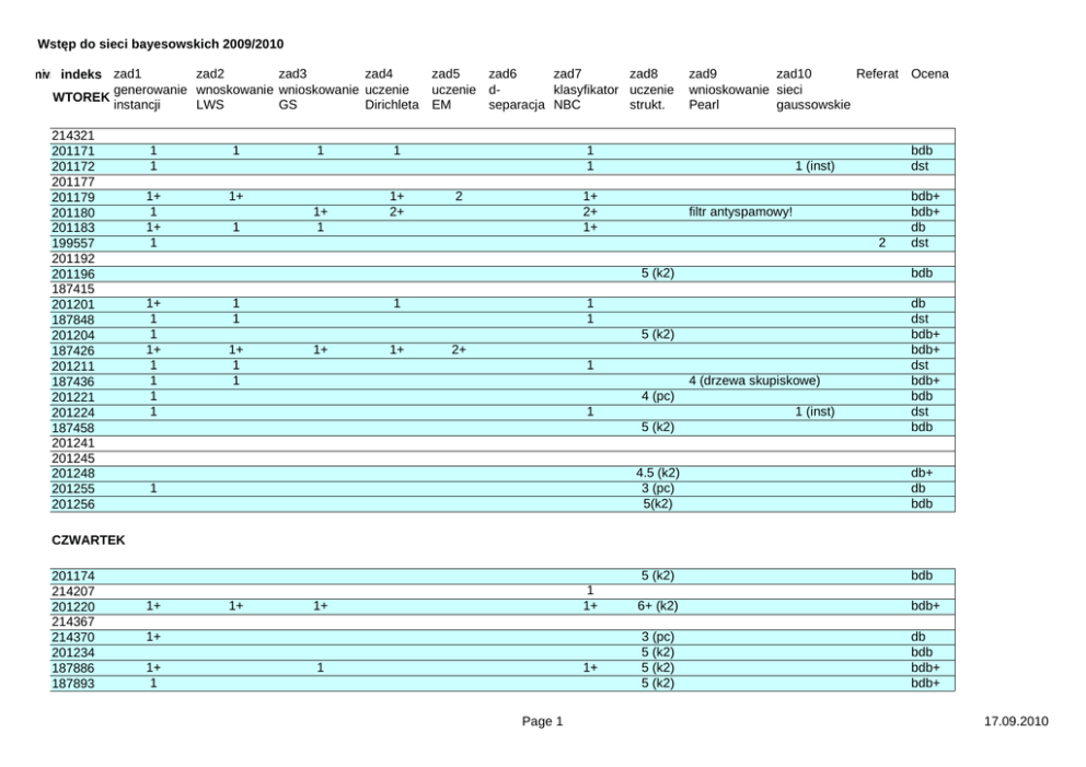 Wstęp do sieci bayesowskich 2009/2010 zad2 zad3 zad4 nazwisko imie indeks zad1 generowanie wnoskowanie wnioskowanie uczenie WTOREK instancji LWS GS Dirichleta 214321 201171 201172 201177 201179 201180 201183 199557 201192 201196 187415 201201 187848 201204 187426 201211 187436 201221 201224 187458 201241 201245 201248 201255 201256 1 1 1 1+ 1 1+ 1 1+ 1 1 1+ 1 zad5 zad6 zad7 zad8 uczenie dklasyfikator uczenie EM separacja NBC strukt. 1 1+ 2+ zad9 zad10 Referat Ocena wnioskowanie sieci Pearl gaussowskie 1 1 2 1+ 2+ 1+ filtr antyspamowy! 2 5 (k2) 1+ 1 1 1+ 1 1 1 1 bdb dst 1 (inst) 1 1 1 bdb 1 1 5 (k2) db dst bdb+ bdb+ dst bdb+ bdb dst bdb 4.5 (k2) 3 (pc) 5(k2) db+ db bdb 5 (k2) bdb 6+ (k2) bdb+ 3 (pc) 5 (k2) 5 (k2) 5 (k2) db bdb bdb+ bdb+ 5 (k2) 1+ 1 1 1+ 1+ 2+ 1 4 (drzewa skupiskowe) 4 (pc) 1 1 bdb+ bdb+ db dst 1 (inst) CZWARTEK 201174 214207 201220 214367 214370 201234 187886 187893 1+ 1+ 1 1+ 1+ 1+ 1+ 1 1 1+ Page 1 17.09.2010
