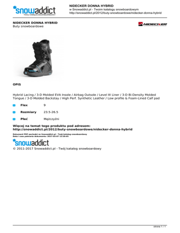 NIDECKER DONNA HYBRID w Snowaddict.pl - Twoim katalogu snowboardowym http://snowaddict.pl/2012/buty-snowboardowe/nidecker-donna-hybrid NIDECKER DONNA HYBRID Buty snowboardowe OPIS Hybrid Lacing / 3-D Molded EVA Insole / Airbag Outsole / Level III Liner / 3-D Bi-Density Molded Tongue / 3-D Molded Backstay / High Perf. Synthetic Leather / Low profile & Foam-Lined Calf pad Flex 9 Rozmiary 23.5-26.5 Płeć Mężczyźni Więcej na temat tego produktu pod adresem: http://snowaddict.pl/2012/buty-snowboardowe/nidecker-donna-hybrid Dokument PDF pochodzi ze Snowaddict.pl - Twój katalog snowboardowy Data i czas pobrania dokumentu: 2017-03-07 12:20:45 © 2011-2017 Snowaddict.pl - Twój katalog snowboardowy strona 1 / 1 Powered by TCPDF (www.tcpdf.org)