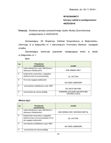 Białystok, dn. 02.11.2016 r. WYKONAWCY biorący udział w postępowaniu 40/ZO/2016 Dotyczy: Dostawa sprzętu powszechnego użytku Służby Żywnościowej postępowanie nr 40/ZO/2016. Zamawiający, 25 Wojskowy Oddział Gospodarczy w Białymstoku, informuję, iż w Załączniku nr 1 stanowiącym -Formularz ofertowy wystąpiła omyłka. Zamawiający dokonuje poprawek następującej treści w tabeli w Załączniku nr 1. Było: Lp 1 2 3 Przedmiot zamówienia model szafa chłodnicza o poj. 640 litrów z własnym chłodzeniem AHK MN064 0001 kotleciarko-nacinarka z napędem elektrycznym oraz przystawką EL VICTOR TS 12 do napędu kotleciarki GG 5260 LIEBHERR 4 zamrażarka szufladowa o poj. 500 l SC 450 E NILFISK 5 szorowarka do mycia podłóg KOMORA COLDOR split SFN 085 TECHNO-COLD Winno być: Lp 1 2 3 Przedmiot zamówienia szafa chłodnicza o poj. 640 litrów z własnym chłodzeniem model model AHK MN064 0001 KROSNO METAL kotleciarko-nacinarka z napędem elektrycznym oraz przystawką TS 12 do napędu kotleciarki EL VICTOR zamrażarka szufladowa o poj. 500 l GG 5260 LIEBHERR 4 szorowarka do mycia podłóg 1/2 SC 450 E NILFISK 5 Komora chłodnicza 10,5 m3 KOMORA COLDOR split SFN 085 TECHNO-COLD KOMENDANT (-) w/z ppłk Mirosław SOSNA E. STALEWSKA, tel. 261 39 88 39 02.11.2016 r. T: 11/40 SZP- 40/ZO/2016 2/2
