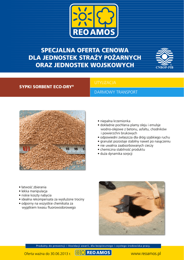 Segment SGRF100 • Bowl shaped fibers of diameter 15 cm • Can be used for wiping of the oil-based substances from fixed devices • Suitable for the use as absorptive layer of filters • Together with degreaser is excellent mean for removing and cleaning of crude oil form pliers, boats and poles SPECJALNA OFERTA CENOWA DLA JEDNOSTEK STRAŻY POŻARNYCH ORAZ JEDNOSTEK WOJSKOWYCH SYPKI SORBENT ECO-DRY® UTYLIZACJA DARMOWY TRANSPORT Technique for natural disasters and industrial accidents • niepalna krzemionka • dokładnie pochłania plamy oleju i emulsje wodno-olejowe z betonu, asfaltu, chodników i powierzchni brukowych • odpowiedni zwłaszcza dla dróg szybkiego ruchu • granulat pozostaje stabilny nawet po nasączeniu • nie uwalnia zaabsorbowanych cieczy • chemiczna stabilność produktu • duża dynamika sorpcji • łatwość zbierania • lekka manipulacja • niskie koszty nabycia • idealna rekompensata za wysłużone trociny • odporny na wszystkie chemikalia za wyjątkiem kwasu fluorowodorowego Produkty do prewencji i likwidacji awarii, dla bezpiecznego i czystego środowiska pracy. Oferta ważna do 30.06.2013 r. www.reoamos.pl ŚWIADECTWO DOPUSZCZENIA Nazwa towaru UED010 – Sorbent sypki ECO-DRY opakowanie 10 kg Ilość 1-77 opak. 78-156 opak. (1-2 palety) 157-312 opak. (3-4 palety) > 313 opak. Cena netto bez utylizacji 39,00 zł 37,00 zł 35,00 zł 33,00 zł Cena netto z utylizacją 44,00 zł 42,00 zł 40,00 zł 38,00 zł * cena katalogowa 44,00 zł + transport i utylizacja W razie pytań nasi pracownicy, doradzą i udzielą Państwu wszelkich informacji pod nr tel. 33 496 80 15, 608 624 920 lub mailem [email protected] Całą naszą ofertę z bogatym wyborem środków dla straży pożarnych i jednostek wojskowych znajdą Państwo na naszej stronie www.reoamos.pl Produkty do prewencji i likwidacji awarii, dla bezpiecznego i czystego środowiska pracy. Oferta ważna do 30.06.2013 r. www.reoamos.pl