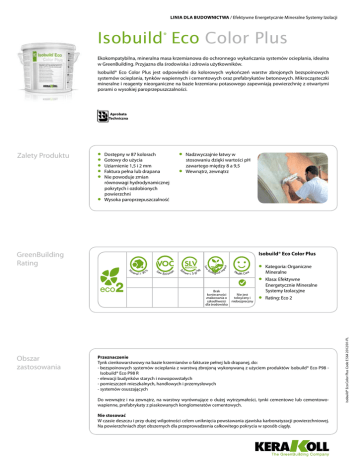 LINIA DLA BUDOWNICTWA / Efektywne Energetycznie Mineralne Systemy Izolacji Isobuild Eco Color Plus ® Ekokompatybilna, mineralna masa krzemianowa do ochronnego wykańczania systemów ocieplania, idealna w GreenBuilding. Przyjazna dla środowiska i zdrowia użytkowników. Isobuild® Eco Color Plus jest odpowiedni do kolorowych wykończeń warstw zbrojonych bezspoinowych systemów ocieplania, tynków wapiennych i cementowych oraz prefabrykatów betonowych. Mikrocząsteczki mineralne i reagenty nieorganiczne na bazie krzemianu potasowego zapewniają powierzchnię z otwartymi porami o wysokiej paroprzepuszczalności. Aprobata Techniczna •• Dostępny w 87 kolorach •• Gotowy do użycia •• Uziarnienie 1,5 i 2 mm •• Faktura pełna lub drapana •• Nie powoduje zmian •• •• Nadzwyczajnie łatwy w •• równowagi hydrodynamicznej pokrytych i ozdobionych powierzchni Wysoka paroprzepuszczalność GreenBuilding Rating Isobuild® Eco Color Plus ol / t≤5g Ec •• Kategoria: Organiczne ct REDUCED ven pa w Emi ssi on ological Im Brak konieczności znakowania o szkodliwości dla środowiska He alth Care Nie jest toksyczny i niebezpieczny Mineralne •• Klasa: Efektywne Energetycznie Mineralne Systemy Izolacyjne •• Rating: Eco 2 Przeznaczenie Tynk cienkowarstwowy na bazie krzemianów o fakturze pełnej lub drapanej, do: - bezspoinowych systemów ocieplania z warstwą zbrojoną wykonywaną z użyciem produktów Isobuild® Eco P98 Isobuild® Eco P98 R - elewacji budynków starych i nowopowstałych - pomieszczeń mieszkalnych, handlowych i przemysłowych - systemów osuszających Do wewnątrz i na zewnątrz, na warstwy wyrównujące o dużej wytrzymałości, tynki cementowe lub cementowowapienne, prefabrykaty z piaskowanych konglomeratów cementowych. Nie stosować W czasie deszczu i przy dużej wilgotności celem uniknięcia powstawania zjawiska karbonatyzacji powierzchniowej. Na powierzchniach zbyt obszernych dla przeprowadzenia całkowitego pokrycia w sposób ciągły. Isobuild® Eco Color Plus Code E 564 2012/01-PL % Lo S M 2 ral ≥ 30 Low SLV ine Obszar zastosowania stosowaniu dzięki wartości pH zawartego między 8 a 9,5 Wewnątrz, zewnątrz kg Zalety Produktu Technologia użycia Przygotowanie podłoży Powierzchnie przeznaczone do dekorowania i zabezpieczenia muszą być w idealnym stanie, zwarte, pozbawione ewentualnych pozostałości starych farb, wykwitów solnych, wilgoci oraz bez możliwości kapilarnego podciągania wody. Usunąć za pomocą metalowej szczotki lub skrobaka wszelkie pozostałości warstw obcych materiałów z powierzchni przeznaczonej do obróbki. Najlepszy efekt uzyskuje się przez piaskowanie, hydropiaskowanie lub mycie ciśnieniowe. Upewnić się, czy podłoże lub jego uzupełniane fragmenty są stabilne wymiarowo i wysezonowane. Przy nowych podłożach cementowych wymagane jest, aby sezonowanie trwało przynajmniej 14 dni. Stosować zawsze jedną powłokę technicznego środka gruntującego na bazie krzemianu potasu, Isobuild® Eco Primer Plus. Pokrycie dekoracyjne z użyciem Isobuild® Eco Color Plus wykonać po upływie minimum 24 godzin. Sposób użycia Isobuild® Eco Color Plus jest gotowy do użytku. W razie potrzeby może być rozcieńczony z maksymalnie 5% wody. Zawsze przed użyciem produkt należy wymieszać mieszadłem wolnoobrotowym. Nie mieszać zbyt długo, aby zbytnio nie napowietrzyć masy. Nanoszenie Za pomocą pacy ze stali nierdzewnej rozprowadzić warstwę Isobuild® Eco Color Plus o grubości równiej wymiarom ziaren wiodących, jakie zawiera pasta. Następnie usunąć pacą ewentualny nadmiar materiału. Kiedy materiał lekko podeschnie zacierać pacą z tworzywa sztucznego ruchami podłużnymi lub okrężnymi w celu zagęszczenia materiału i uzyskania odpowiedniej faktury. Czyszczenie Isobuild® Eco Color Plus usuwa się z narzędzi lub innych powierzchni wodą przed całkowitym stwardnieniem produktu. Wzór informacji technicznej dla projektantów Powierzchnie przeznaczone do nałożenia tynków cienkowarstwowych przygotować przez usunięcie metodą szczotkowania lub piaskowania starych powłok malarskich. Sprawdzić czy szpachle, zaprawy i tynki są już wysezonowane. Na odpowiednio przygotowane podłoże nałożyć za pomocą pacy ze stali nierdzewnej warstwę technicznego tynku cienkowarstwowego na bazie krzemianów na przykład Isobuild® Eco Color Plus firmy Kerakoll i zacierać do uzyskania powierzchni dekoracyjnej o fakturze pełnej lub drapanej. Inne wskazówki Zmywać natychmiast ewentualne zachlapania. W czasie nanoszenia osłaniać elementy metalowe i szklane. Ograniczyć obszar wykonywania prac poprzez oklejenie go taśmą samoprzylepną i zabezpieczyć miejsca nie podlegające obróbce. Taśmy należy usunąć przy jeszcze świeżym produkcie. Wzorniki kolorów zostały wykonane z materiałów o najwyższym stopniu stabilności barw, jednakże z upływem czasu, jak też przede wszystkim z powodu warunków niesprzyjających przechowywaniu, mogą wystąpić pewne zmiany kolorystyczne. Zaleca się wykonanie próby w celu zweryfikowania barwy. wg Normy Jakości Kerakoll Wygląd Biała lub barwiona pasta Natura chemiczna Krzemian potasowy i pigmenty organiczne Uziarnienie ≈ 1,5 mm / ≈ 2 mm CARE Metoda M1 - Procedura E500 Przechowywanie ≈ 12 miesięcy w oryginalnym opakowaniu, chronić przed mrozem, bezpośrednim nasłonecznieniem i źródłami ciepła Opakowanie Wiadra 25 kg Temperatura użycia od +5 °C do +25 °C pH od 8 do 9,5 Wysychanie ≈ 24 h Współczynnik oporu dyfuzyjnego Sd 0,087 m PN-EN ISO 7783-2 Współczynnik absorpcji wody W 0,08 kg/m2 h0,5 PN-EN 1062-3 Wydajność: uziarnienie 1,5 mm ≈ 2,3 kg/m2 uziarnienie 2 mm ≈ 3 kg/m2 Dane uzyskane w temp. +20 °C, przy wilgotności względnej 55% i przy braku wentylacji. Mogą ulegać zmianie w zależności od warunków panujących na budowie. Uwagi - Produkt do użytku profesjonalnego - przestrzegać wszelkich norm i przepisów krajowych -