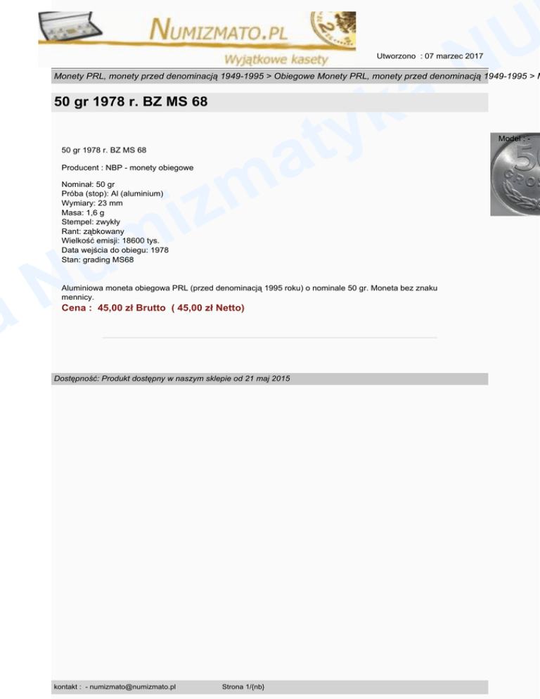 U N Utworzono : 07 marzec 2017 a k Monety PRL, monety przed denominacją 1949-1995 > Obiegowe Monety PRL, monety przed denominacją 1949-1995 > M y t a 50 gr 1978 r. BZ MS 68 50 gr 1978 r. BZ MS 68 m z i m u Producent : NBP - monety obiegowe Nominał: 50 gr Próba (stop): Al (aluminium) Wymiary: 23 mm Masa: 1,6 g Stempel: zwykły Rant: ząbkowany Wielkość emisji: 18600 tys. Data wejścia do obiegu: 1978 Stan: grading MS68 N a Aluminiowa moneta obiegowa PRL (przed denominacją 1995 roku) o nominale 50 gr. Moneta bez znaku mennicy. Cena : 45,00 zł Brutto ( 45,00 zł Netto) Dostępność: Produkt dostępny w naszym sklepie od 21 maj 2015 kontakt : - [email protected] Strona 1/{nb} Model : -
