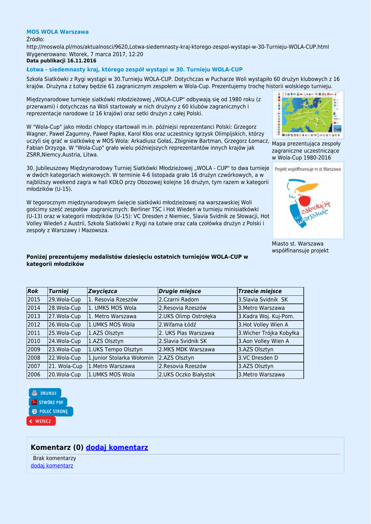 MOS WOLA Warszawa Źródło: http://moswola.pl/mos/aktualnosci/9620,Lotwa-siedemnasty-kraj-ktorego-zespol-wystapi-w-30-Turnieju-WOLA-CUP.html Wygenerowano: Wtorek, 7 marca 2017, 12:20 Data publikacji 16.11.2016 Łotwa - siedemnasty kraj, którego zespół wystąpi w 30. Turnieju WOLA-CUP Szkoła Siatkówki z Rygi wystąpi w 30.Turnieju WOLA-CUP. Dotychczas w Pucharze Woli wystąpiło 60 drużyn klubowych z 16 krajów. Drużyna z Łotwy będzie 61 zagranicznym zespołem w Wola-Cup. Prezentujemy trochę historii wolskiego turnieju. Międzynarodowe turnieje siatkówki młodzieżowej „WOLA-CUP" odbywają się od 1980 roku (z przerwami) i dotychczas na Woli startowały w nich drużyny z 60 klubów zagranicznych i reprezentacje narodowe (z 16 krajów) oraz setki drużyn z całej Polski. W "Wola-Cup" jako młodzi chłopcy startowali m.in. późniejsi reprezentanci Polski: Grzegorz Wagner, Paweł Zagumny, Paweł Papke, Karol Kłos oraz uczestnicy Igrzysk Olimpijskich, którzy uczyli się grać w siatkówkę w MOS Wola: Arkadiusz Gołaś, Zbigniew Bartman, Grzegorz Łomacz, Mapa prezentująca zespoły Fabian Drzyzga. W "Wola-Cup" grało wielu późniejszych reprezentantów innych krajów jak zagraniczne uczestniczące ZSRR,Niemcy,Austria, Litwa. w Wola-Cup 1980-2016 30. Jubileuszowy Międzynarodowy Turniej Siatkówki Młodzieżowej „WOLA - CUP" to dwa turnieje w dwóch kategoriach wiekowych. W terminie 4-6 listopada grało 16 drużyn czwórkowych, a w najbliższy weekend zagra w hali KOŁO przy Obozowej kolejne 16 drużyn, tym razem w kategorii młodzików (U-15). W tegorocznym międzynarodowym święcie siatkówki młodzieżowej na warszawskiej Woli gościmy sześć zespołów zagranicznych: Berliner TSC i Hot Wiedeń w turnieju minisiatkówki (U-13) oraz w kategorii młodzików (U-15): VC Dresden z Niemiec, Slavia Svidnik ze Słowacji, Hot Volley Wiedeń z Austrii, Szkoła Siatkówki z Rygi na Łotwie oraz cała czołówka drużyn z Polski i zespoły z Warszawy i Mazowsza. Poniżej prezentujemy medalistów dziesięciu ostatnich turniejów WOLA-CUP w kategorii młodzików Rok 2015 2014 2013 2012 2011 2010 2009 2008 2007 2006 Turniej 29.Wola-Cup 28.Wola-Cup 27.Wola-Cup 26.Wola-Cup 25.Wola-Cup 24.Wola-Cup 23.Wola-Cup 22.Wola-Cup 21. Wola-Cup 20.Wola-Cup Zwycięzca 1. Resovia Rzeszów 1. UMKS MOS Wola 1. Metro Warszawa 1.UMKS MOS Wola 1.AZS Olsztyn 1.AZS Olsztyn 1.UKS Tempo Olsztyn 1.Junior Stolarka Wołomin 1.Metro Warszawa 1.UMKS MOS Wola Komentarz (0) dodaj komentarz Brak komentarzy dodaj komentarz Drugie miejsce 2.Czarni Radom 2.Resovia Rzeszów 2.UKS Olimp Ostrołęka 2.Wifama Łódź 2. UKS Plas Warszawa 2.Slavia Svidnik SK 2.MKS MDK Warszawa 2.AZS Olsztyn 2.Resovia Rzeszów 2.UKS Oczko Białystok Miasto st. Warszawa współfinansuje projekt Trzecie miejsce 3.Slavia Svidnik SK 3.Metro Warszawa 3.Kadra Woj. Kuj-Pom. 3.Hot Volley Wien A 3.Wicher Trójka Kobyłka 3.Aon Volley Wien A 3.AZS Olsztyn 3.VC Dresden D 3.AZS Olsztyn 3.Metro Warszawa