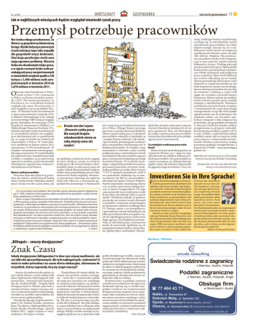 Nr. 22/999 Wirtschaft Gospodarka 11 Jak w najbliższych miesiącach będzie wyglądał niemiecki rynek pracy Przemysł potrzebuje pracowników Nie trzeba nikogo przekonywać, że Niemcy są gospodarczą lokomotywą Europy. Wyniki dotyczące pierwszych trzech miesięcy tego roku wypadły dla gospodarki wręcz doskonale. Choć kraje peryferyjne strefy euro mają ogromne problemy. Wzrasta liczba nie obsadzonych miejsc pracy, a w ujęciu rocznym liczba osób poszukujących pracy zarejestrowanych w niemieckich urzędach spadła o 328 tysięcy z 3,406 miliona osób zarejestrowanych w kwietniu 2010 do 3,078 miliona w kwietniu 2011. O Obawy i zyski pracowników Powyższe dane dla jednych są powodem do radości, wśród innych budzą obawy i kontrowersje. Federalna minister pracy Ursula von der Leyen, która, jak Ursula von der Leyen: „Otwarcie rynku pracy dla nowych krajów członkowskich niesie za sobą więcej szans niż ryzyka”. się spekuluje, niebawem może sięgnąć po stery chadecji, uważa, że otwarcie rynku pracy dla nowych krajów członkowskich niesie za sobą więcej szans niż ryzyka. Jednak dla przeciętnych zjadaczy chleba wizja przyjeżdżających zza Odry fachowców budzi niepokój. Niemieccy pracownicy obawiają się napływu taniej siły roboczej, a utrzymanie gospodarstwa domowego w Niemczech Czy muszę płacić tyle podatku? Na to bardzo często stawiane pytanie odpowiemy już w 1000. wydaniu naszej gazety, gdzie przedstawimy pozytywy i wady zmiany klasy podatkowej w Niemczech. Słowo wstępu: Opodatkowanie dochodów od osób fizycznych, tzw. Lohnsteuer, w RFN regulują ustawy o podatku dochodowym. Podatek potrącany jest od wynagrodzenia, a obowiązek podatkowy spoczywa na pracowniku. Jednak powszechnie wiadomo, że pracodawca zobowiązany jest do jego potrącenia i odprowadzenia do urzędu. W Niemczech wysokość potrącanego podatku nie zależy tylko od osiągniętych dochodów, ale również od innych czynników, w tym przede wszystkim klas podatkowych. Co zatem powinien zrobić ten, kto chce płacić mniej. Kawaler pracujący w Niemczech nierzadko z zazdrością patrzy na stawki podatków odprowadzanych przez żonatych kolegów. Skąd jest taka różnica w odprowadzanych podatkach? Odpowiedź na to pytanie brzmi: klasa podatkowa – Steuerklasse, która kwalifikuje podatnika pod względem wysokości podatku od wynagrodzenia. Więcej w najbliższym wydaniu Wochenblattu. K. Świerc jest wciąż jeszcze bardziej kosztowne niż w Polsce. Dlatego Niemcy nie mogą pracować za stawkę oferowaną Polakom. Obawy przed utratą pracy rodzimych pracowników wskazały, że niezbędne są „socjalne bariery ochronne”, jak restrykcyjne kontrole, przestrzegania wysokości płacy minimalnej obowiązujących w niektórych branżach. W związku z tymi nastrojami w ostatnim czasie została podjęta decyzja o wprowadzeniu stawek minimalnych dla pracowników agencji pracy tymczasowej świadczących usługi na terenie Niemiec. W tej chwili, korzystając z usług firmy pośrednictwa pracy, pracownik powinien otrzymać minimalną godzinową stawkę, która wynosi 7,79 € w landach zachodnich i 6,89 € we wschodnich. Kalkuluje się, że ustawa dotyczy ok. 900 tys. pracowników i obowiązywać będzie również Polaków. Stawki minimalne zmniejszają obawy o to, że polscy pracownicy będą pracować za niższe wynagrodzenie. Do tego czasu pojawiały się na rynku pracy małe firmy, które zatrudniały ludzi za marne stawki. Wiedziano jednak, że państwo niemieckie nie zostawi swoich obywateli w potrzebie i wspomoże ich pieniędzmi na utrzymanie z pakietu socjalnego Harz IV. Patrząc zatem z tej perspektywy, wprowadzenie stawek minimalnych nie tylko pozwoli pracobiorcom godnie żyć, ale też zapobiegnie psuciu rynku przez skąpe agencje. Ich działalność powodowała, że cała branża pracy tymczasowej miała zły wizerunek. Spekuluje się, że następnym krokiem będzie wprowadzenie ogólnej płacy minimalnej. Dla pol- Szkoły dwujęzyczne (bilingwalne) to dwa razy więcej możliwości, ale czy tylko dla uprzywilejowanych, dla tych najbogatszych, wybrańców? A może to nader potrzebna i na czasie oferta edukacyjna, skierowana do wszystkich, którzy naprawdę chcą się czegoś nauczyć? – Jeszcze do niedawna taka opinia, że są to szkoły elitarne, swoiste enklawy dla dzieci dyplomatów, ludzi bogatych, były powszechne – przyznaje Jerzy Jeziorowski, dyr. oleskiej dwójki – Zespołu Szkół Dwujęzycznych w Oleśnie, placówki o uznanej renomie, mającej znaczące sukcesy w nauczaniu języka niemieckiego, nie tylko na szczeblu wojewódzkim, ale też na arenie ogólnopolskiej. Wysoką formę tego Zespołu potwierdziła w br. Paulina Świtała, uczennica klasy VIa, która w Ogólnopolskim Konkursie Języka Niemieckiego „Sprach Doktor 2011” zajęła I miejsce w województwie i II miejsce w kraju. – Kandydatom do naszej szkoły stawiamy rzeczywiście wyższe wymagania – mówi dyr. J. Jeziorowski, jednak nie mają one oczywiście nic wspólnego ze statusem materialnym czy społecznym ich rodziców. Od naszych uczniów oczekujemy szczególnych predyspozycji językowych, toteż np. w testach gimnazjalnych stawiamy im poprzeczkę wyżej o 6–8 pkt niż średnia krajowa i wojewódzka. Tak więc w pewnym sensie są to placówki dla wybranych. Ale tylko dlatego, że nasza młodzież już z założenia musi więcej czasu poświęcać na naukę języka obcego. Bardzo wysoko stawiane są wymagania językowe, na co potrzeba wielu Czy nadejdzie oczekiwany przez wielu boom? Mimo otwarcia zachodniej granicy na wyjazd do Niemiec po 1 maja na razie zdecydowało się zaledwie kilkuset pol- Rubryka jest tworzona przez Krzysztofa Świerca oraz firmę Smuda Consulting. skich pracowników. Nie potwierdziły się czarne scenariusze, że niekontrolowany Zachęcamy również do odwiedzenia napływ taniej siły roboczej doprowadzi strony www.intertax24.com. do gigantycznego bezrobocia. Cho