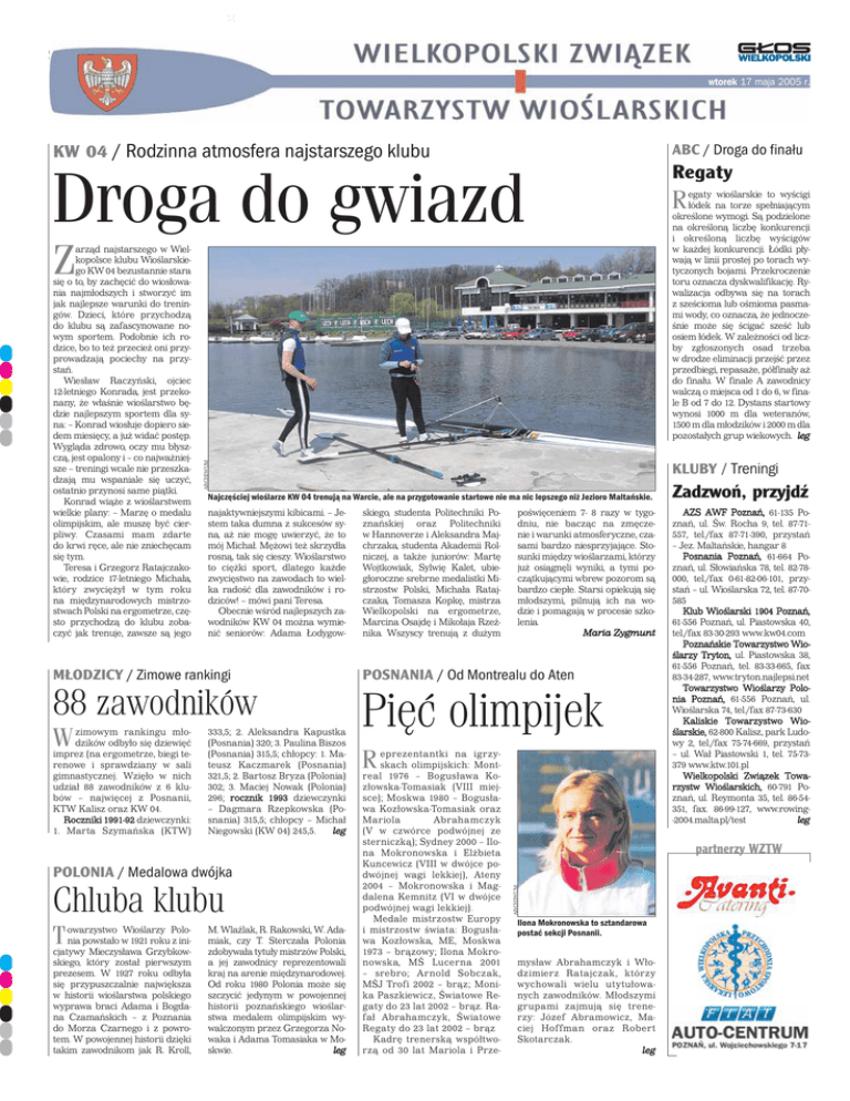 xxxx Głos Wielkopolski środa 15 lutego 2005 r. 1 wtorek 17 maja 2005 r. KW 04 / Rodzinna atmosfera najstarszego klubu ABC / Droga do finału Droga do gwiazd ARCHIWUM Z arząd najstarszego w Wielkopolsce klubu Wioślarskiego KW 04 bezustannie stara się o to, by zachęcić do wiosłowania najmłodszych i stworzyć im jak najlepsze warunki do treningów. Dzieci, które przychodzą do klubu są zafascynowane nowym sportem. Podobnie ich rodzice, bo to też przecież oni przyprowadzają pociechy na przystań. Wiesław Raczyński, ojciec 12-letniego Konrada, jest przekonany, że właśnie wioślarstwo będzie najlepszym sportem dla syna: – Konrad wiosłuje dopiero siedem miesięcy, a już widać postęp. Wygląda zdrowo, oczy mu błyszczą, jest opalony i – co najważniejsze – treningi wcale nie przeszkadzają mu wspaniale się uczyć, ostatnio przynosi same piątki. Konrad wiąże z wioślarstwem wielkie plany: – Marzę o medalu olimpijskim, ale muszę być cierpliwy. Czasami mam zdarte do krwi ręce, ale nie zniechęcam się tym. Teresa i Grzegorz Ratajczakowie, rodzice 17-letniego Michała, który zwyciężył w tym roku na międzynarodowych mistrzostwach Polski na ergometrze, często przychodzą do klubu zobaczyć jak trenuje, zawsze są jego skiego, studenta Politechniki Poznańskiej oraz Politechniki w Hannoverze i Aleksandra Majchrzaka, studenta Akademii Rolniczej, a także juniorów: Martę Wojtkowiak, Sylwię Kalet, ubiegłoroczne srebrne medalistki Mistrzostw Polski, Michała Ratajczaka, Tomasza Kopkę, mistrza Wielkopolski na ergometrze, Marcina Osajdę i Mikołaja Rzeźnika. Wszyscy trenują z dużym poświęceniem 7- 8 razy w tygodniu, nie bacząc na zmęczenie i warunki atmosferyczne, czasami bardzo niesprzyjające. Stosunki między wioślarzami, którzy już osiągnęli wyniki, a tymi początkującymi wbrew pozorom są bardzo ciepłe. Starsi opiekują się młodszymi, pilnują ich na wodzie i pomagają w procesie szkolenia. Maria Zygmunt MŁODZICY / Zimowe rankingi POSNANIA / Od Montrealu do Aten 88 zawodników Pięć olimpijek 333,5; 2. Aleksandra Kapustka (Posnania) 320; 3. Paulina Biszos (Posnania) 315,5; chłopcy: 1. Mateusz Kaczmarek (Posnania) 321,5; 2. Bartosz Bryza (Polonia) 302; 3. Maciej Nowak (Polonia) 296; rocznik 1993 dziewczynki – Dagmara Rzepkowska (Posnania) 315,5; chłopcy – Michał leg Niegowski (KW 04) 245,5. POLONIA / Medalowa dwójka Chluba klubu T owarzystwo Wioślarzy Polonia powstało w 1921 roku z inicjatywy Mieczysława Grzybkowskiego, który został pierwszym prezesem. W 1927 roku odbyła się przypuszczalnie największa w historii wioślarstwa polskiego wyprawa braci Adama i Bogdana Czamańskich – z Poznania do Morza Czarnego i z powrotem. W powojennej historii dzięki takim zawodnikom jak R. Kroll, M. Wlaźlak, R. Rakowski, W. Adamiak, czy T. Sterczała Polonia zdobywała tytuły mistrzów Polski, a jej zawodnicy reprezentowali kraj na arenie międzynarodowej. Od roku 1980 Polonia może się szczycić jedynym w powojennej historii poznańskiego wioślarstwa medalem olimpijskim wywalczonym przez Grzegorza Nowaka i Adama Tomasiaka w Moleg skwie. R eprezentantki na igrzyskach olimpijskich: Montreal 1976 – Bogusława Kozłowska-Tomasiak (VIII miejsce); Moskwa 1980 – Bogusława Kozłowska-Tomasiak oraz Mariola Abrahamczyk (V w czwórce podwójnej ze sterniczką); Sydney 2000 – Ilona Mokronowska i Elżbieta Kuncewicz (VIII w dwójce podwójnej wagi lekkiej), Ateny 2004 – Mokronowska i Magdalena Kemnitz (VI w dwójce podwójnej wagi lekkiej). Medale mistrzostw Europy i mistrzostw świata: Bogusława Kozłowska, ME, Moskwa 1973 – brązowy; Ilona Mokronowska, MŚ Lucerna 2001 – srebro; Arnold Sobczak, MŚJ Trofi 2002 – brąz; Monika Paszkiewicz, Światowe Regaty do 23 lat 2002 – brąz. Rafał Abrahamczyk, Światowe Regaty do 23 lat 2002 – brąz Kadrę trenerską współtworzą od 30 lat Mariola i Prze- egaty wioślarskie to wyścigi łódek na torze spełniającym określone wymogi. Są podzielone na określoną liczbę konkurencji i określoną liczbę wyścigów w każdej konkurencji. Łódki pływają w linii prostej po torach wytyczonych bojami. Przekroczenie toru oznacza dyskwalifikację. Rywalizacja odbywa się na torach z sześcioma lub ośmioma pasmami wody, co oznacza, że jednocześnie może się ścigać sześć lub osiem łódek. W zależności od liczby zgłoszonych osad trzeba w drodze eliminacji przejść przez przedbiegi, repasaże, półfinały aż do finału. W finale A zawodnicy walczą o miejsca od 1 do 6, w finale B od 7 do 12. Dystans startowy wynosi 1000 m dla weteranów, 1500 m dla młodzików i 2000 m dla pozostałych grup wiekowych. leg Zadzwoń, przyjdź AZS AWF Poznań, 61-135 Poznań, ul. Św. Rocha 9, tel. 87-71557, tel./fax 87-71-390, przystań – Jez. Maltańskie, hangar 8 Posnania Poznań, 61-664 Poznań, ul. Słowiańska 78, tel. 82-78000, tel./fax 0-61-82-06-101, przystań – ul. Wioślarska 72, tel. 87-70585 Klub Wioślarski 1904 Poznań, 61-556 Poznań, ul. Piastowska 40, tel./fax 83-30-293 www.kw04.com Poznańskie Towarzystwo Wioślarzy Tryton, ul. Piastowska 38, 61-556 Poznań, tel. 83-33-665, fax 83-34-287, www.tryton.najlepsi.net Towarzystwo Wioślarzy Polonia Poznań, 61-556 Poznań, ul. Wioślarska 74, tel./fax 87-73-630 Kaliskie Towarzystwo Wioślarskie, 62-800 Kalisz, park Ludowy 2, tel./fax 75-74-669, przystań – ul. Wał Piastowski 1, tel. 75-73379 www.ktw.101.pl Wielkopolski Związek Towarzystw Wioślarskich, 60-791 Poznań, ul. Reymonta 35, tel. 86-54351, fax. 86-99-127, www.rowingleg -2004.malta.pl/test partnerzy WZTW ARCHIWUM W zimowym rankingu młodzików odbyło się dziewięć imprez (na ergometrze, biegi terenowe i sprawdziany w sali gimnastycznej. Wzięło w nich udział 88 zawodników z 6 klubów – najwięcej z Posnanii, KTW Kalisz oraz KW 04. Roczniki 1991-92 dziewczynki: 1. Marta Szymańska (KTW) R KLUBY / Treningi Najczęściej wioślarze KW 04 trenują na Warc