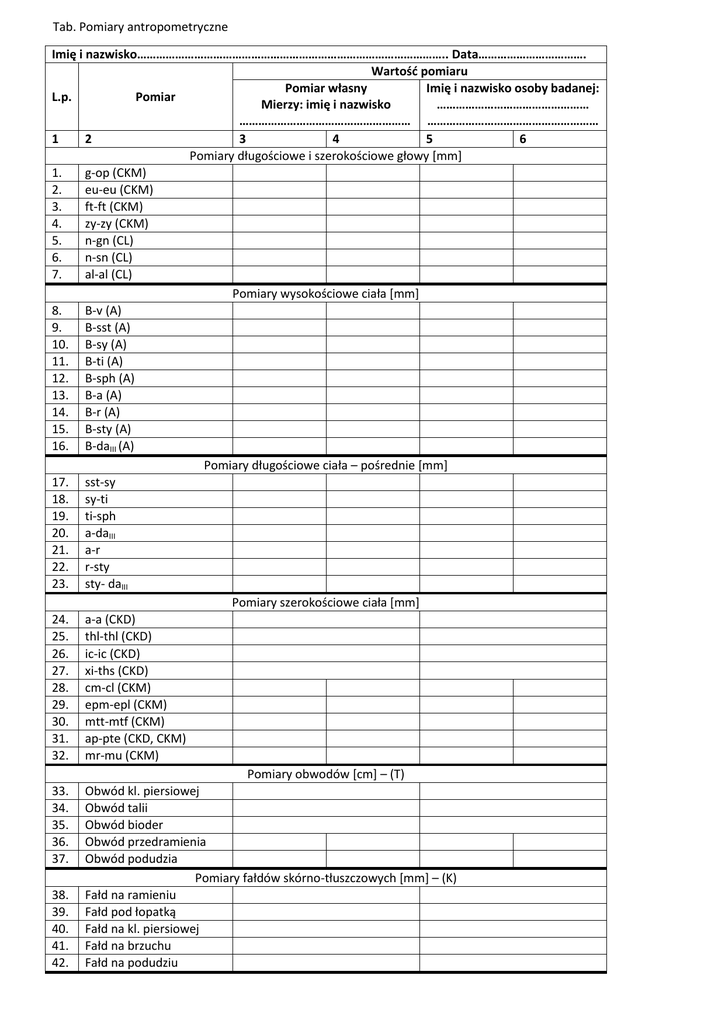 Tab. Pomiary antropometryczne Imię i nazwisko…………………………………………………………………………………….. Data……………………………. Wartość pomiaru Pomiar własny Imię i nazwisko osoby badanej: L.p. Pomiar Mierzy: imię i nazwisko ………………………………………… ……………………………………………… ……………………………………………… 1 2 3 4 5 6 Pomiary długościowe i szerokościowe głowy [mm] 1. g-op (CKM) 2. eu-eu (CKM) 3. ft-ft (CKM) 4. zy-zy (CKM) 5. n-gn (CL) 6. n-sn (CL) 7. al-al (CL) Pomiary wysokościowe ciała [mm] 8. B-v (A) 9. B-sst (A) 10. B-sy (A) 11. B-ti (A) 12. B-sph (A) 13. B-a (A) 14. B-r (A) 15. B-sty (A) 16. B-daIII (A) Pomiary długościowe ciała – pośrednie [mm] 17. sst-sy 18. sy-ti 19. ti-sph 20. a-daIII 21. a-r 22. r-sty 23. sty- daIII Pomiary szerokościowe ciała [mm] 24. a-a (CKD) 25. thl-thl (CKD) 26. ic-ic (CKD) 27. xi-ths (CKD) 28. cm-cl (CKM) 29. epm-epl (CKM) 30. mtt-mtf (CKM) 31. ap-pte (CKD, CKM) 32. mr-mu (CKM) Pomiary obwodów [cm] – (T) 33. Obwód kl. piersiowej 34. Obwód talii 35. Obwód bioder 36. Obwód przedramienia 37. Obwód podudzia Pomiary fałdów skórno-tłuszczowych [mm] – (K) 38. Fałd na ramieniu 39. Fałd pod łopatką 40. Fałd na kl. piersiowej 41. Fałd na brzuchu 42. Fałd na podudziu Oblicz wartości pomiarów pośrednich i wpisz je do tabeli. sst – sy = (B – sst) – (B – sy) = ………..… - ……………. = …………………… a - daIII = ………..… - ……………. = ………..… - ……………. = …………………… a–r = ………..… - ……………. = ………..… - ……………. = …………………… r – sty = ………..… - ……………. = ………..… - ……………. = …………………… sty – daIII = ………..… - ……………. = ………..… - ……………. = …………………… sy – ti = ………..… - ……………. = ………..… - ……………. = …………………… ti – sph = ………..… - ……………. = ………..… - ……………. = ……………………